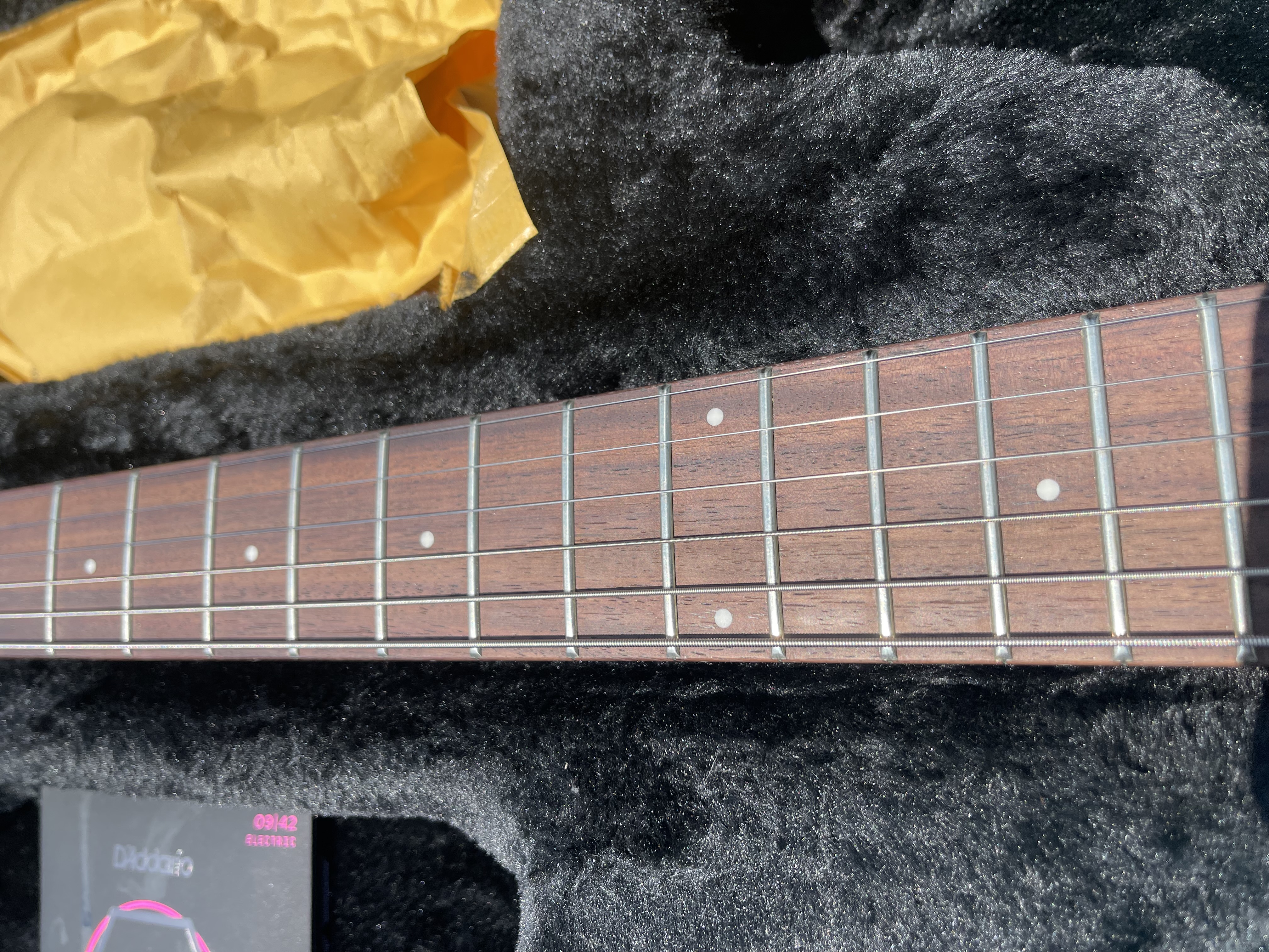 About a year old. Hardly played. Practically new. Really love the guitar but need a 2 humbucker guitar.