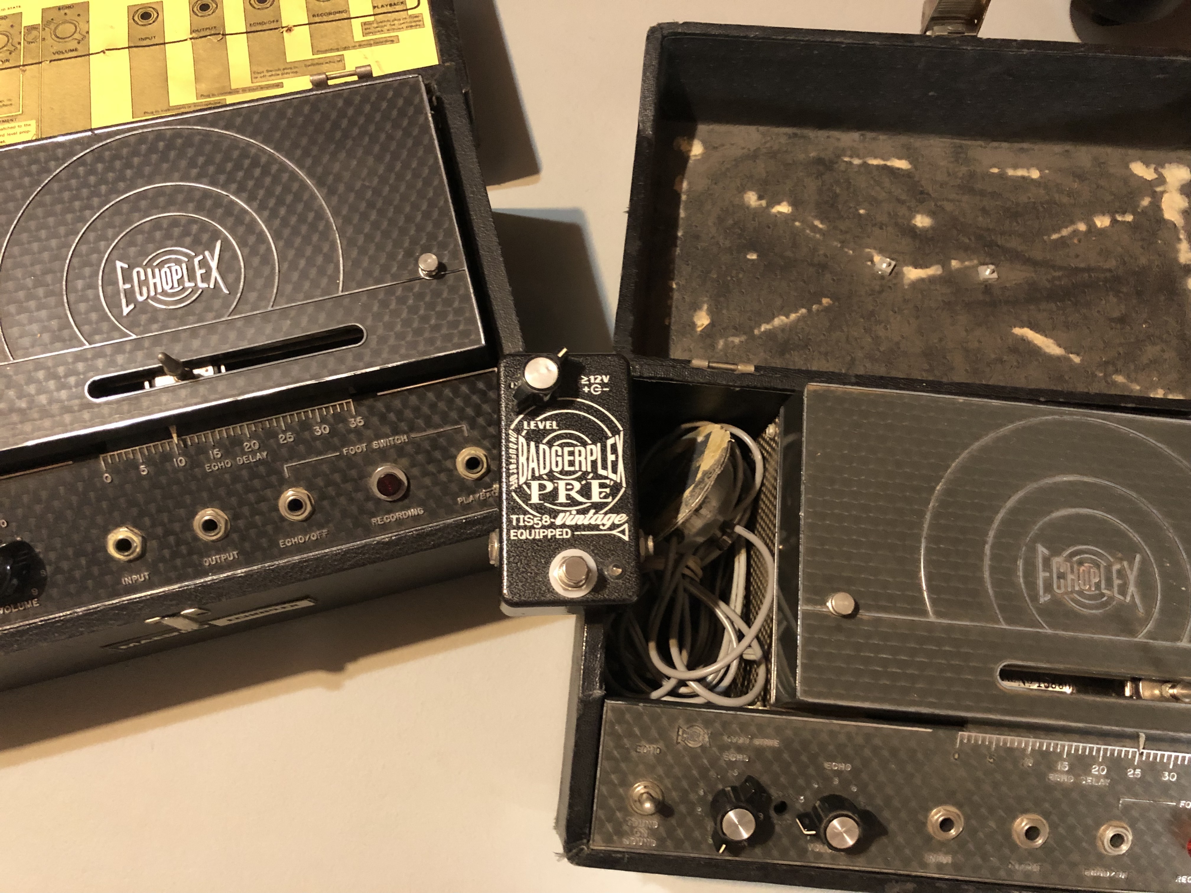 yo bro bro-i had the earlier badgerplex which was cool but it did not do it for me. i remember you posting about this one and wished i had scored this version!Again, I’ve tried them all, both versions of a Chase tone, MXR, Xotic, Clinch, etc. The Badgerplex sounded 99.9% like my EP3 units. It adds a little bit of gain like the echoplex but the biggest thing that set it apart from every other unit on the market was compression. All of those other units, except for the Badgerplex didn’t have the compression of a real echoplex. I did extensive testing as I wanted something to be as close to my original units as possible so I could save wear and tear. Badgerplex was the best. I got mine in 2012 and Robert from Badgerplex updated mine for free and included a few different TIS 58 transistors to tone sculpt a little. The Korean TIS 58 was the winner. A friend even changed his transistor after hearing mine. ?