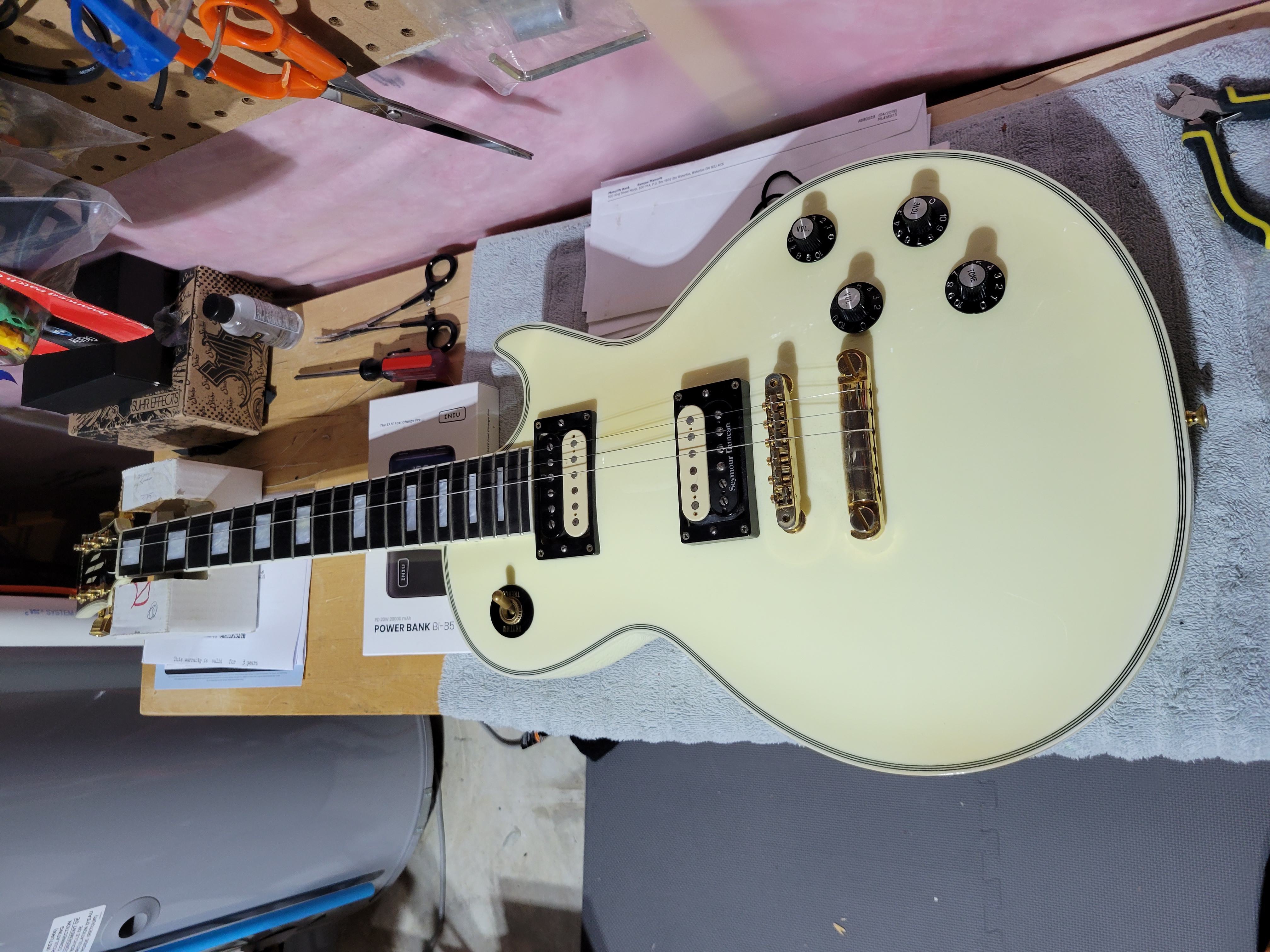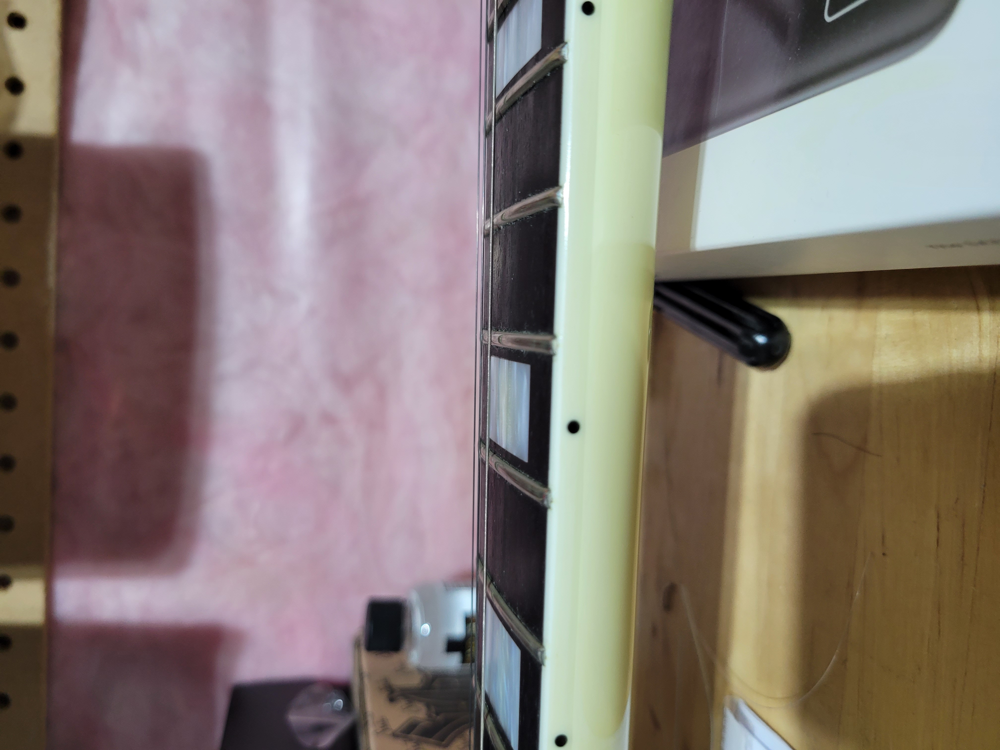 Setup wise I will have to get used to this thing but it is very fast and a breeze to absolutely shred on. I can see where Randy would have liked these types of specs because he wasn't the biggest guy and I find it is a small fretboard over all. I've attached a few pics, let me know if you think there is excessive wear on those frets. I was in the process of changing strings here before polishing fretboard and putting on new ones. Haven't decided if I want to throw some pickup covers on the humbuckers and a black scratch plate to make it an RR style LP. I don't think I want to drill into the body. What do you guys think?