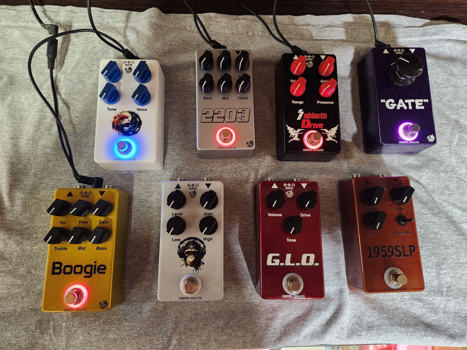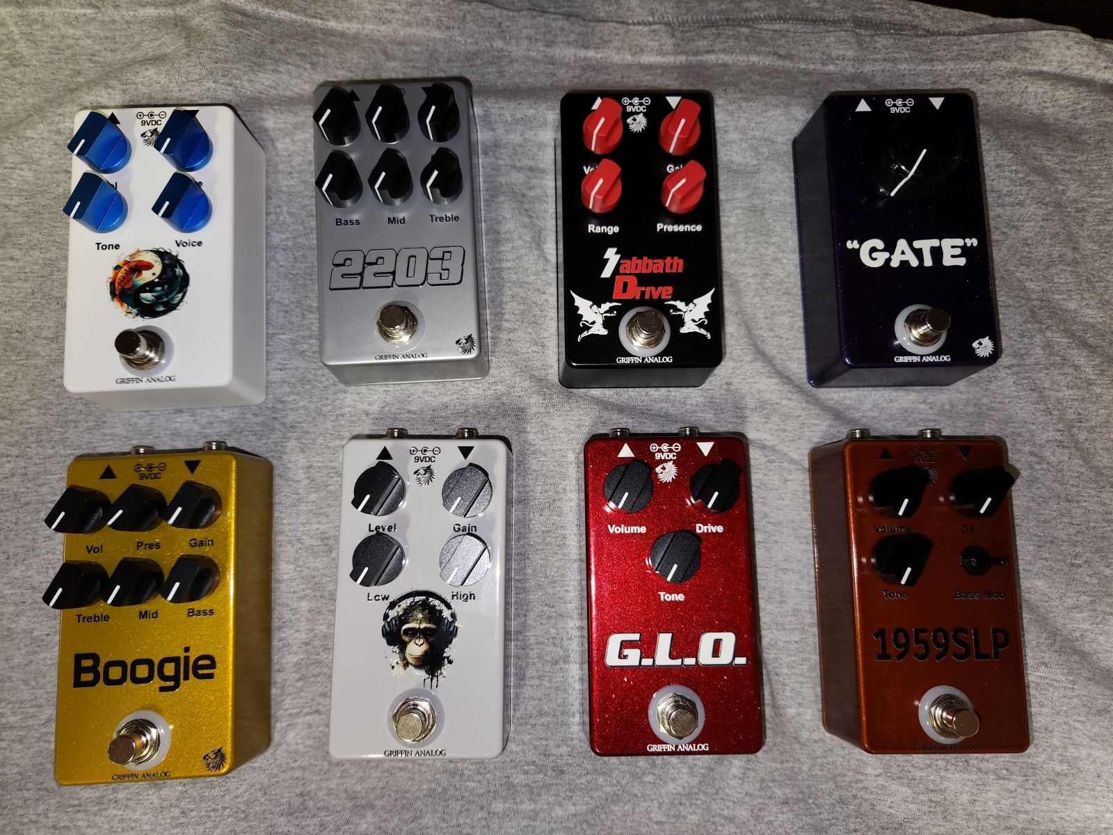 While in the process of testing out pedal combos for some 2 in 1 pedals I plan on doing ..... I needed some more stuff to try ... so I built the following ... which are basically clones other than me upgrading parts and laying out the boards to my own specs . ( and I wanted to check out some of the new candy colored enclosures ) also trying out some aluminum Davies Knobs for the first time ...... I like them .... they are on the Zen , GLO , Monkey and the 1959SLP