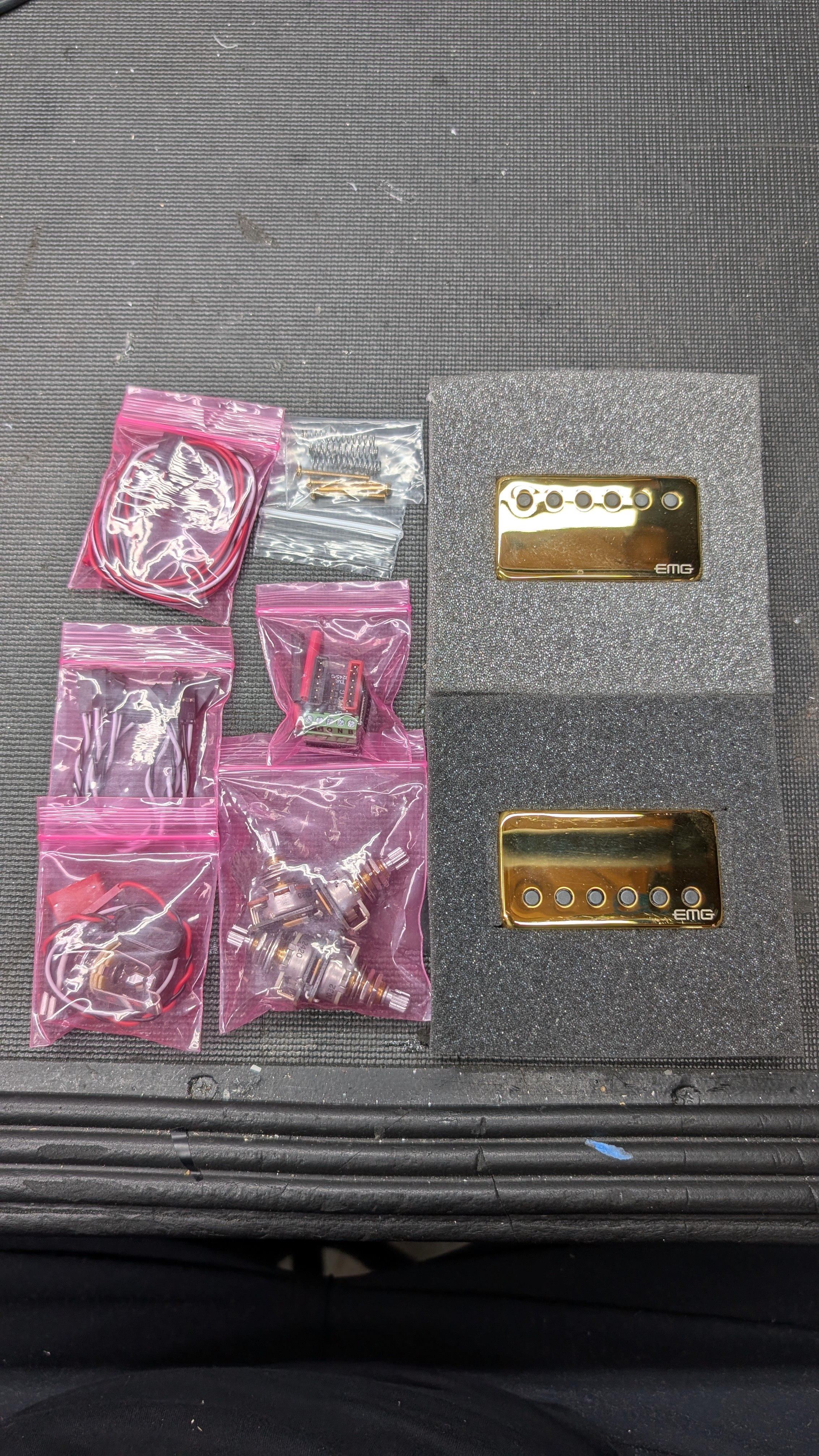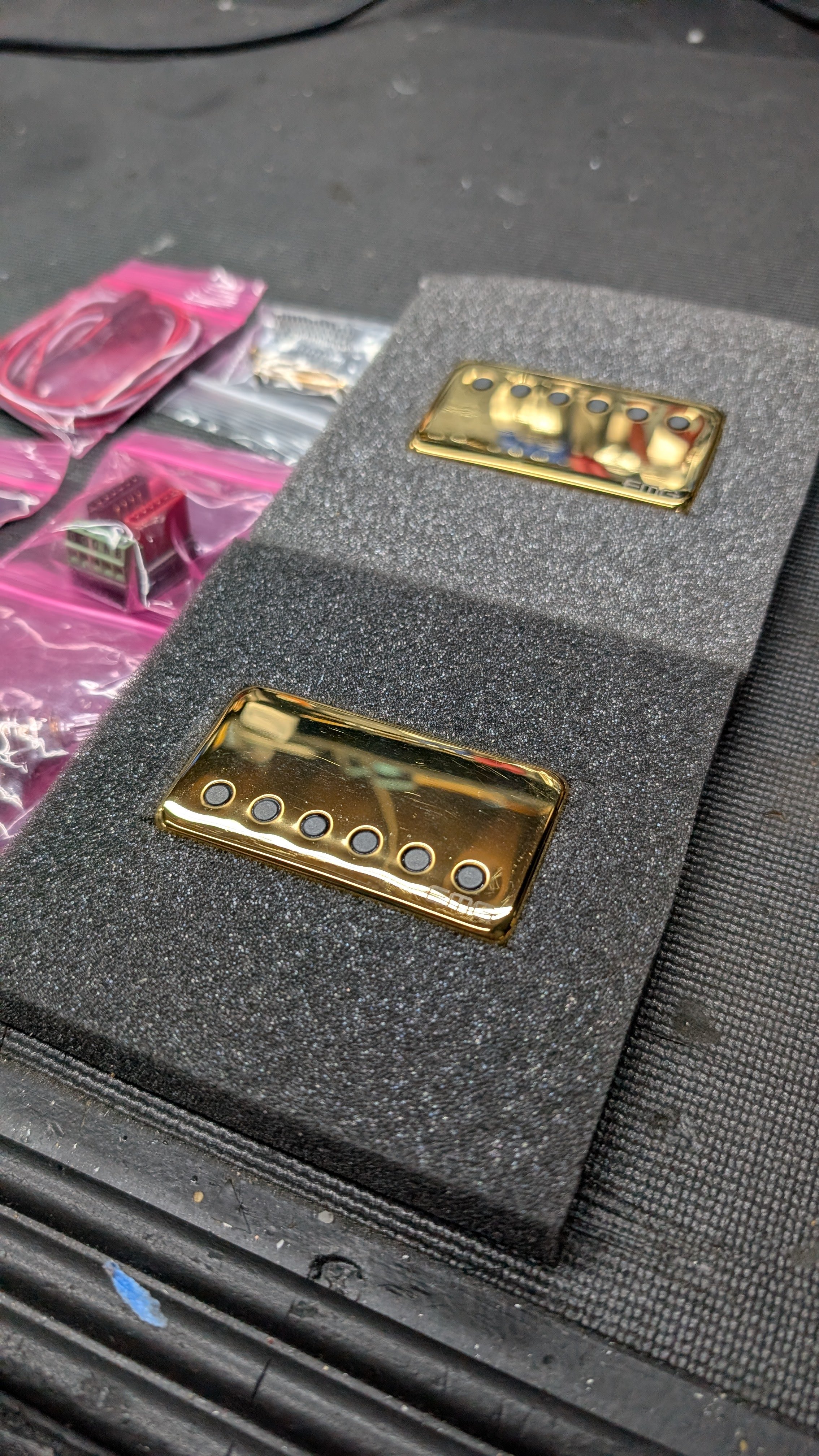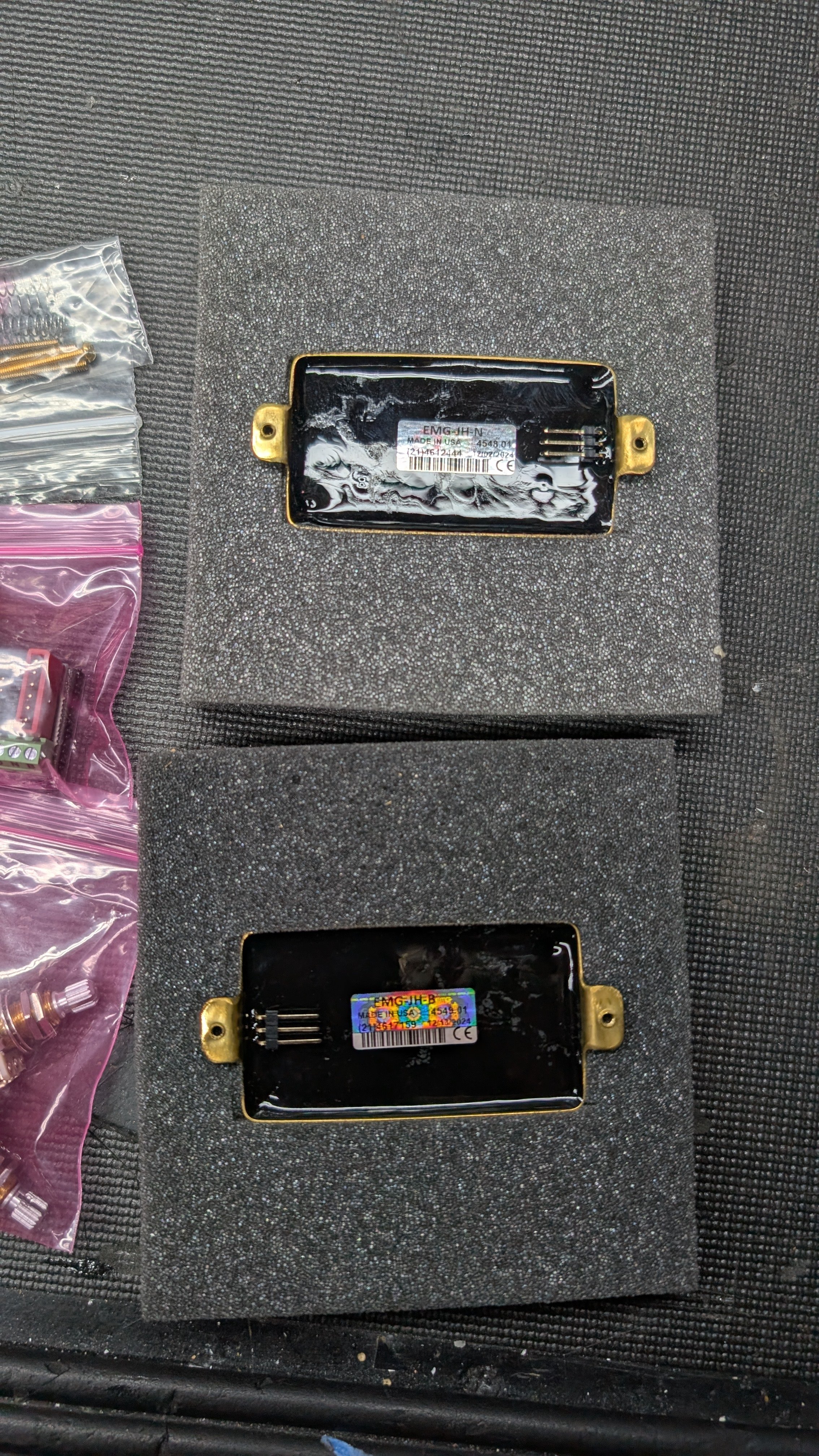 EMG James Hetfield set in gold. It's standard spacing or 49mm. I don't have the original packaging, but I have all the wires, pots, dongles, etc.. This set will get your trousers moving.