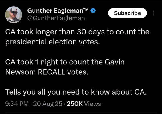 Total BS IMO and there needs to be more transparency into what WokEmperor Newsom does and Socialist Democrats do on elections to disenfranchise Americans