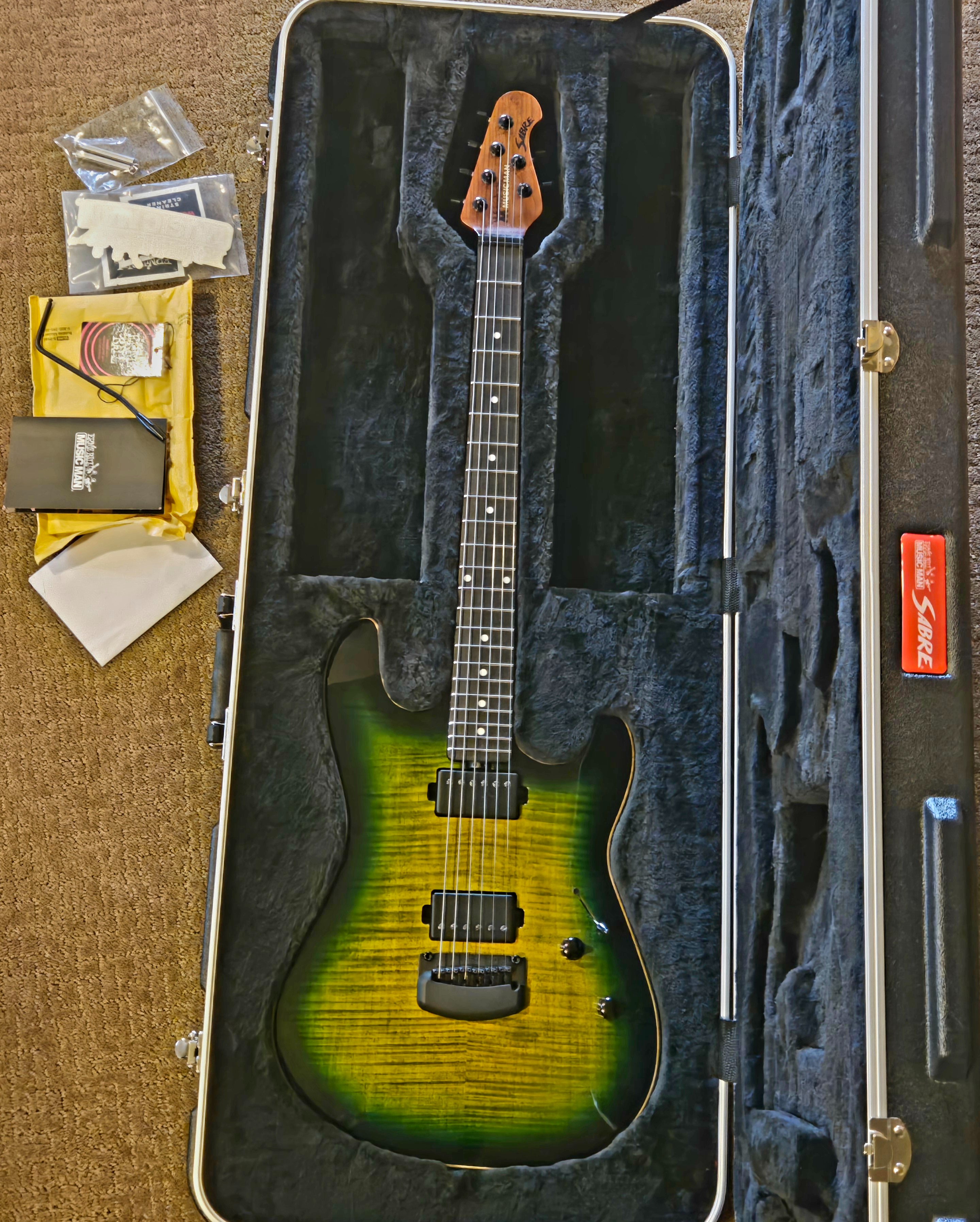 Super mint and still like new with deluxe EBMM Sabre hard case & accessories. Great top and one of the best necks ever.