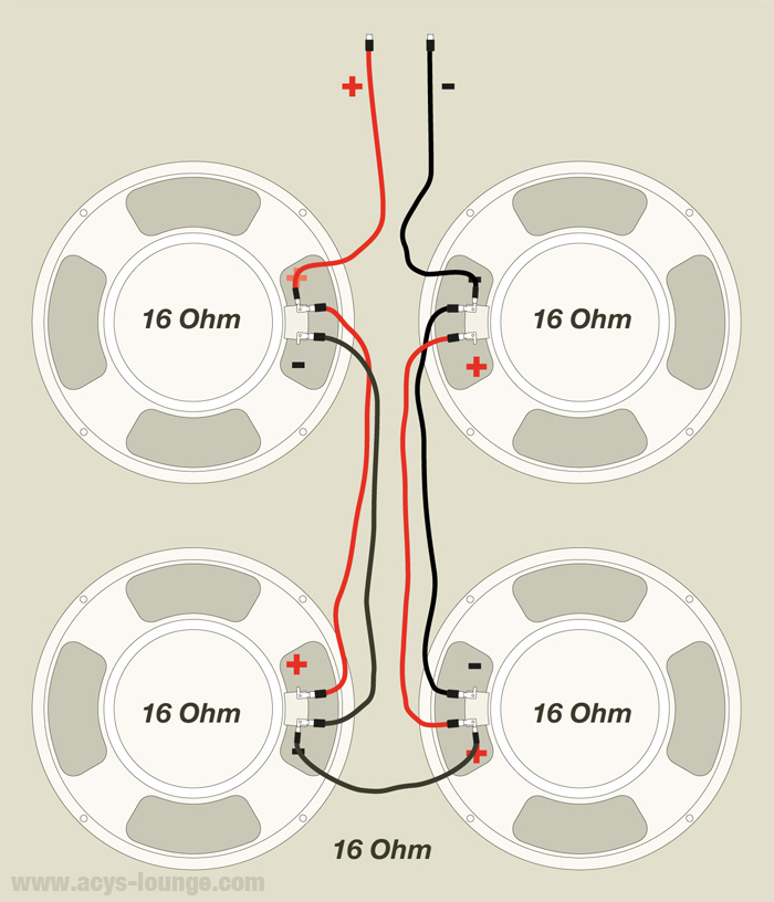 In series-parallel each 1/2 half has the 2 x 16 ohm speakers wired in series for 32. Then when each of those sides (pairs) are wired together in parallel that knocks it back down to 16 ohms. No?