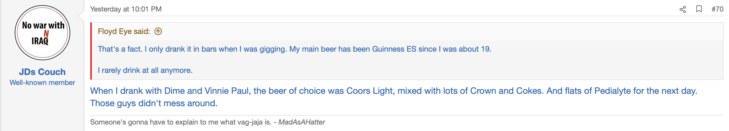 Oh, that was more than 20 years ago. I was a young lad in my 20s... And yes, drinking with Dime and Vinnie Paul on tour was no small matter!You have your own issue douche breath