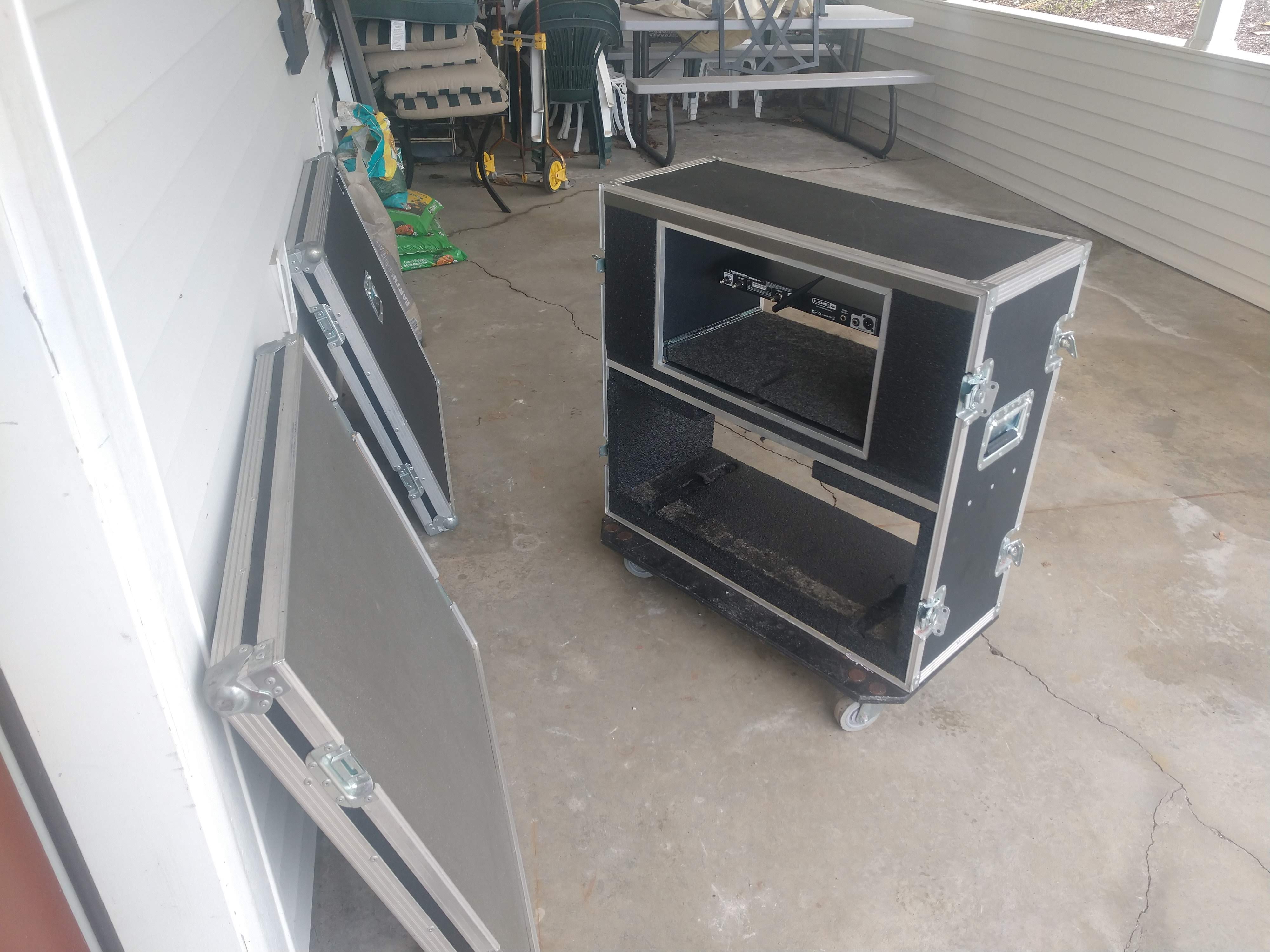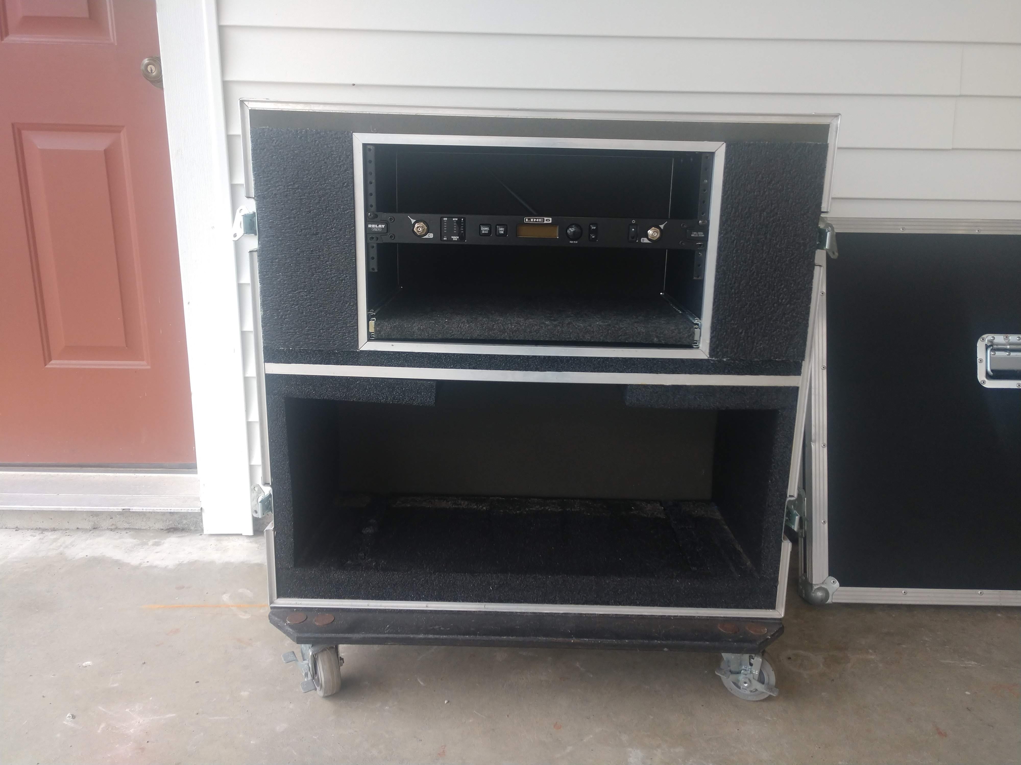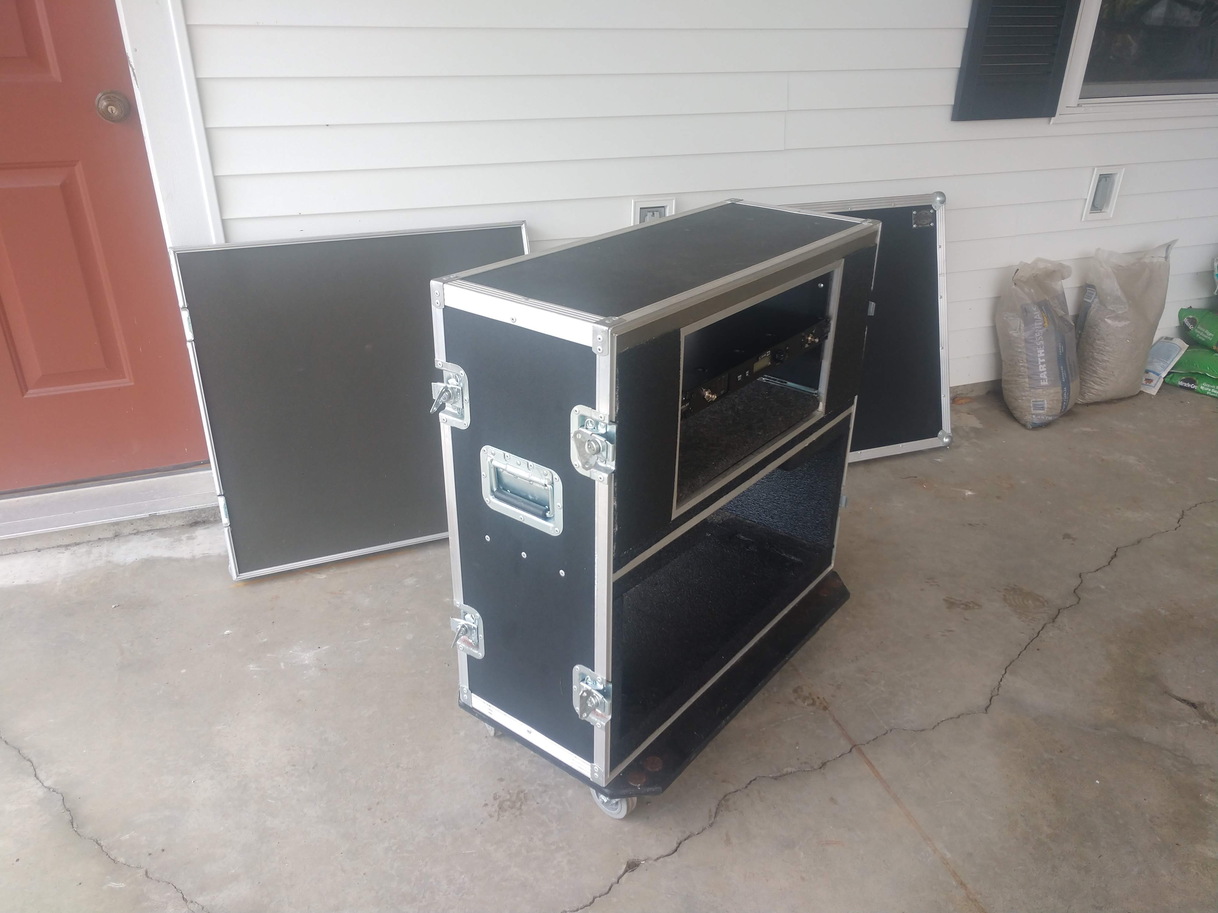 Amp Head + 4 space Rack roadcase, made by Rock Hard Case Co. Pull out sliding shelf for effects pedals, power supply, etc. Bottom foam has a bit of wear but is easily replaceable. $350 buyer pays shipping