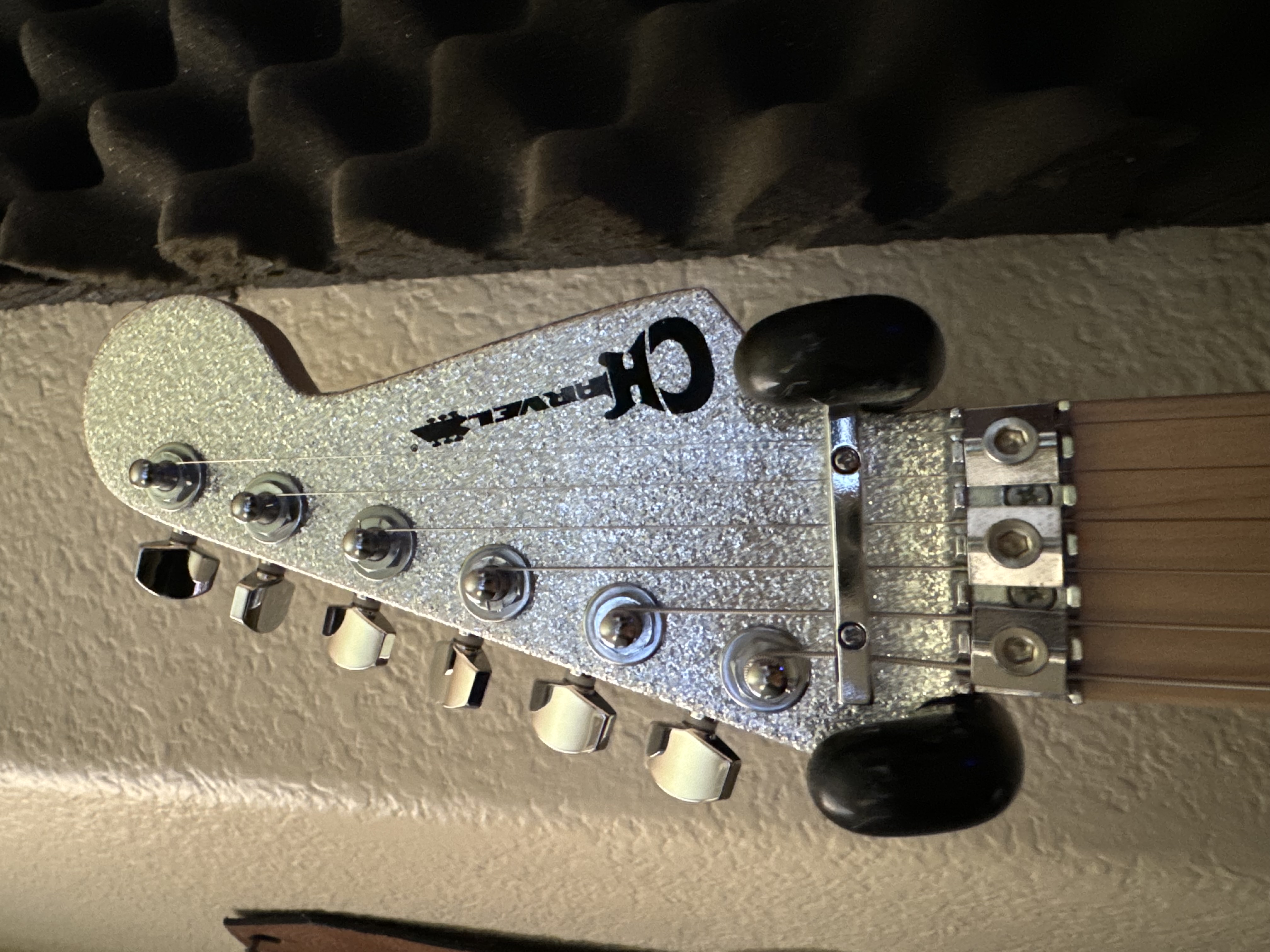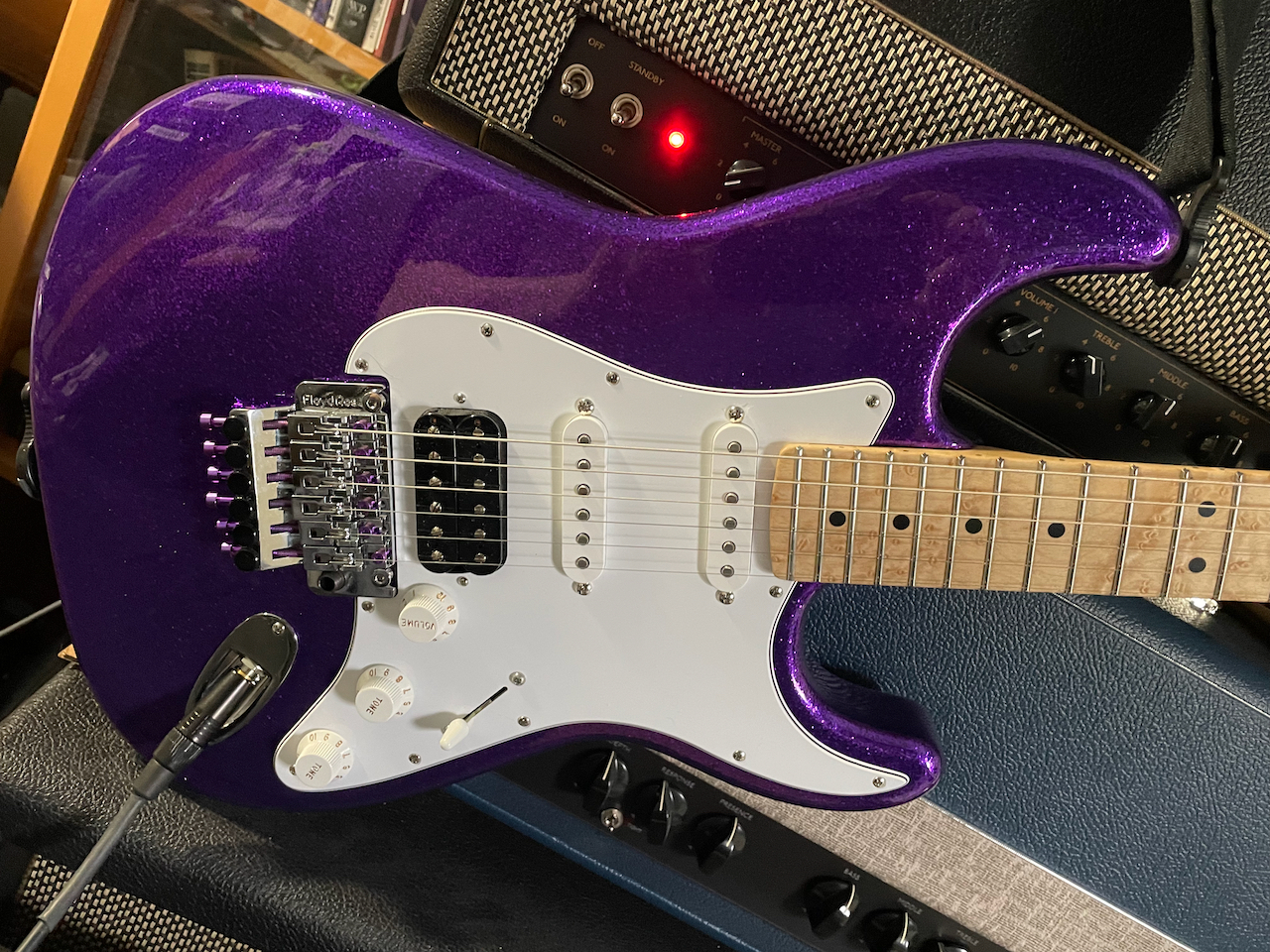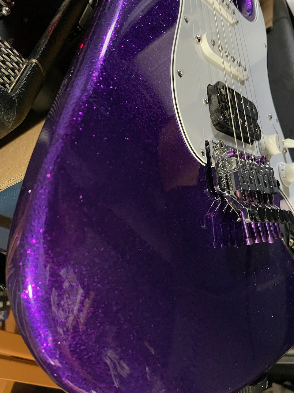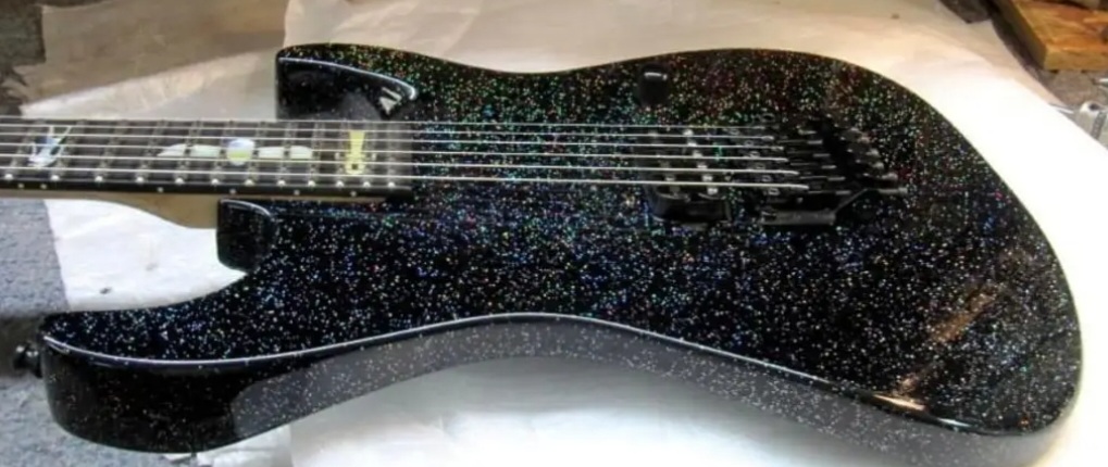 I've been a bit obsessed with large metal flake the past couple years. A canadian guitar repair shop refinished this old US Jackson Fusion in large flake gold. I'm a terrible camera person but it looks incredible in real life and on stage.