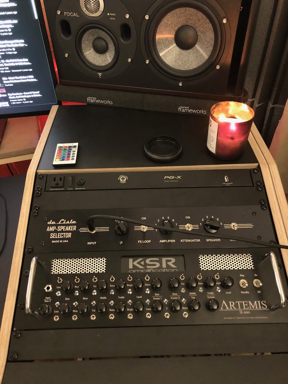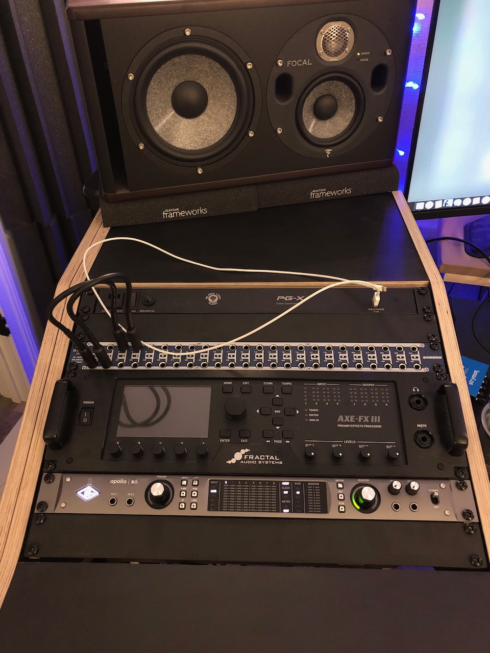 Guitar -> Pedal board (EQ, OD's) -> DeLisle -> 6 amp inputs -> 6 Amp outs -> DeLisle -> 2 Reactive Loads (and CAB M+) -> Patch Bay -> Time based effects (Source Audio EQ2, H9, Strymon pedals on the desk) -> Apollo -> Focal Studio Monitors.