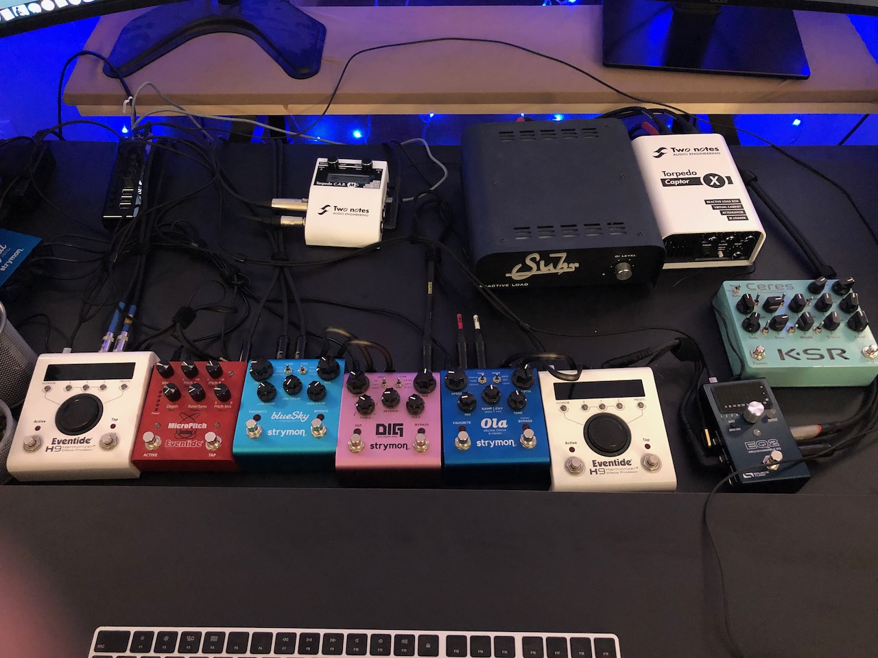 So I can use the same Pedal board frontend into any of the amps or the Ceres, choose between the Suhr RL or the Captor X (or skip the Loads and go directly to a CAB M+ for the Ceres and future preamp type pedals) and through the patchbay have any of it go through the same Time based effects.