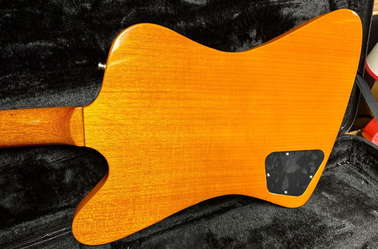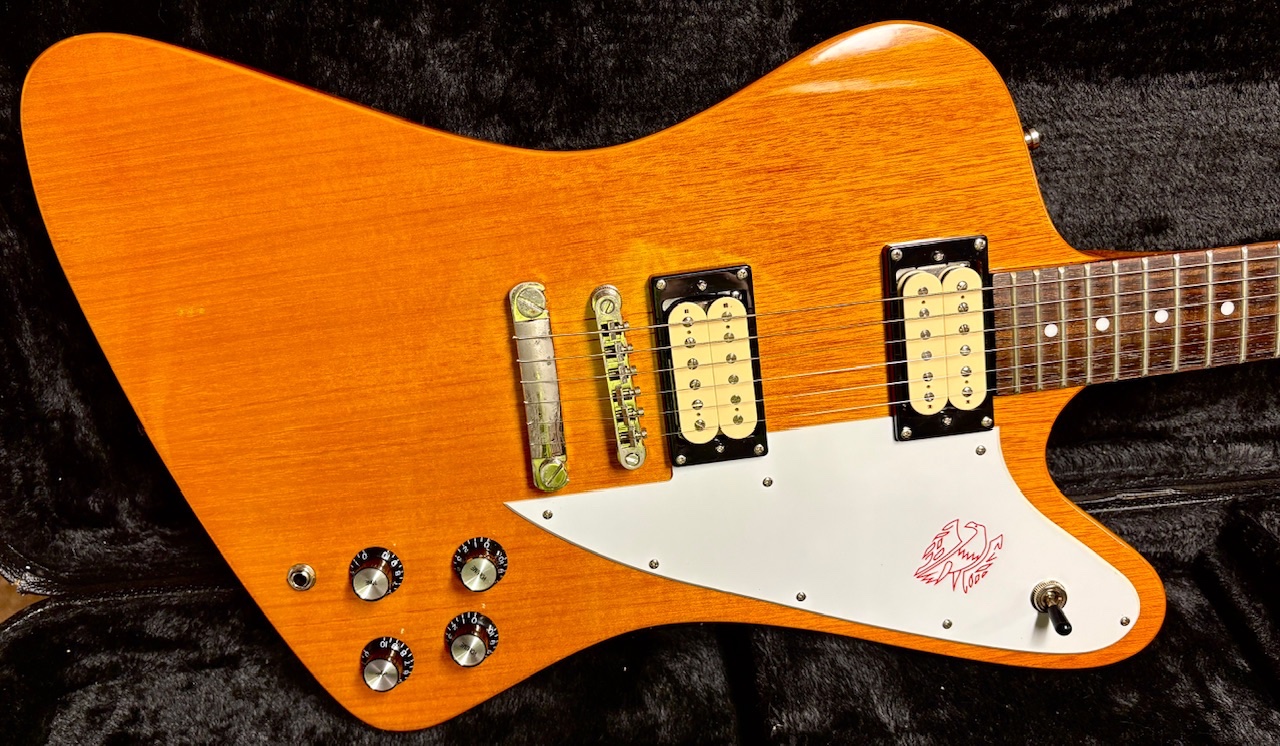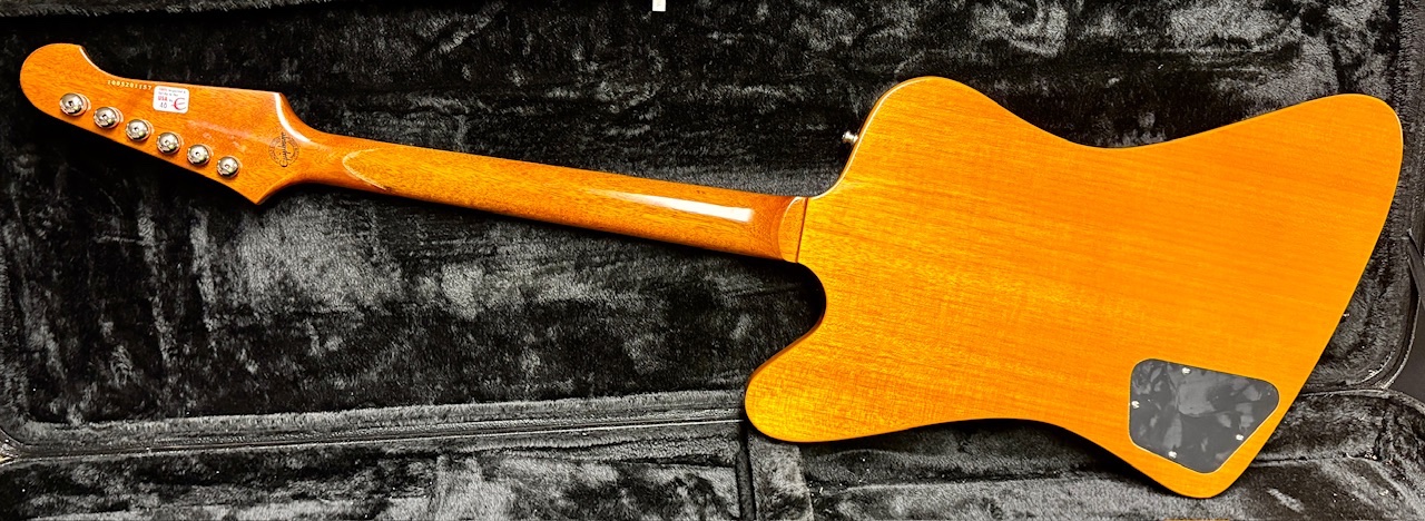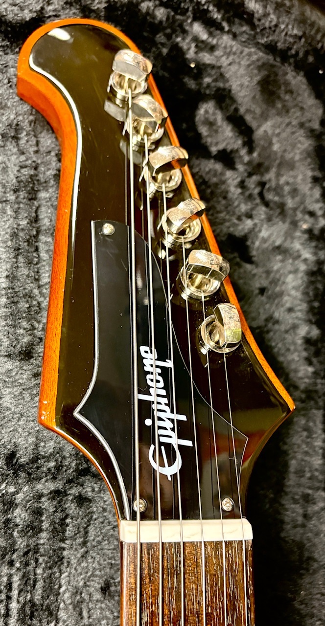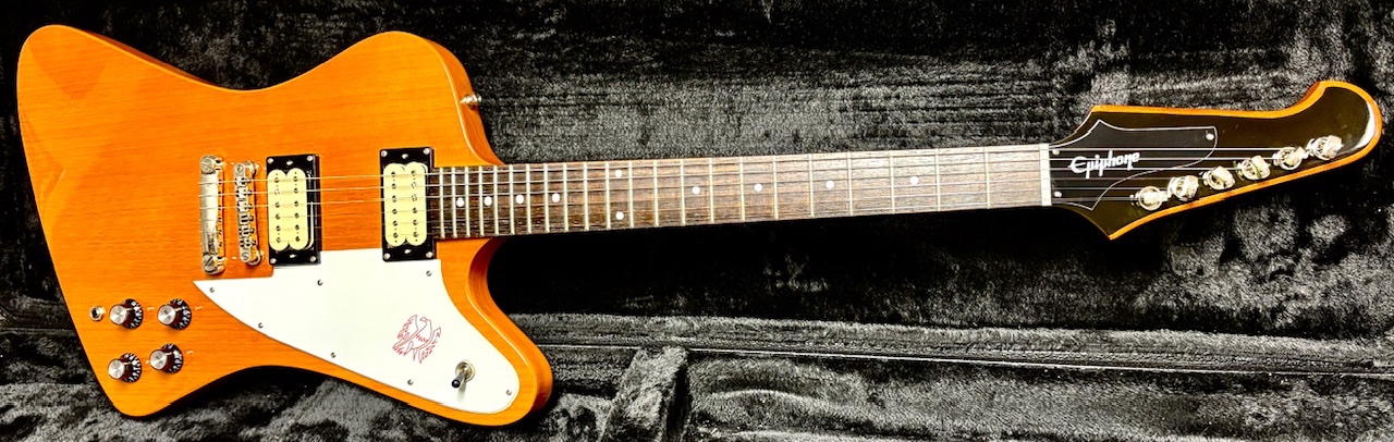 It’s an Epiphone “korina” Firebird. It’s a Limited Edition, Custom Shop model, according to the back of the headstock.