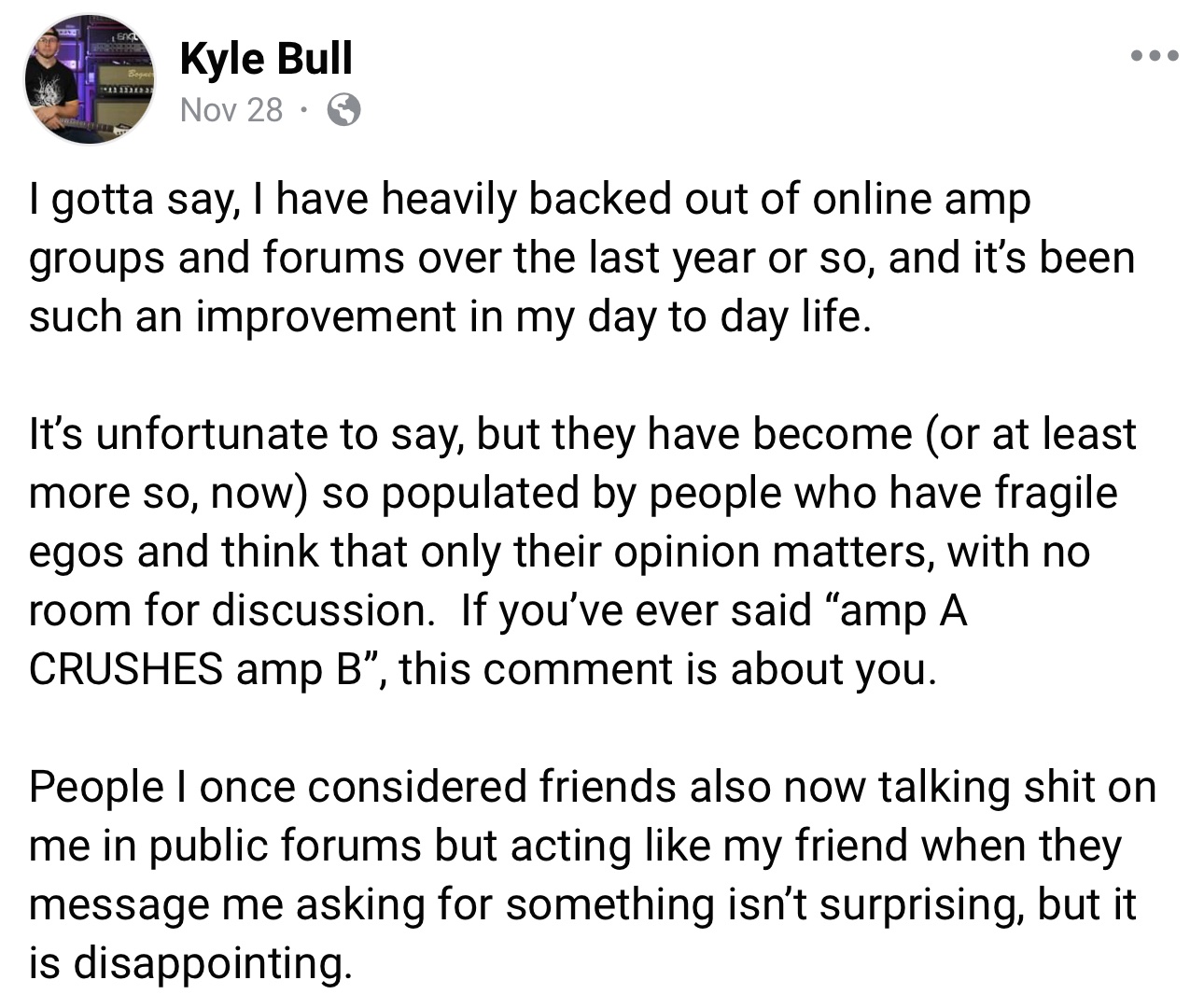 That doesn’t give you a right to bash me anonymously on Facebook and on a gear forum then confirm you did in fact single me out in both cases. I’ll talk shit about any amp I please for whatever reason I please. I welcome anyone to tell me whether any recordings I make sound like ass as long as it’s constructive and I can learn from it. You crossed a line dude and probably lost a lot of respect trying to save face in the process. You carry a lot of weight in gear reviewing, and to disagree with someone is one thing, but to claim a disagreement on the amps sound “is talking shit about you pretending to be your friend to your face and bashing you behind your back” is not only a giant lie but gaslighting and just sickening. What did I ever do to deserve those comments?