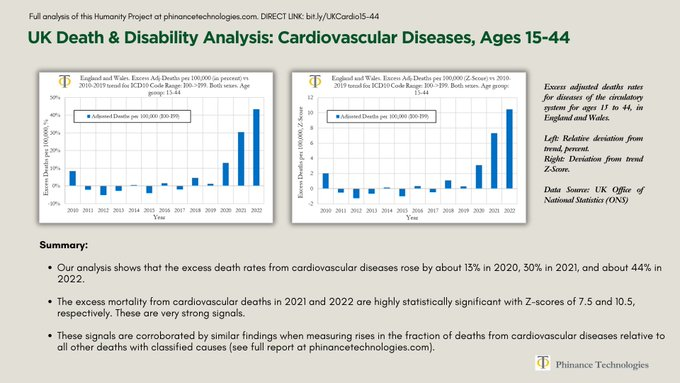 Using official government data for deaths in England and Wales between 2010 and 2022, former BlackRock portfolio manager Ed Dowd and his partners at Phinance Technologies found that excess death rates from cardiovascular diseases were up 13% in 2020, 30% in 2021, and 44% in 2022, which "point to a worrying picture of an even greater acceleration in coming years of deaths & disabilities."