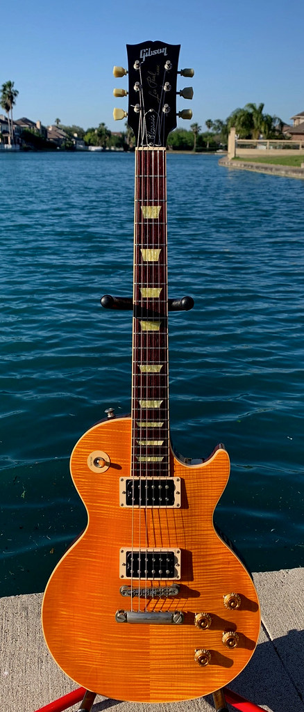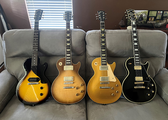 From L to R: 2023 Les Paul Jr., 2005 Les Paul Standard, 2001 Les Paul Classic, 2003 Les Paul Custom Shop R7 Custom