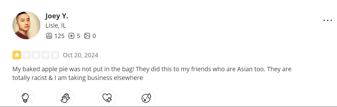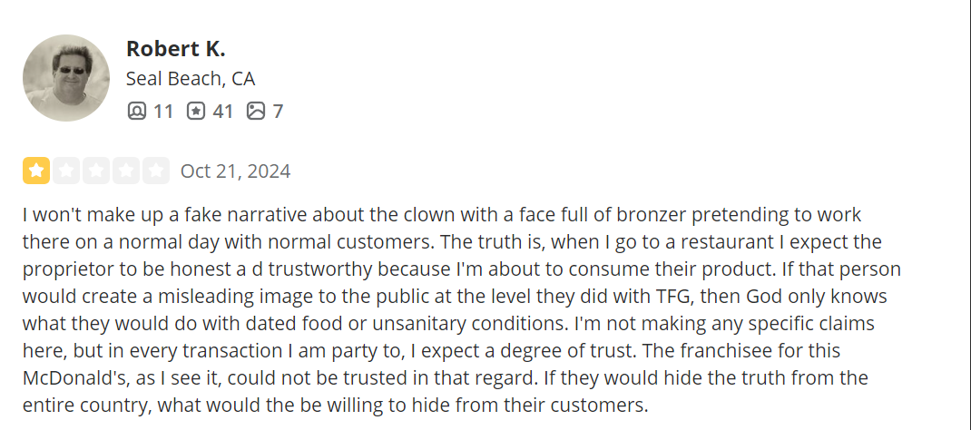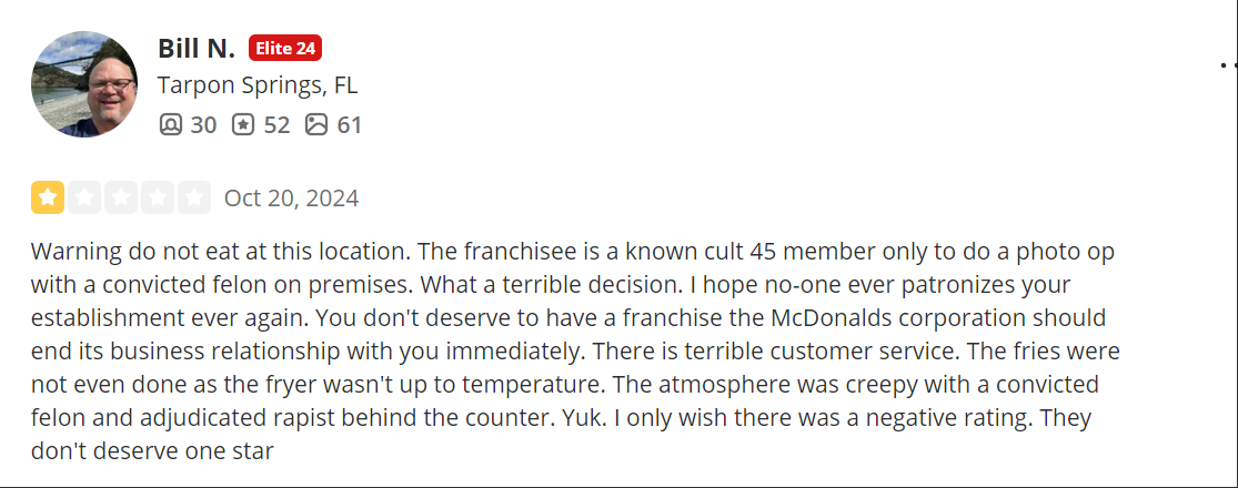 shit-ville Dan will now try contacting all those guys online for secks.Libshits are review bombing the McDonalds Trump was at