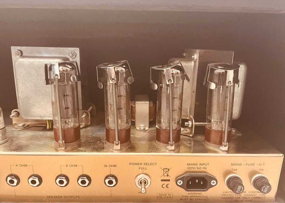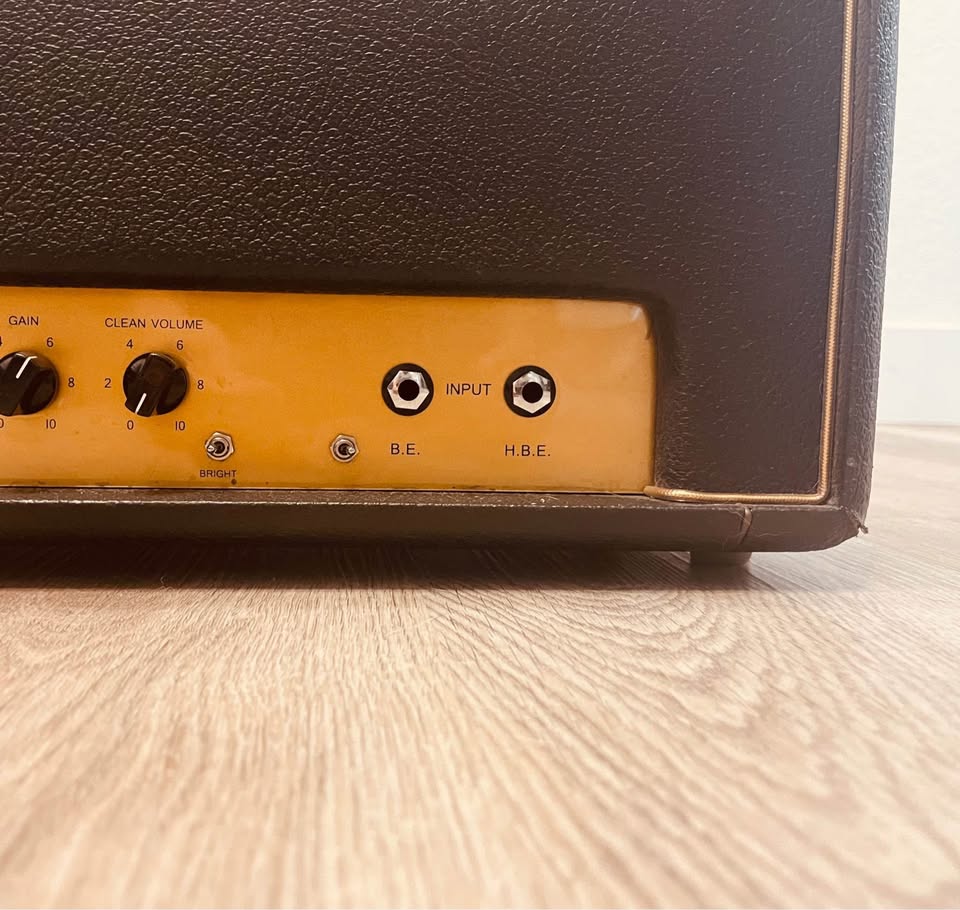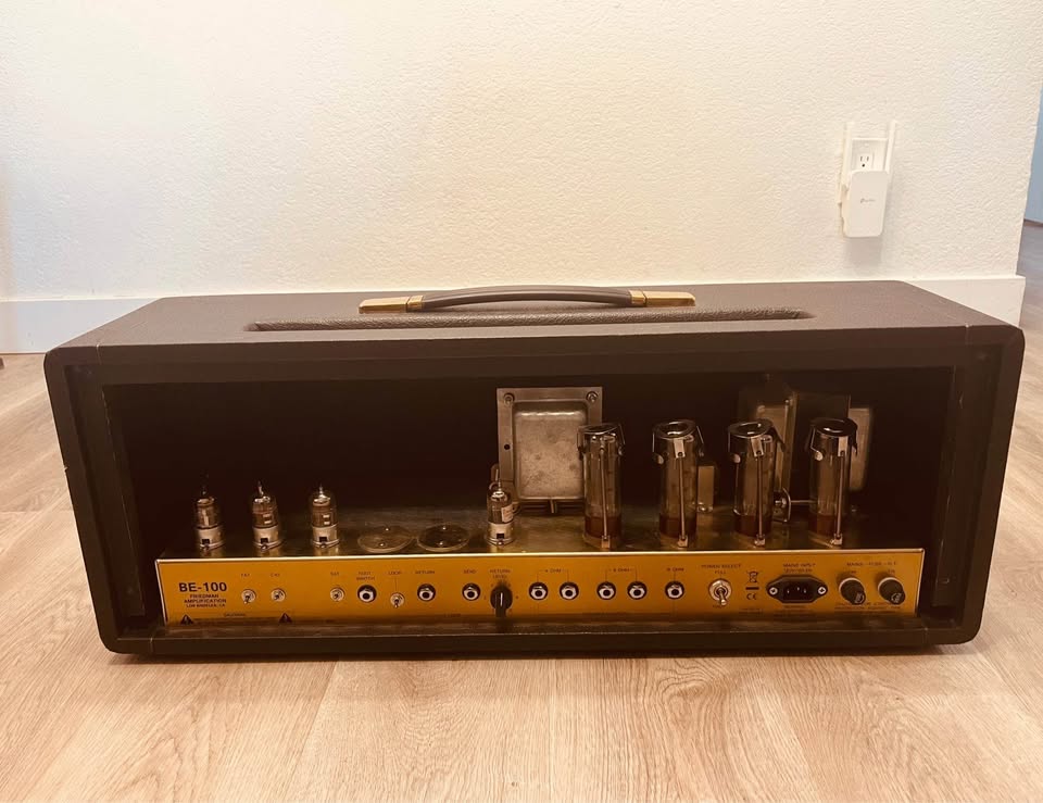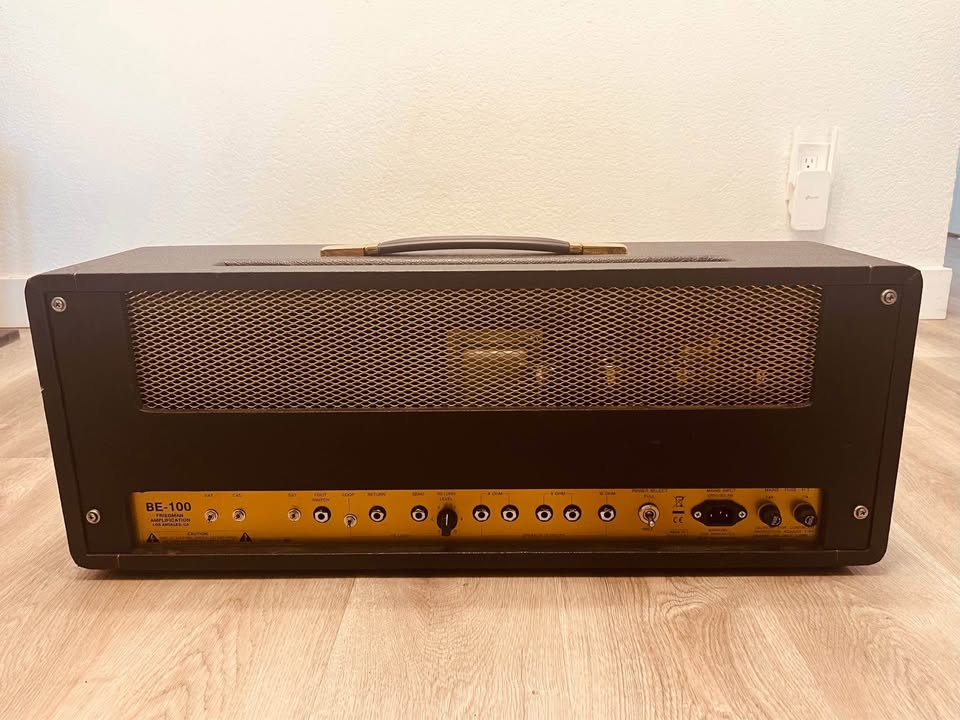 This has the red turret board he used. The power section is loaded with Winged C el34 power tubes I have a newer production run Be 100 and this 2 input version is more open and raw to my ear. This reminds me more of a Marshall than the newer Be 100. These early BE 100s also had a 50/100 watt switch. There is some wear on the Tolex but no major damage or significant tears or rips. This will come with a one button channel switching footswitch and power cable