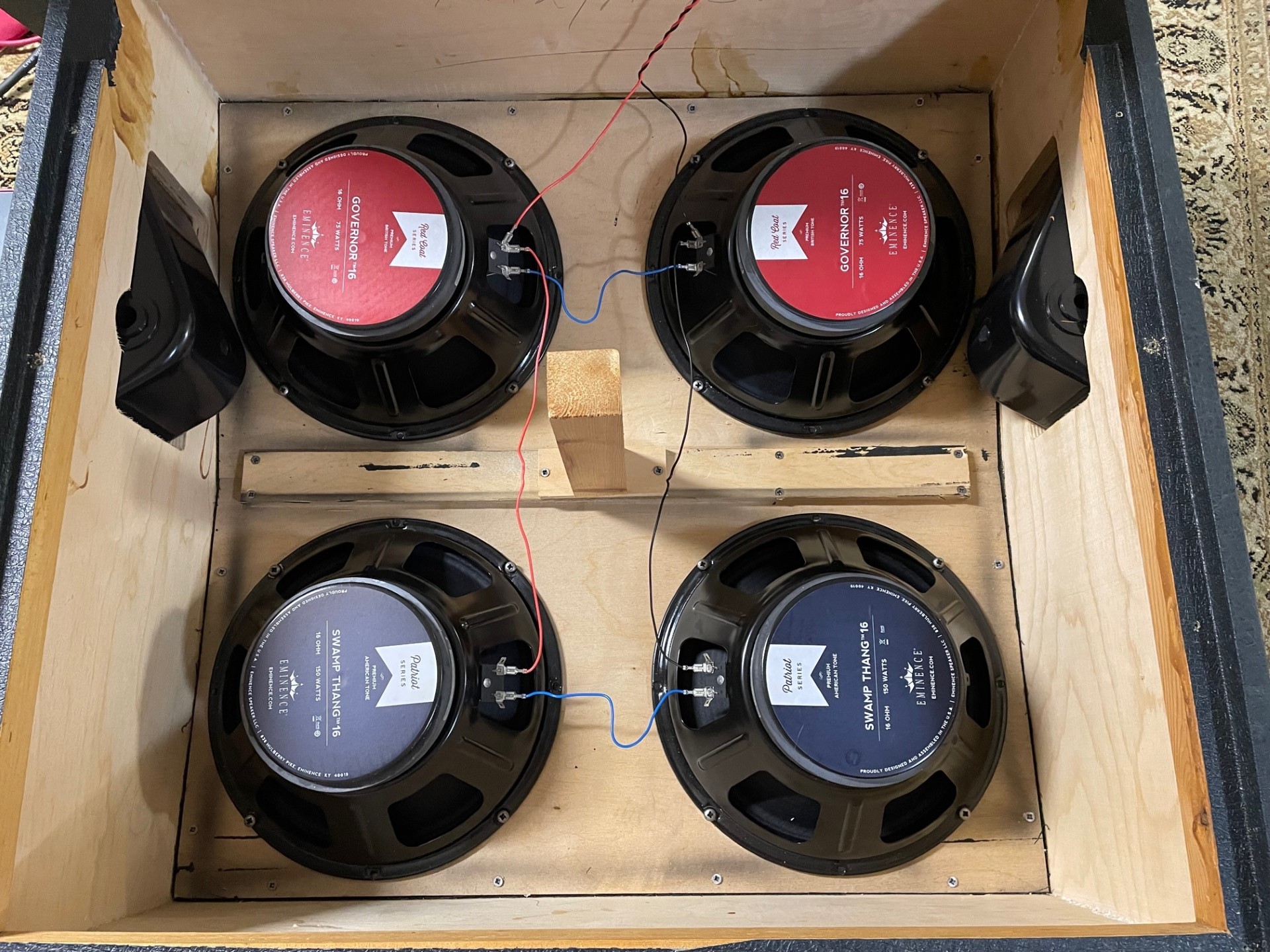 Hello, I have a Marshall JCM800 A cab for sale. Based on the markings inside, it was built between 1986-1988. I was not a fan of the G12-T75 speakers, so they were upgraded with a quad of US Eminence Governors and Swamp Thangs which sound fantastic for rock and metal.