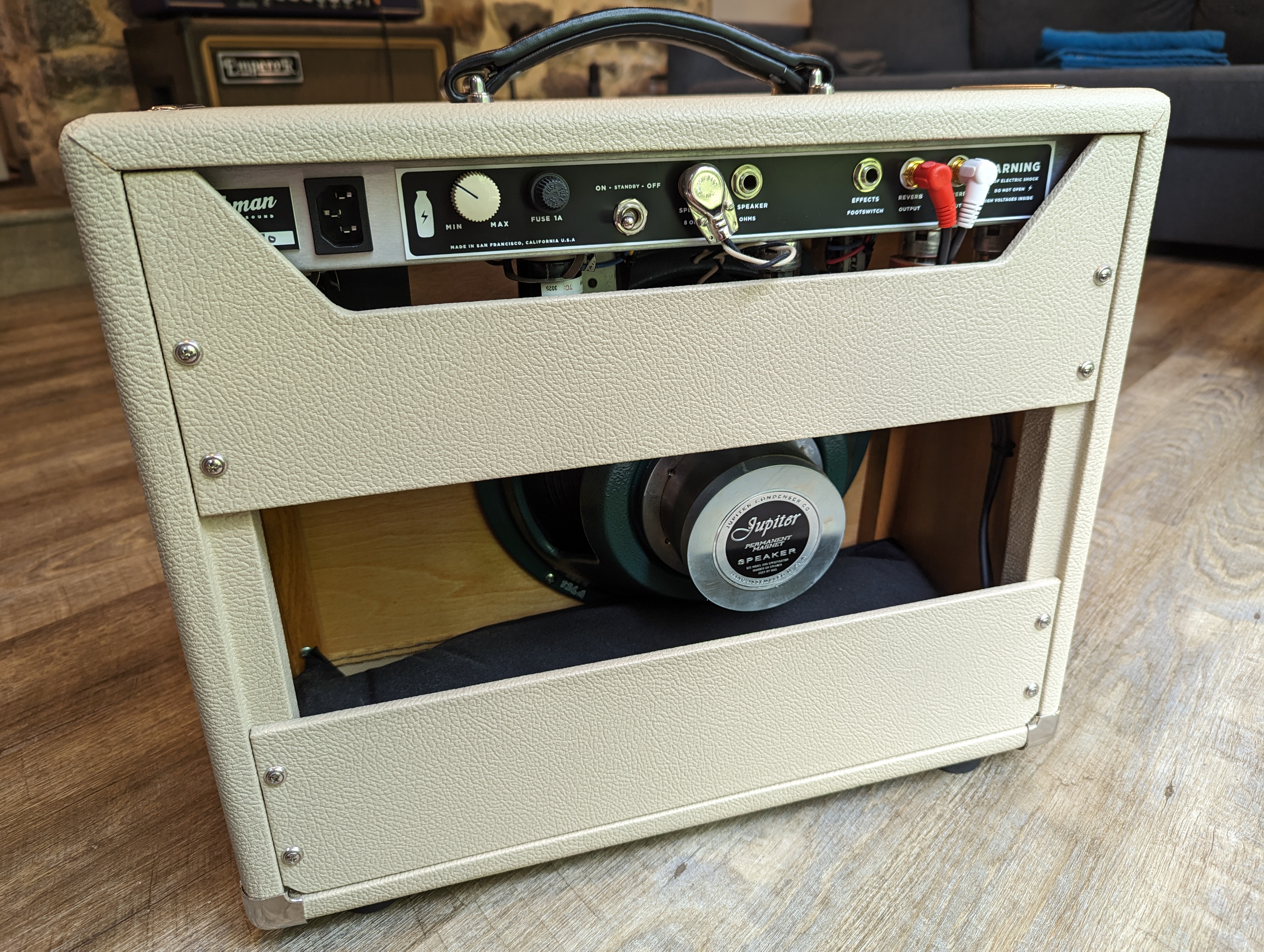 Jupiter Alnico 12" has a classic American alnico magnet sound. A bit less transparent in the upper midrange, this speaker adds a "woody" tone. Its lively on top, and a bit more focused in the bass response than the Greenback. The speaker starts to break up and add alnico character as the amp is pushed. Its the most efficient of the 3 speaker options.