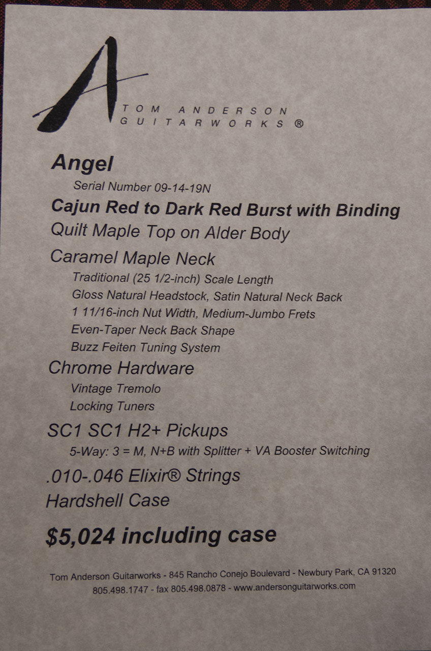 Selling my 2019 Tom Anderson Angel. Another great player! The finish is very hard to photograph, if it appears dark it is because it is a dark finish... I did use a white balance card and photoshop to try and get the color right. I bought this new from my local Anderson dealer. The guitar includes the OHCS and guitar/case candy. I will only ship to the US48. I'm not interested in trades. I will accept paypal gift, free shipping. Price: $3600