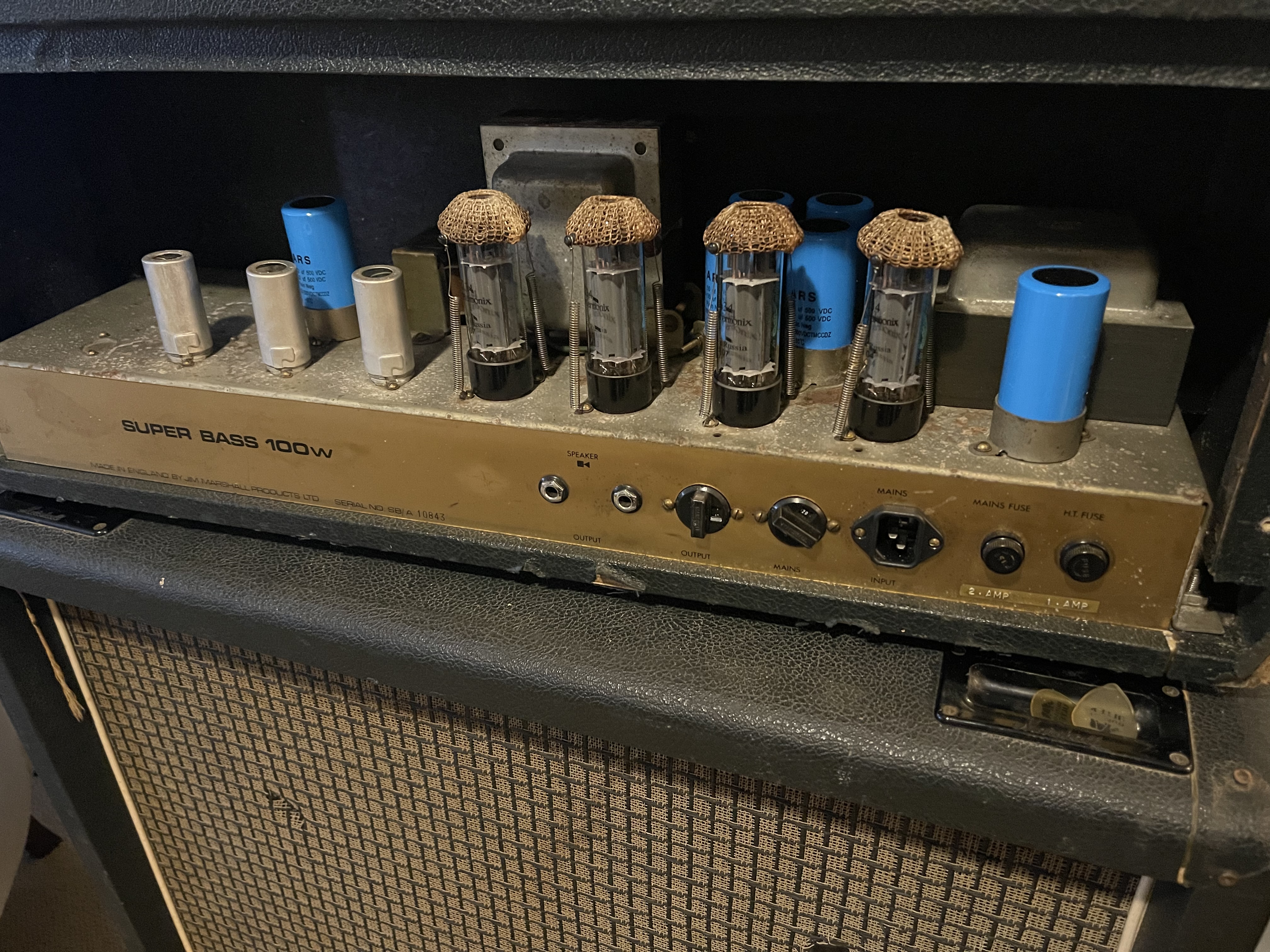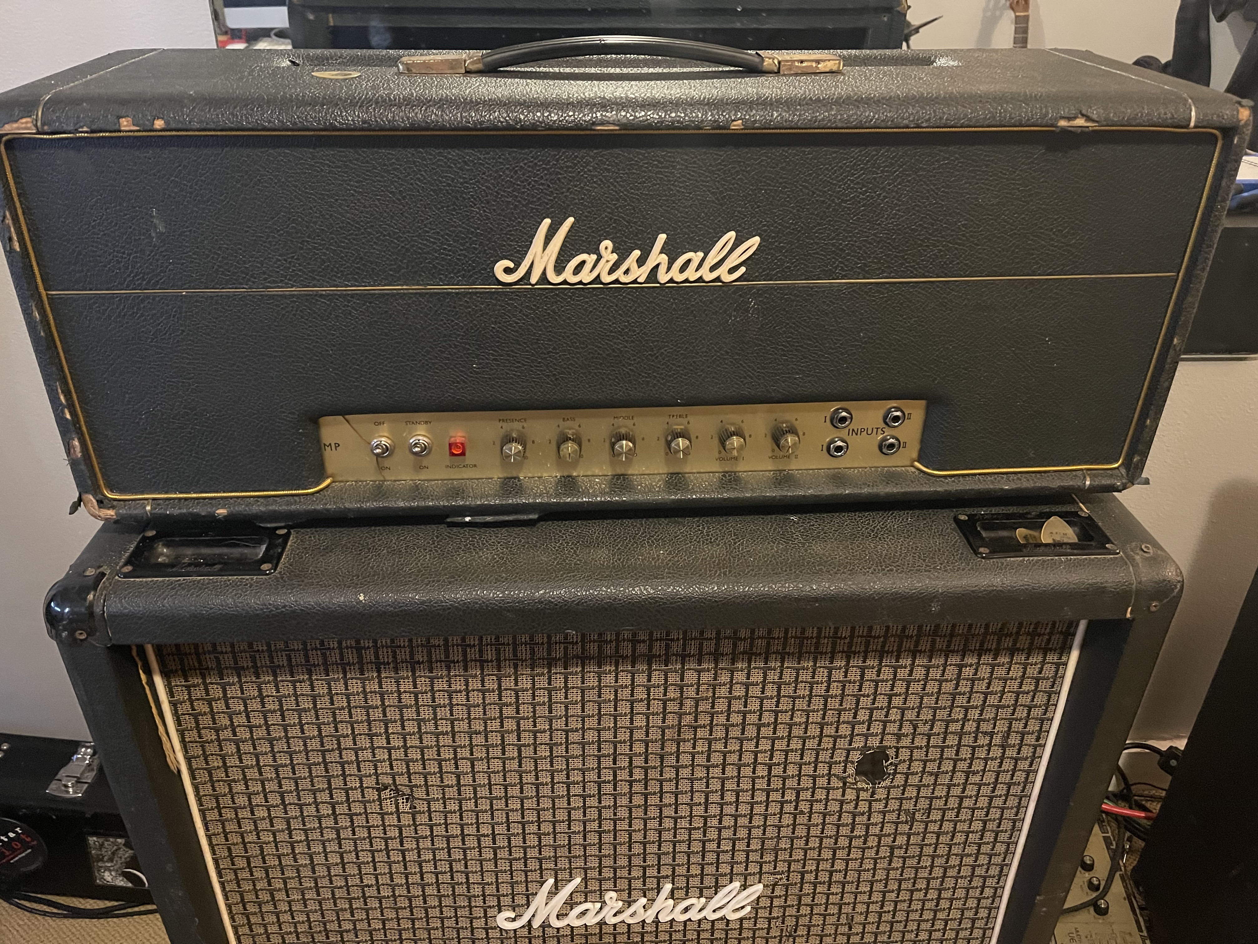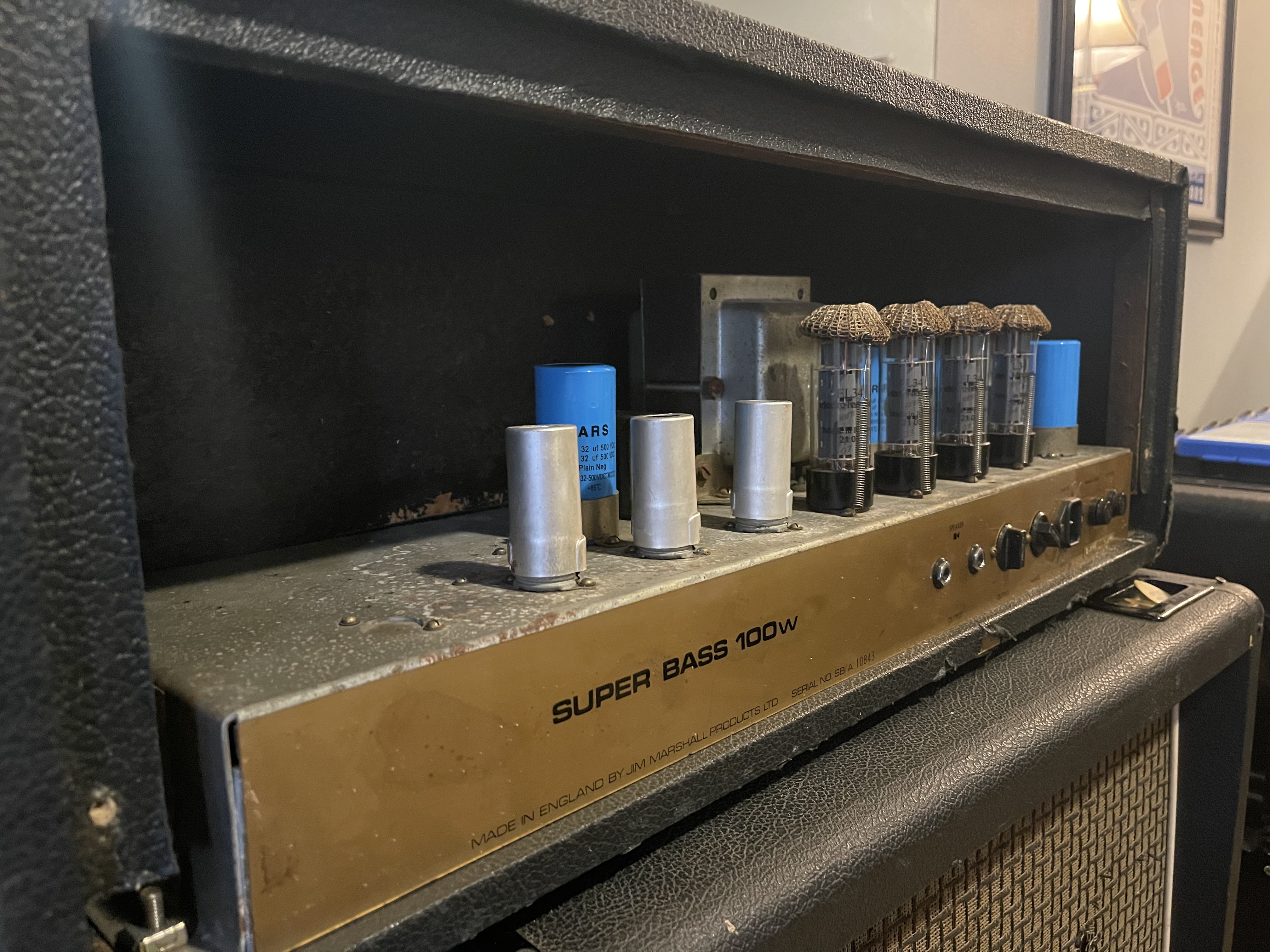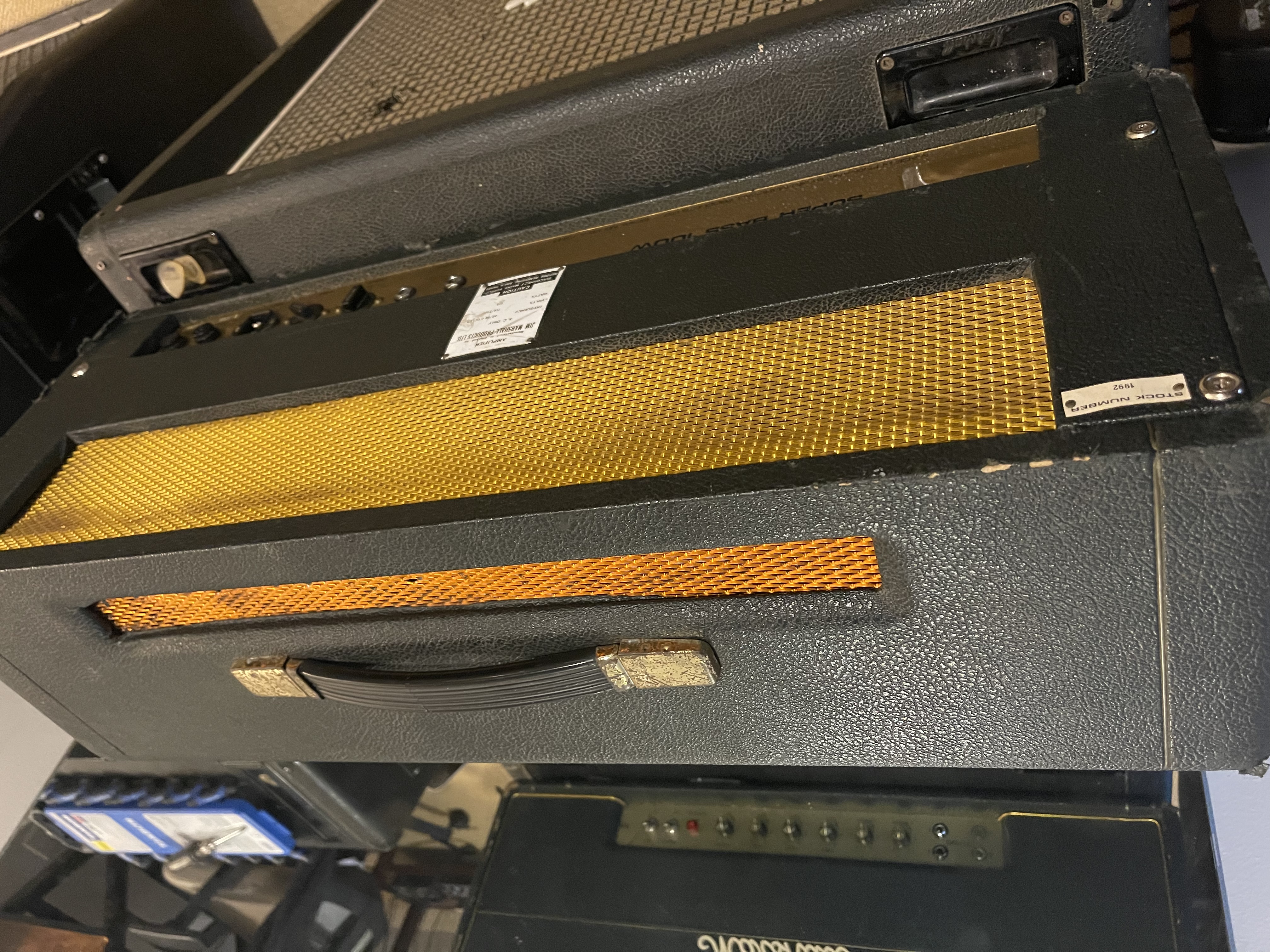 -Early ‘69 Plexi Panel Marshall Superbass, Drake transformers, original circuit. Brand new tubes, freshly recapped. Completely gone through by plexi Wizard Greg Germino of Germino amplification, who measured and tested every component. Several resistors that had drifted out of spec were replaced with era correct NOS components. Fit as a fiddle. Amazing overdrive at 5.5 on the volume. Thunderous rock and roll tone of the gods past that! Roll back the volume on your guitar for some of the best cleans on the planet. AC/DC, Zeppelin, Hendrix and beyond! $6,950 SOLD