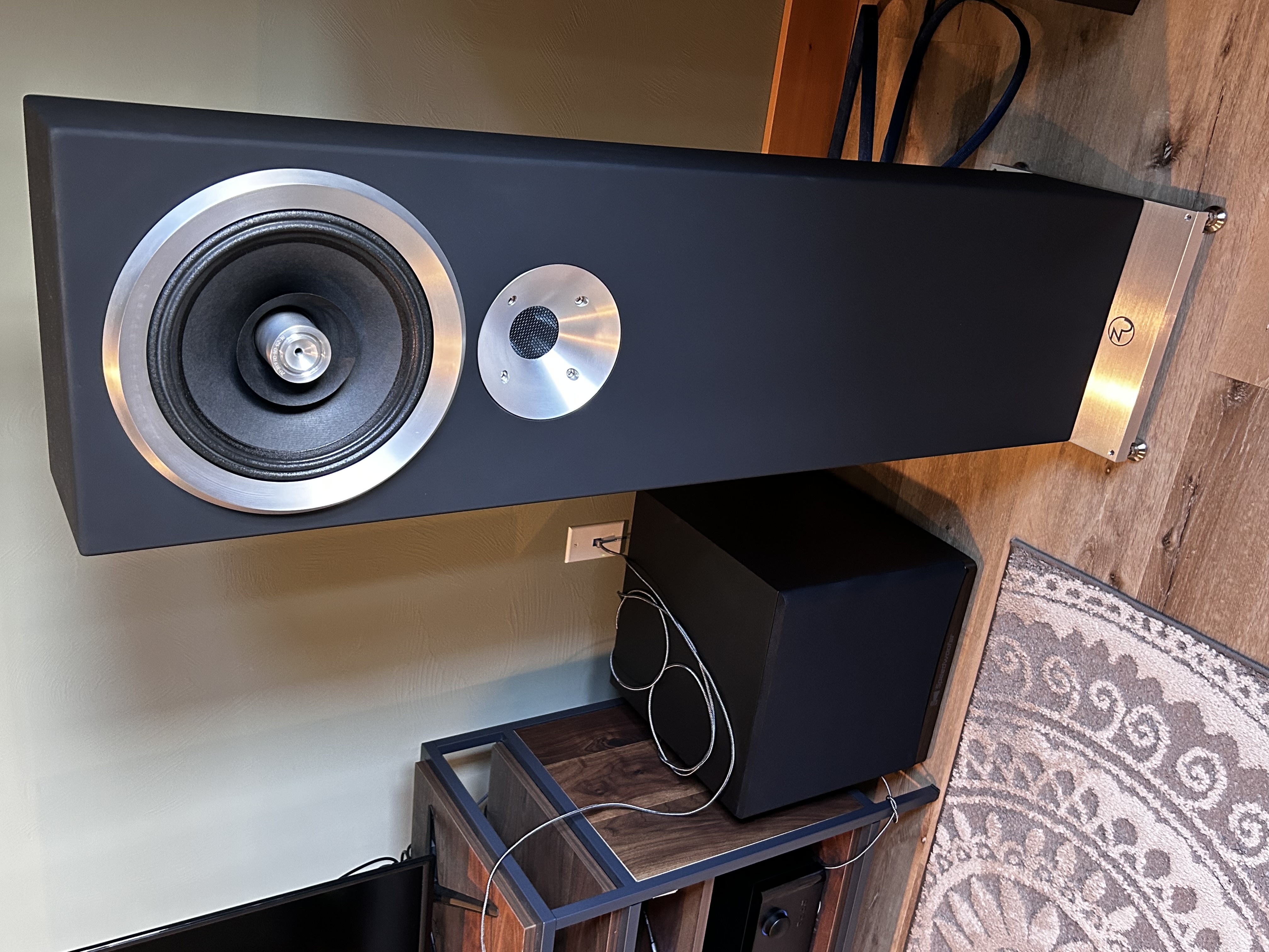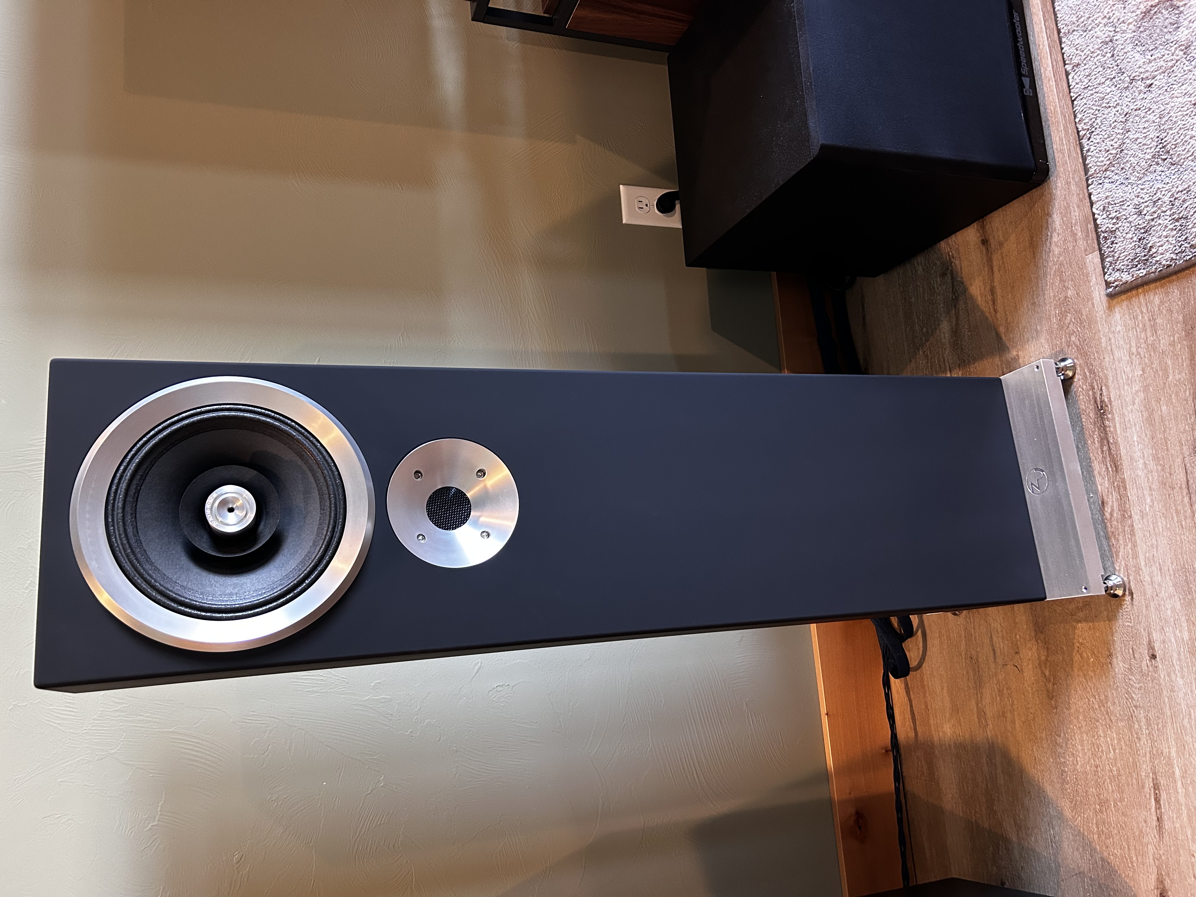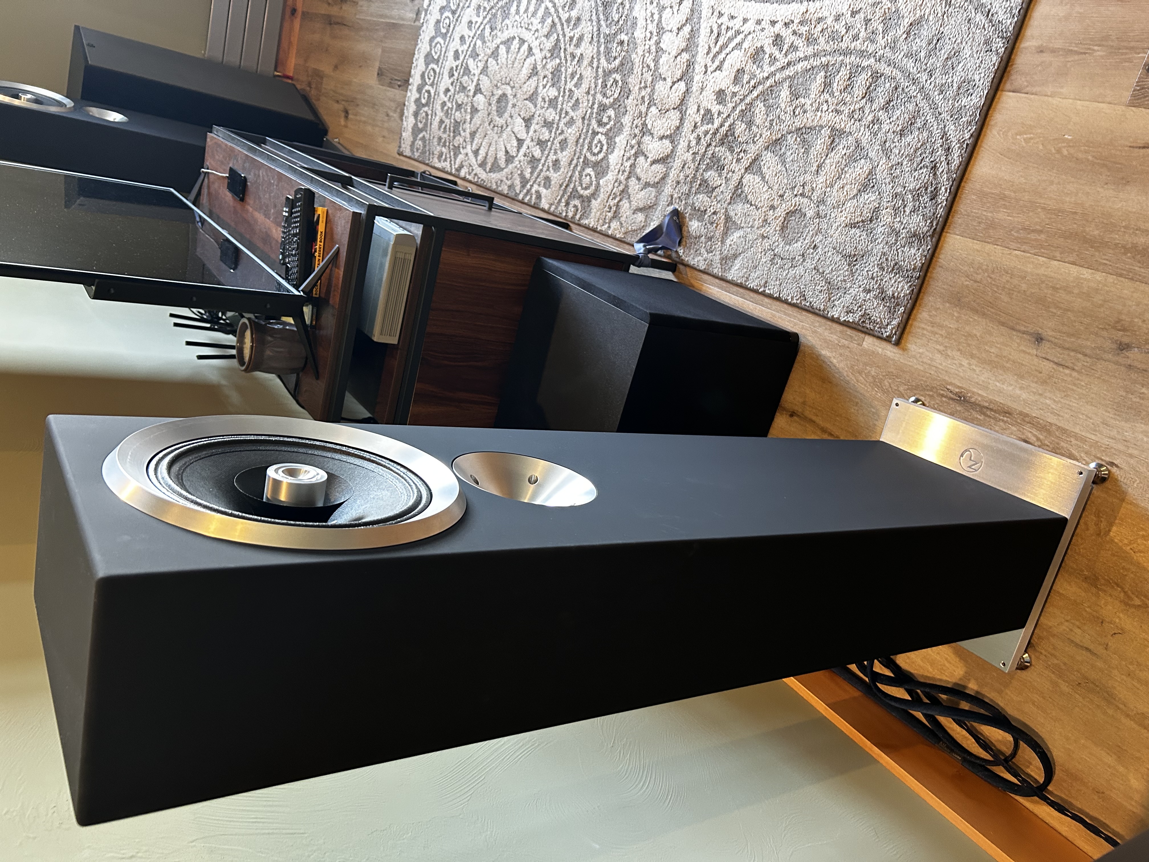 Drivers and cabinet are designed as a whole, the driver used as a part of the stressed system and not simply screwed to the baffle. Cabinet design and methods yield significant improvements in strength-to-weight and damping qualities—the wave mechanics of the structure including drivers. Cabinet construction pallet shifts from MDF-type to an engineered birch/maple/carbon/aluminum composite construction using 100% solids, infusion epoxy for layup and very large filleted internal edge and corner work. These materials and and techniques combine for serious improvements in system fidelity: lower noise, better power transfer… and a longer life! The sound produced is vivid, emotionally connective and relaxed."