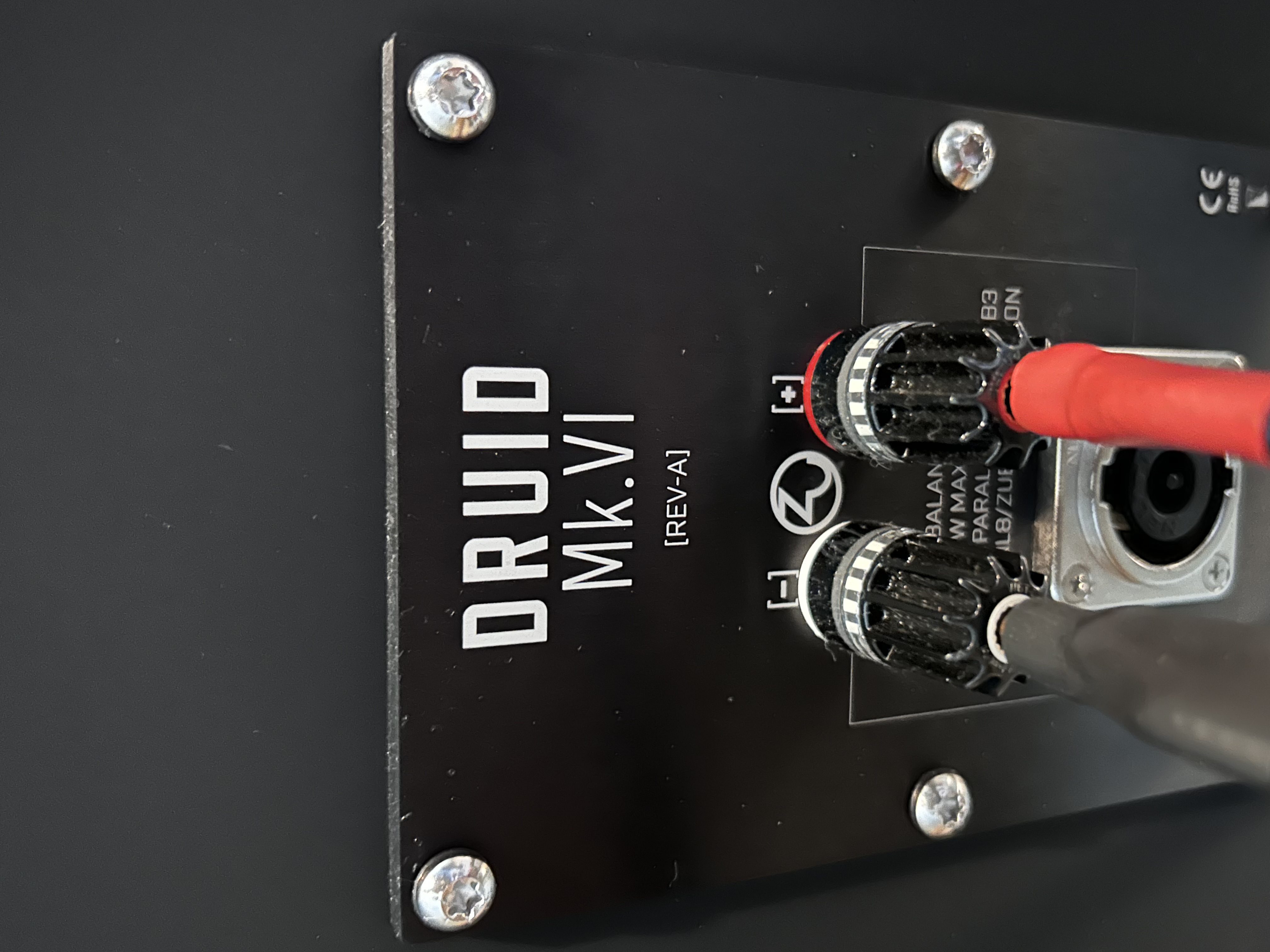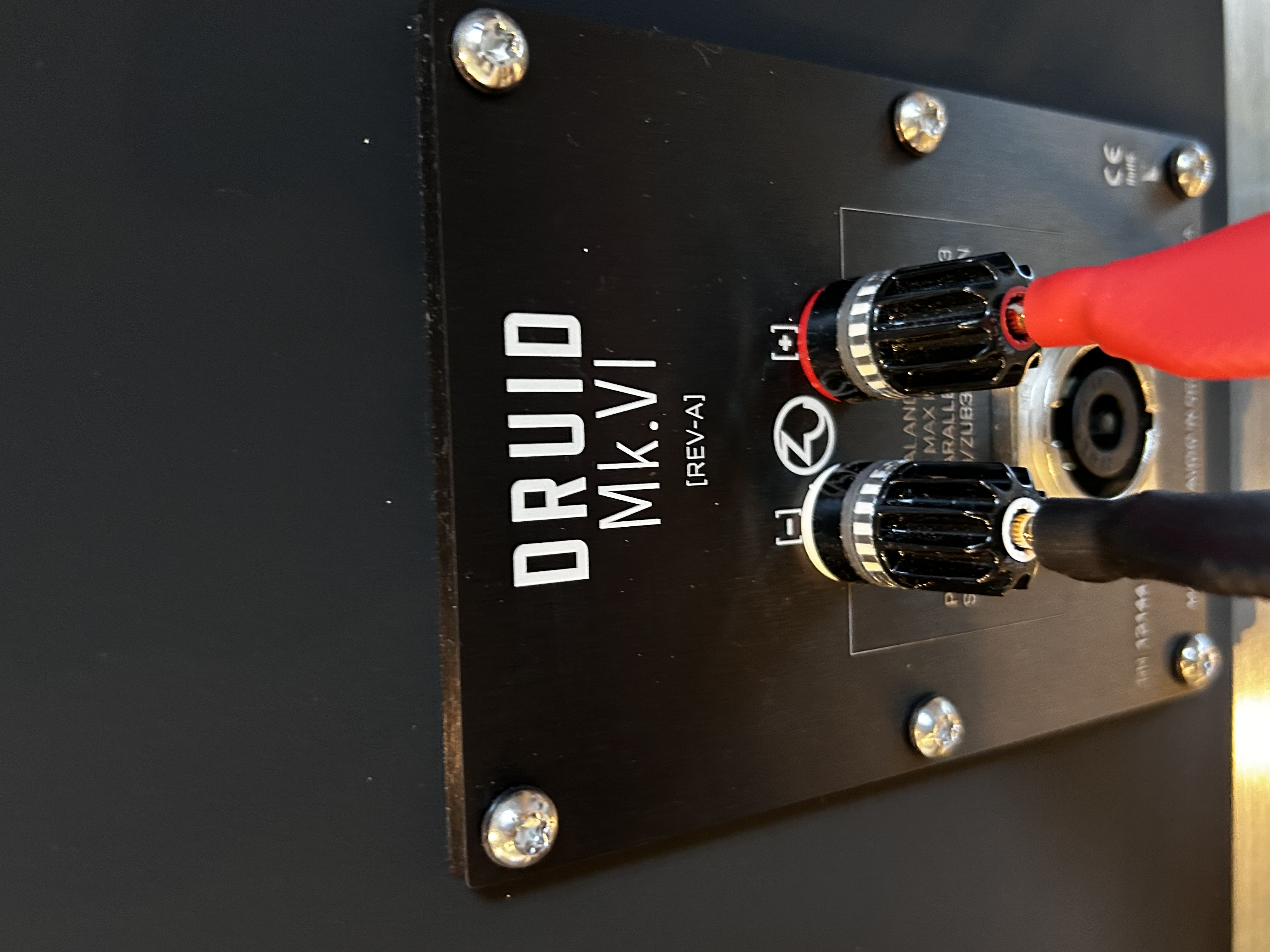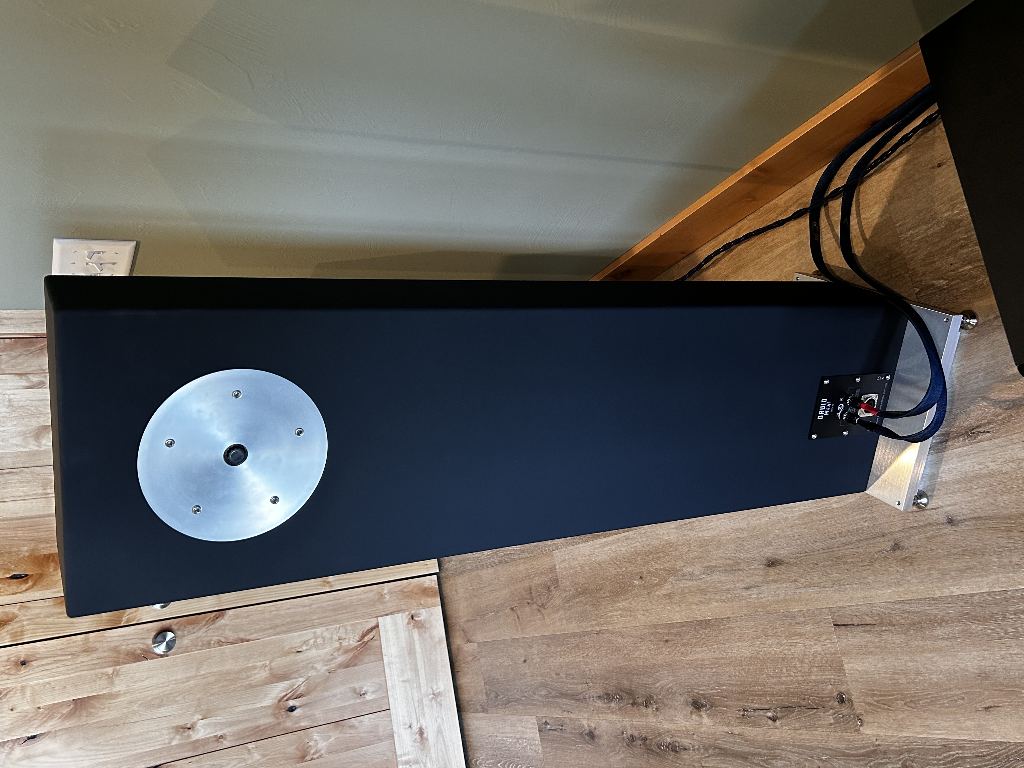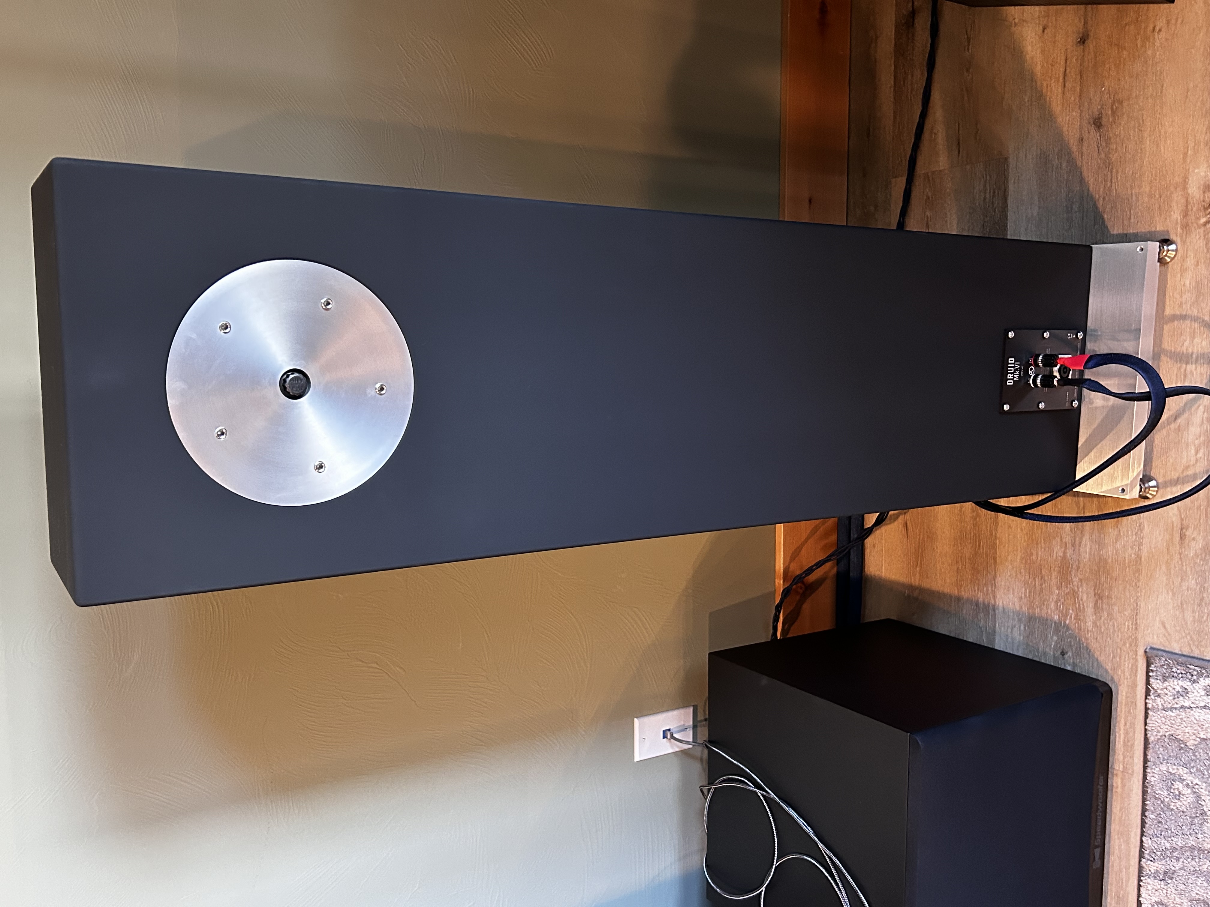 Druid stands fifty inches [130cm] tall, seven inches [18 cm] deep, with a footprint of 12-3/4 inches [32.5 cm] square. It is both high efficiency [101 dB-SPL, 1W @ 1 m] and high power handling [200W] and features our new 11-1/4 inch [29 cm] full-range driver augmented by a Radian based tweeter to color in the harmonic structure and detail of the upper most treble. Internal cabling is our Event Mk.II loudspeaker cable.