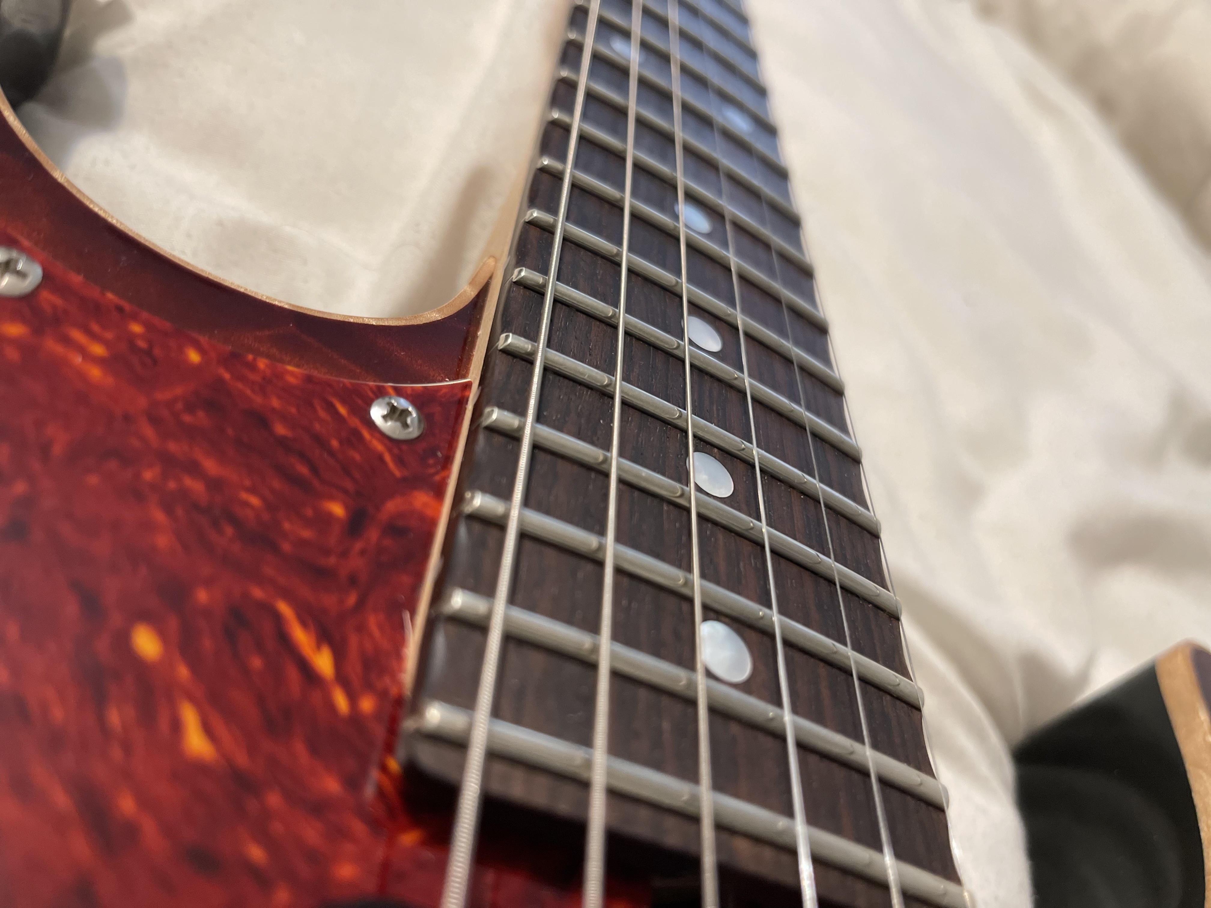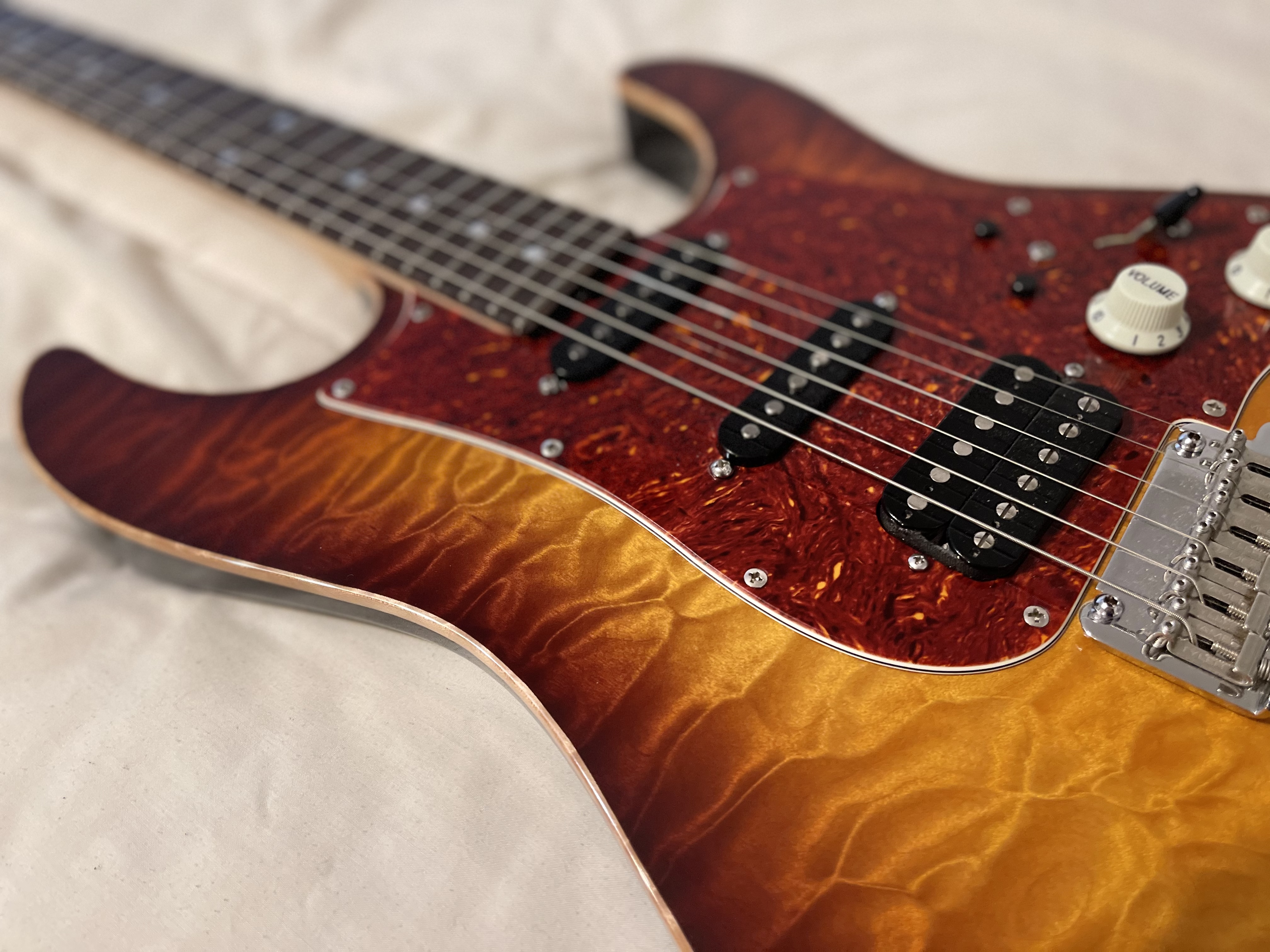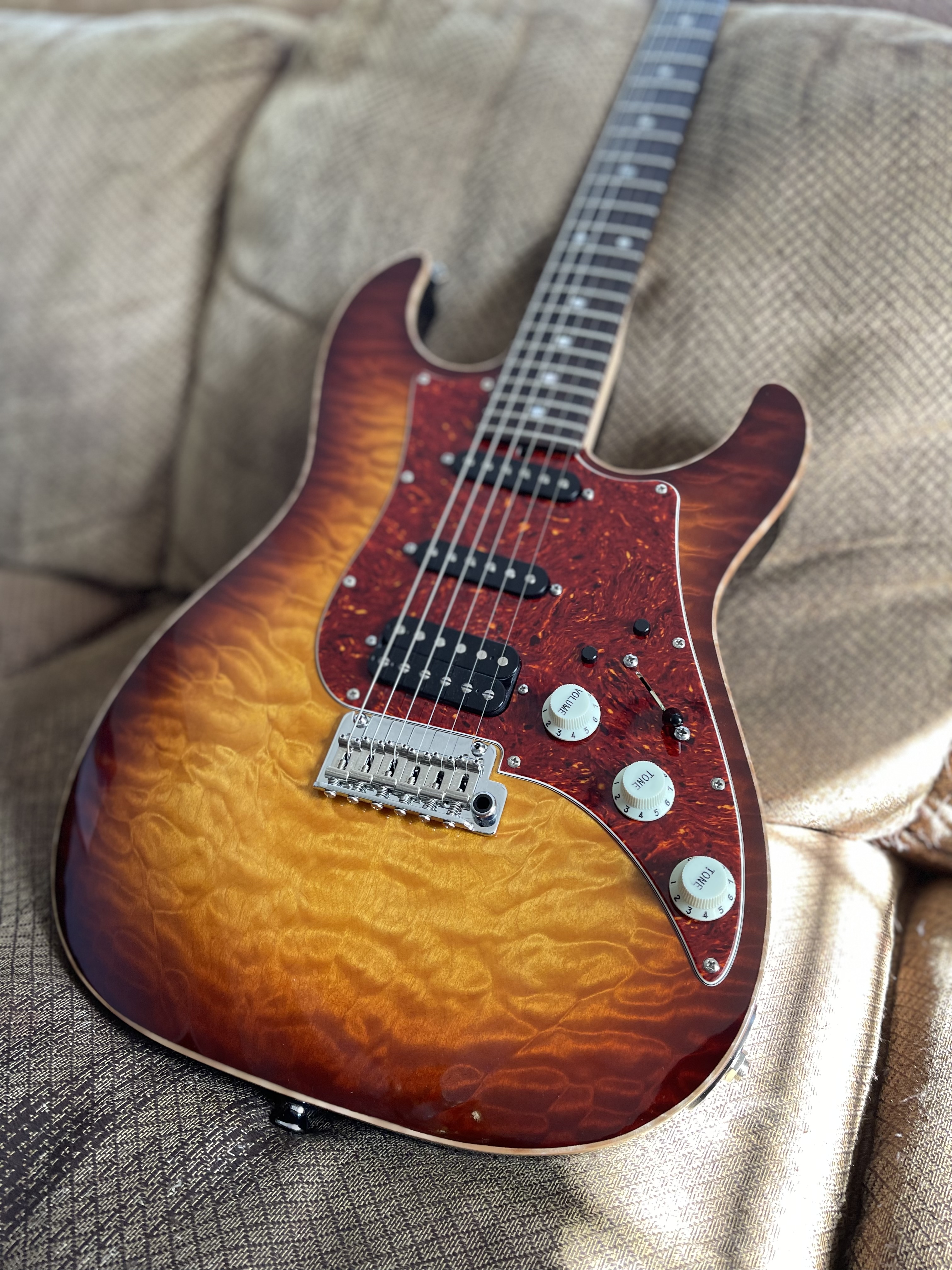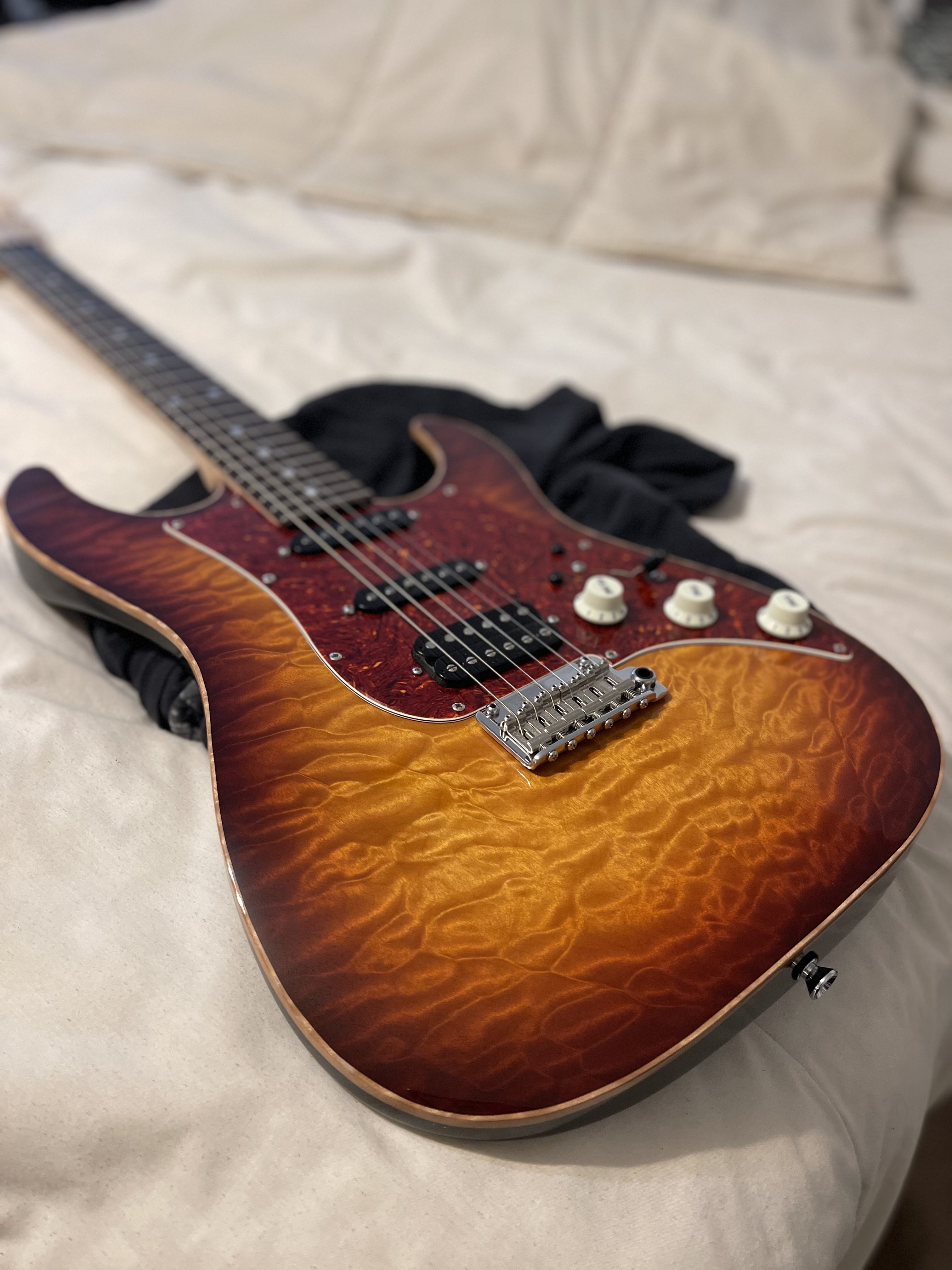 James Tyler guitars, some of the most toneful and amazing guitars you can find. This one is a unique beauty with a mahogany body and 5A quilt top. Also has Ron Ellis pickups installed in the guitar for possibly the best sounding strat style guitar you’ll ever hear. Phenomenal playability, build, and tone. Has hard case. Guitar has no issues but does have a few scratches and a small finish hit that yours truly did during a restring, but no nicks, breaks, anything of that sort outside of a few minor cosmetic signs of regular wear. $3500 plus shipping.