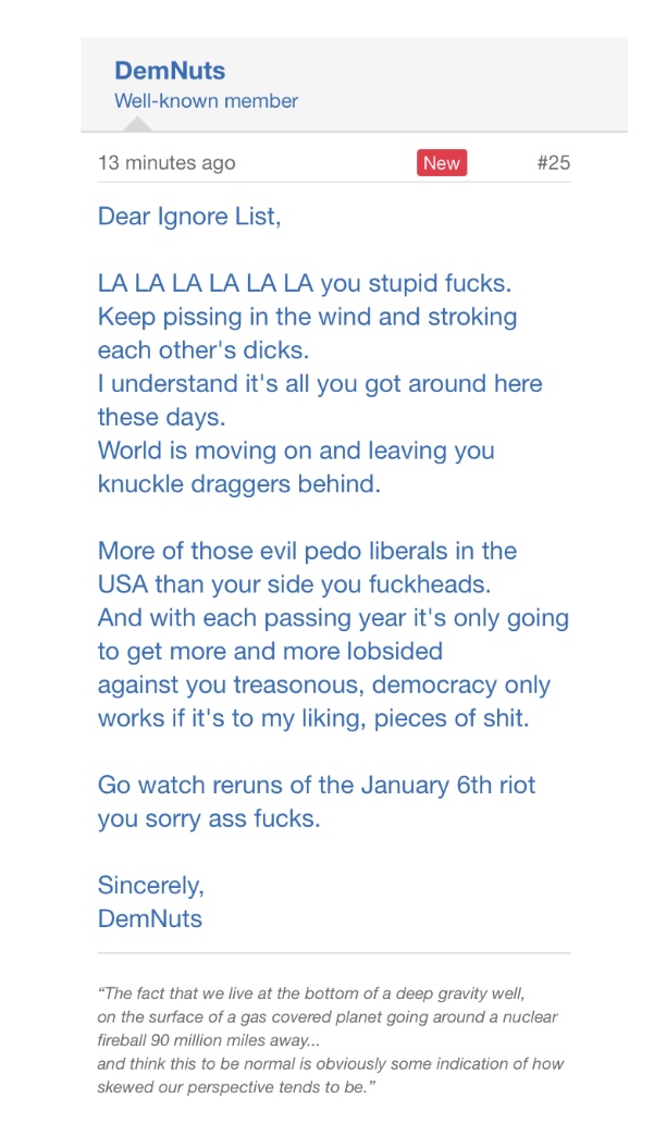 Except that this time 'round he hasn't submitted a single report or PM "crying". Nothing at all.Yes, and don’t forget, Crying, always, ALWAYS the poor fucking victim.