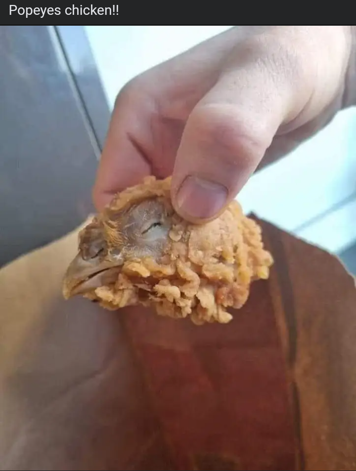 At lunch in Singapore, one dish we had was a compressed prawn "cake" with layered crispy chicken skin on top, garnished with a severed chicken head like this minus the batter.