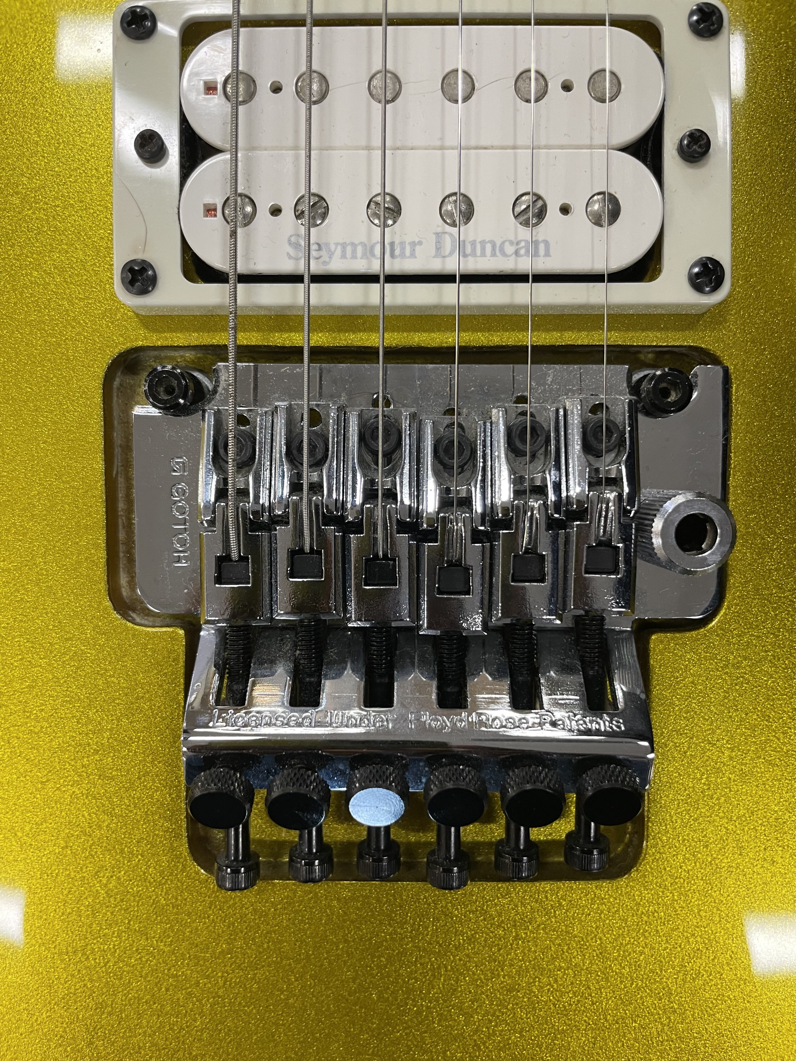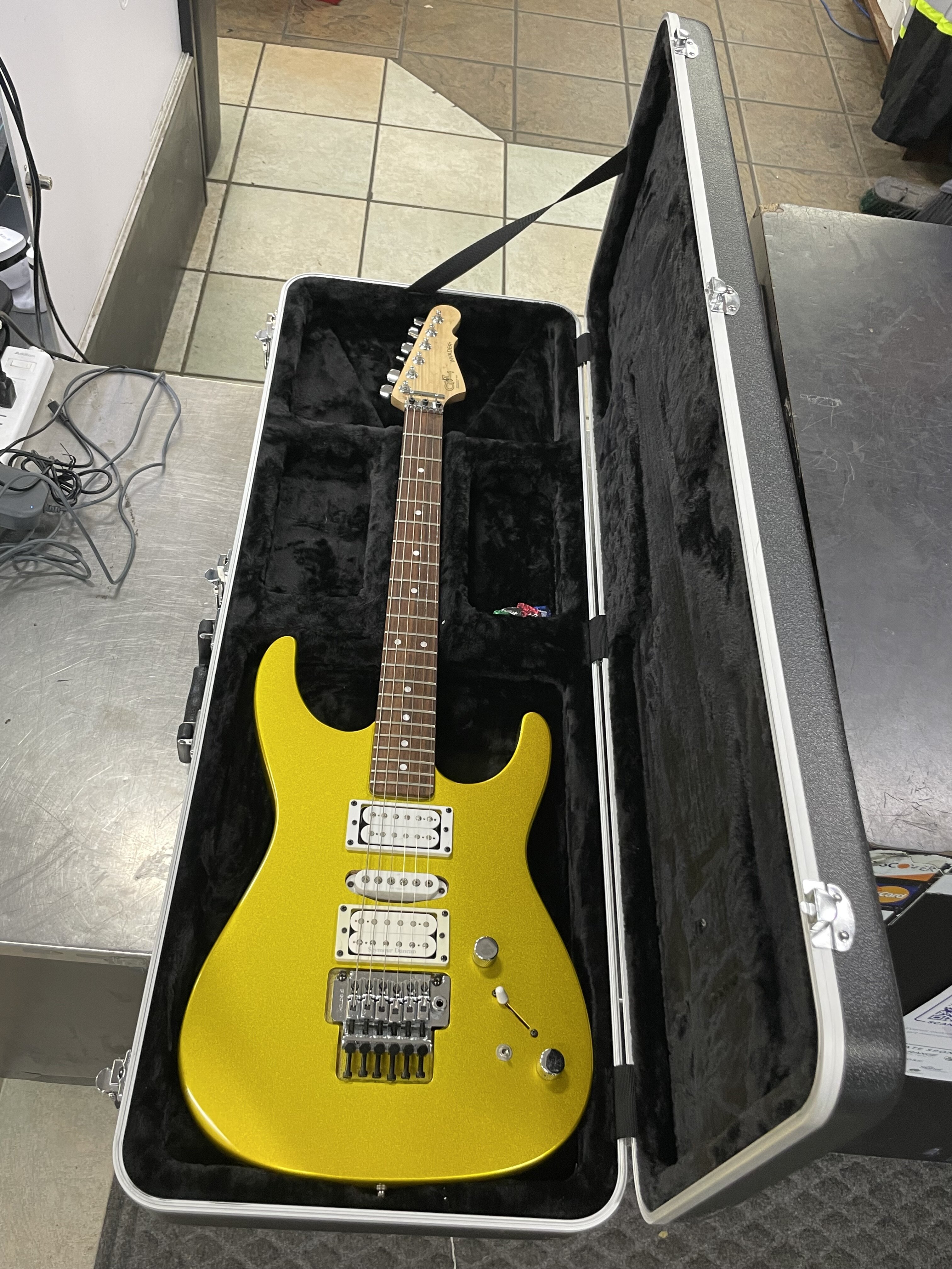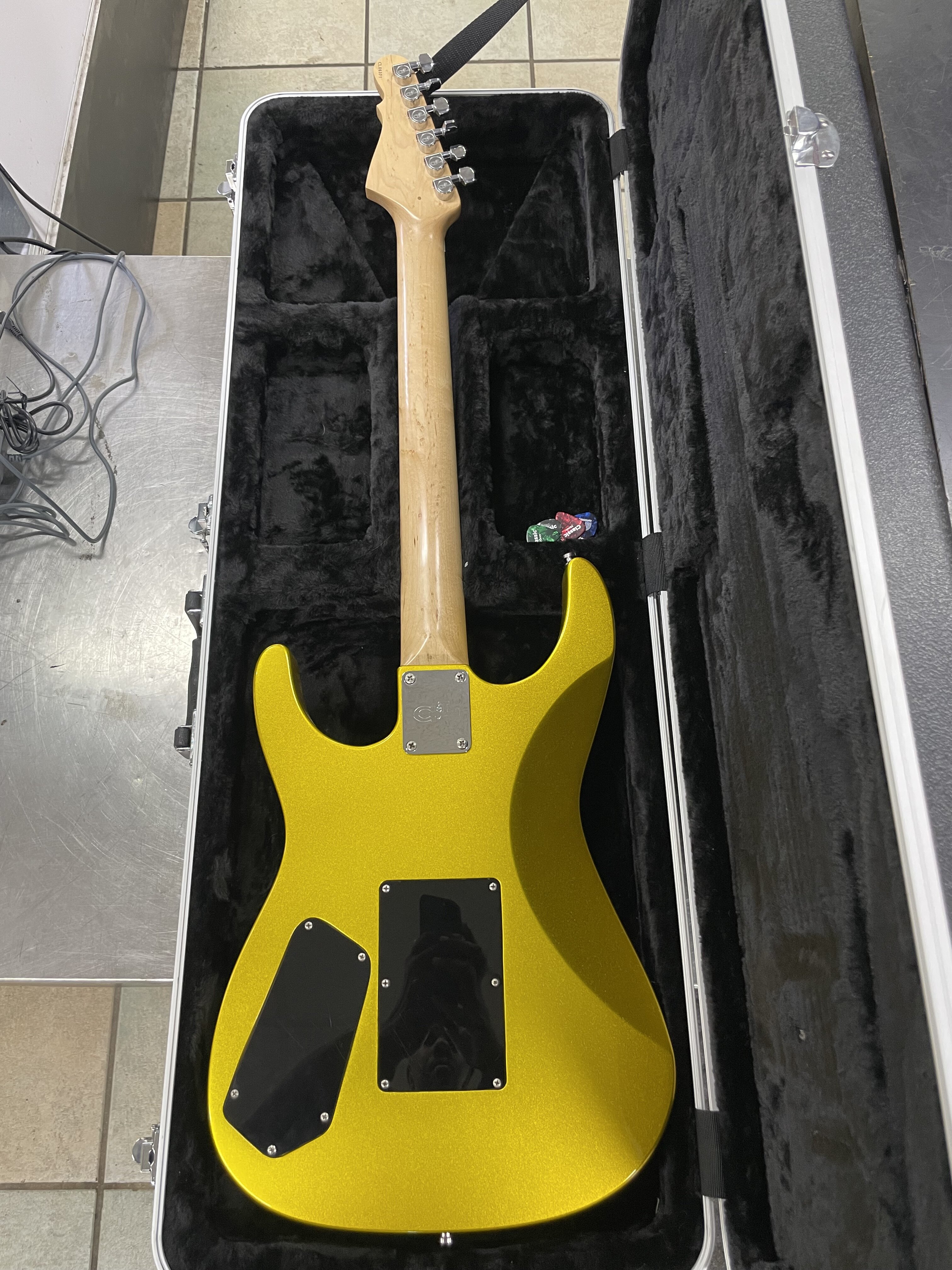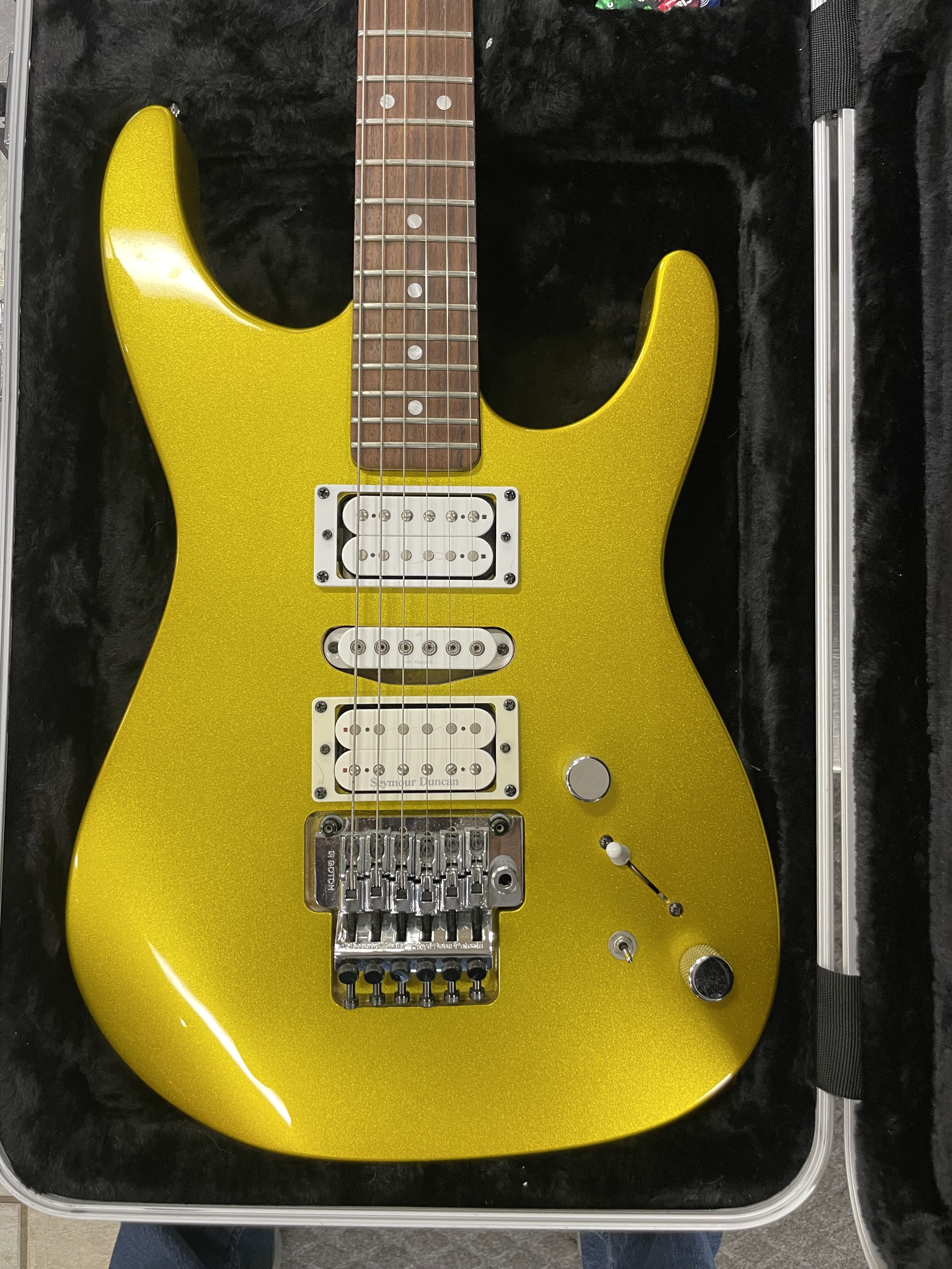 This invader plus is USA made has Seymour Duncan pickups and a non original hard case. It plays extremely well. Gold metallic is the finish this beast is made in 97. Specs are in the last photo minus the middle pickup being a Duncan as well.