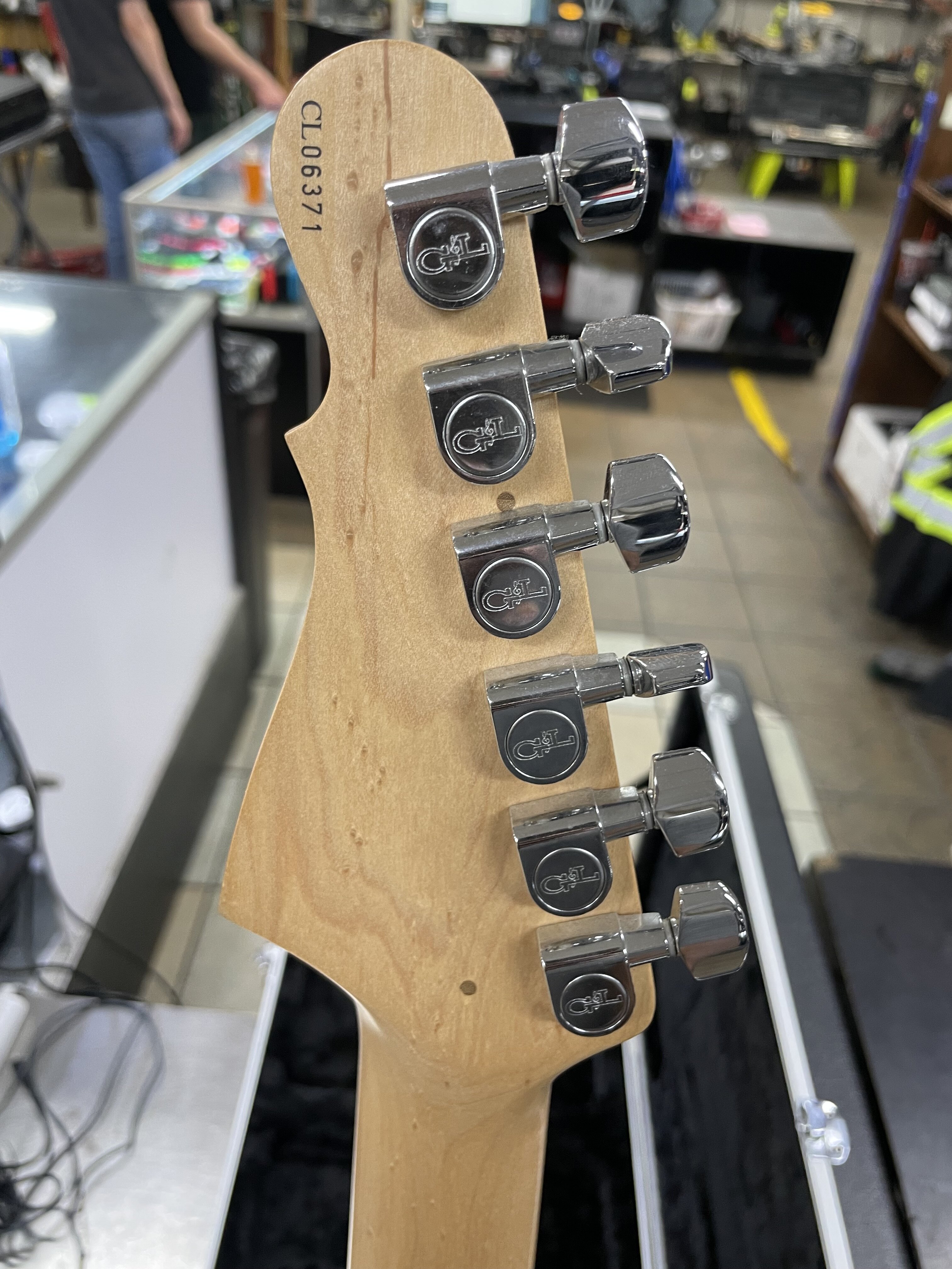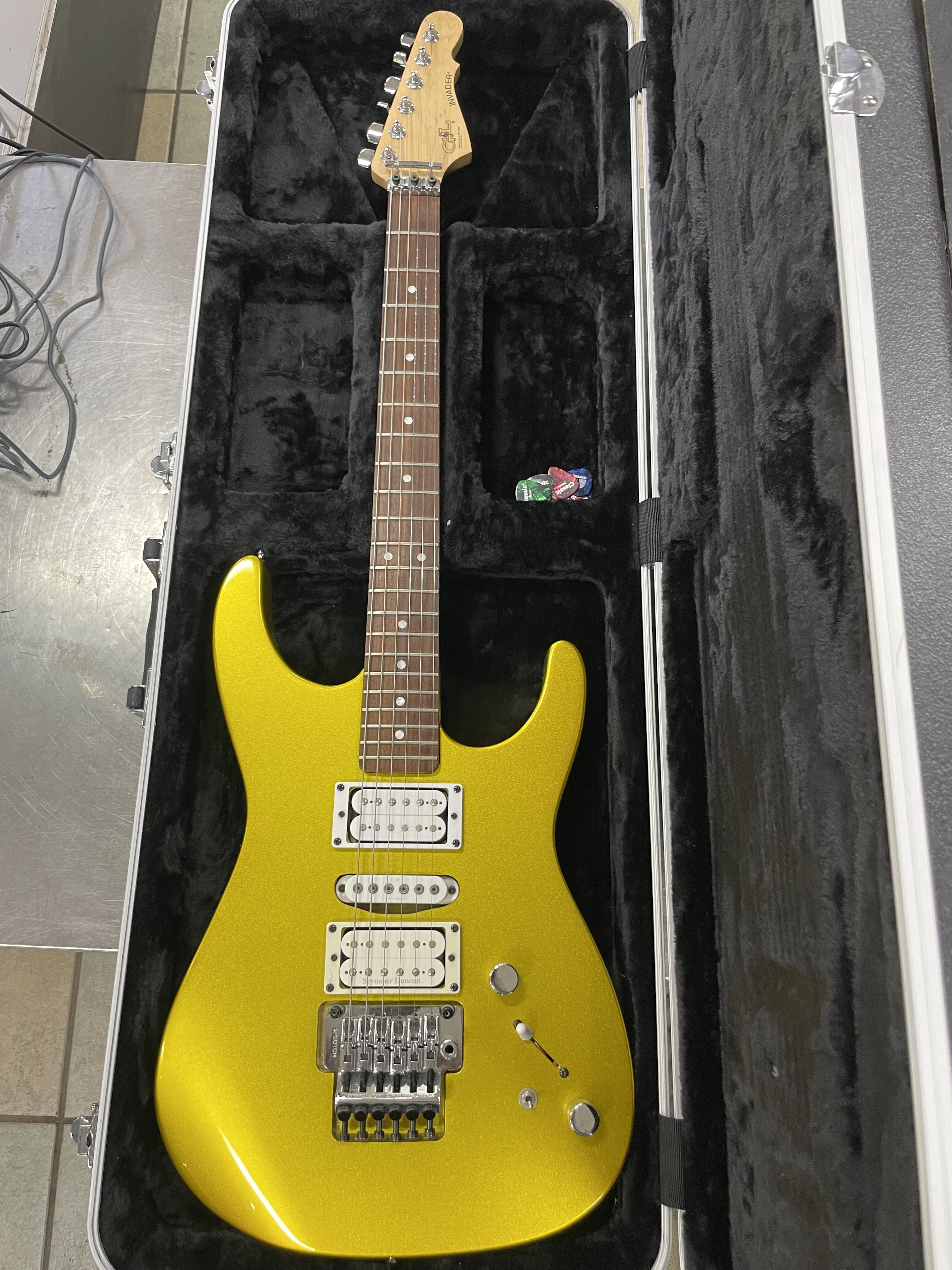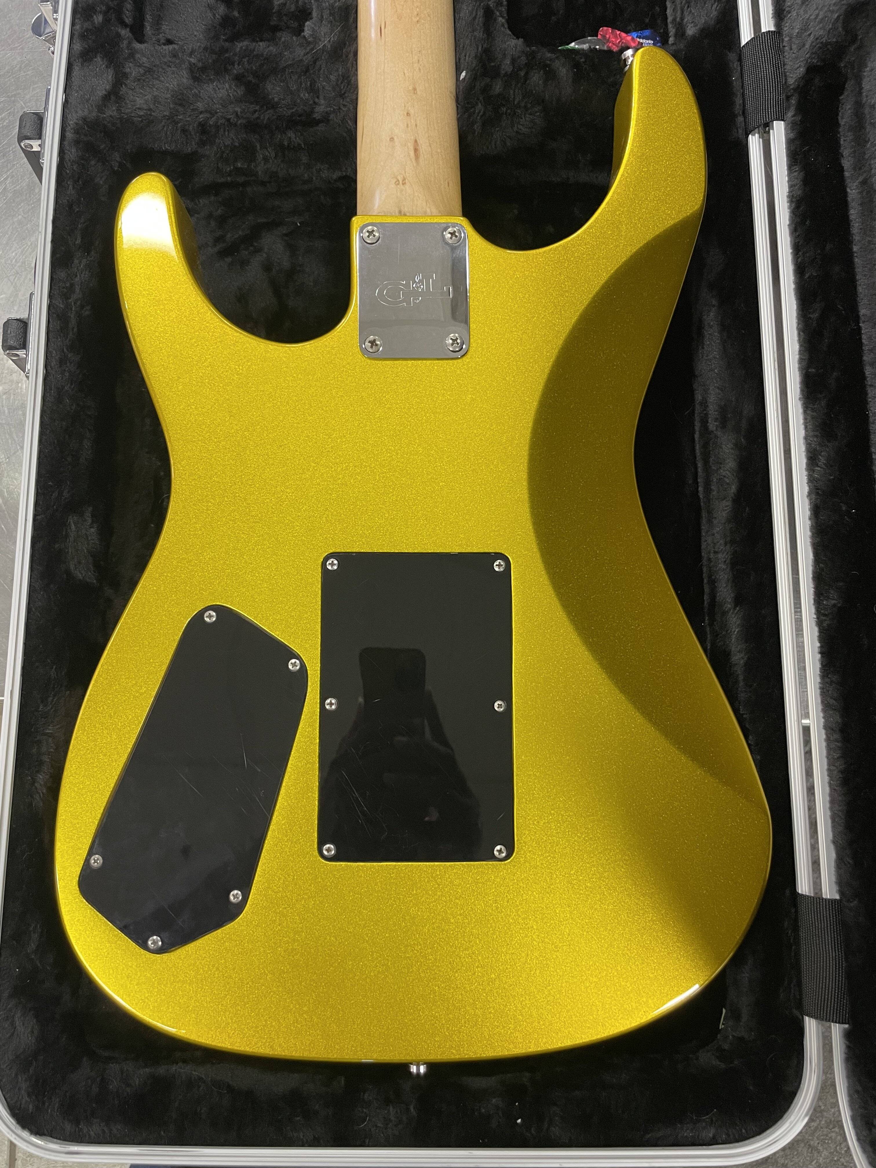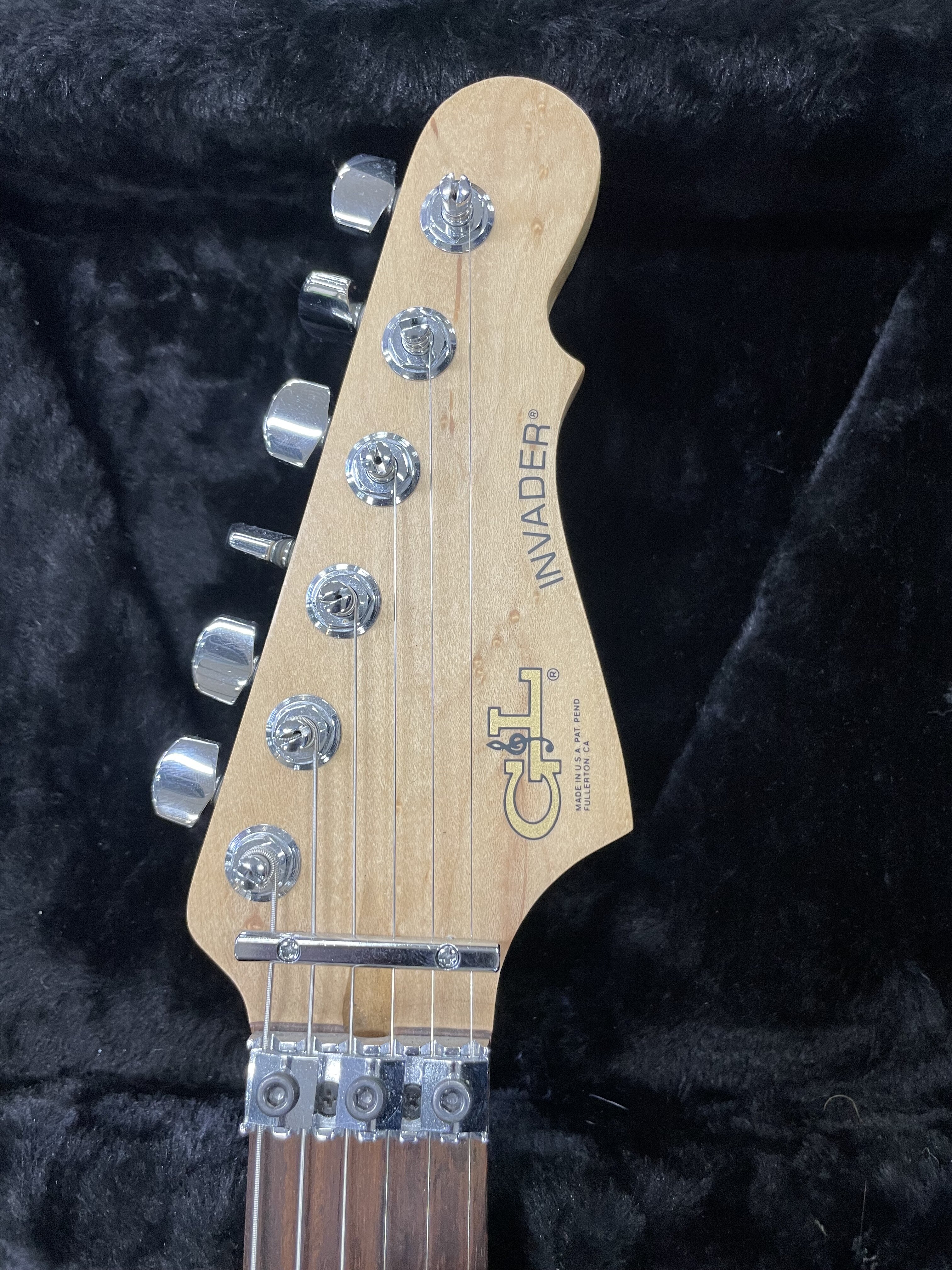 This invader plus is USA made has Seymour Duncan pickups and a non original hard case. It plays extremely well. Gold metallic is the finish this beast is made in 97. Specs are in the last photo minus the middle pickup being a Duncan as well.