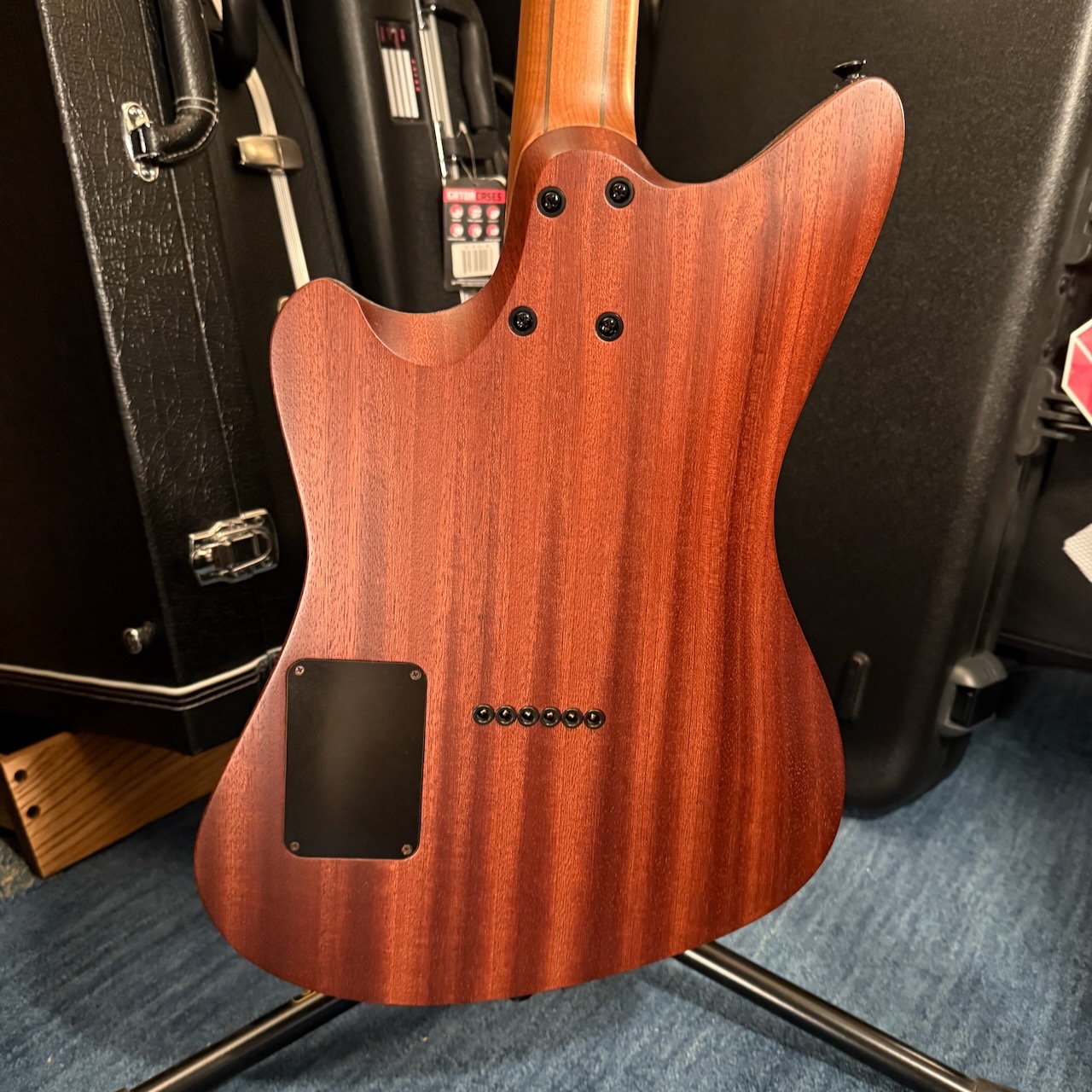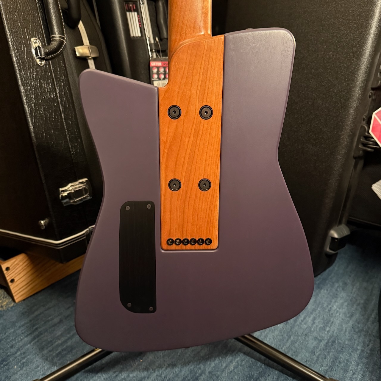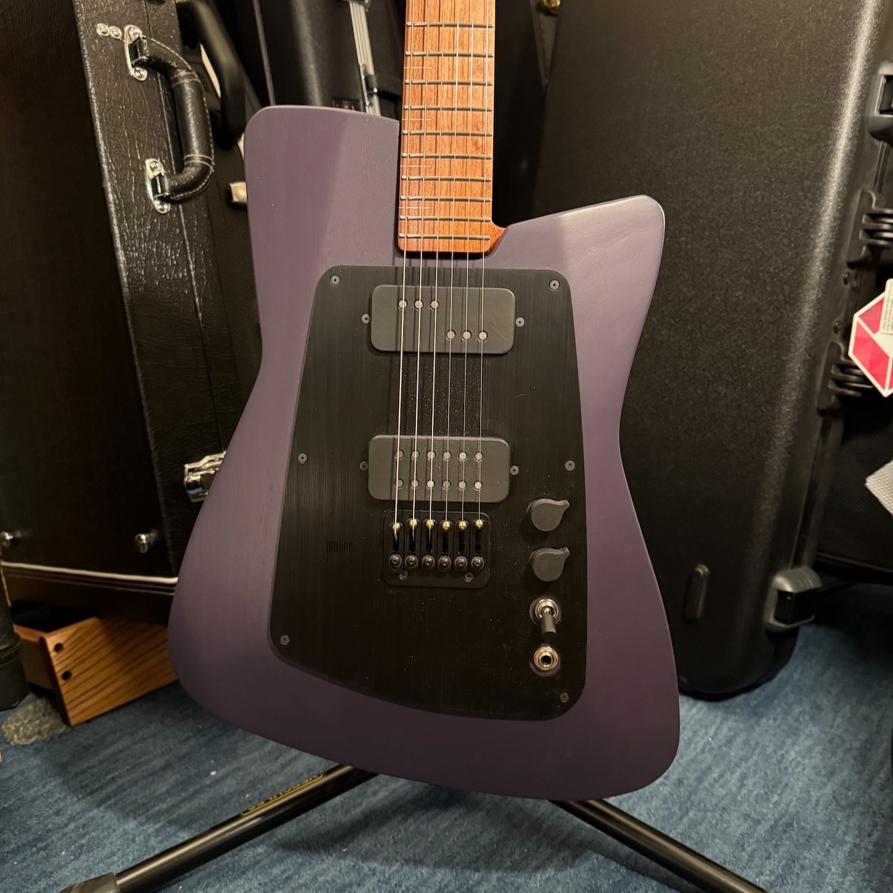 Super unique guitar. Florian does _everything_ in house. It feels familiar but different. The fret end work is amazing in particular. This one is kitted out with a humbucker in the bridge and the thicker neck profile, so what it obviously wants to do the millimetric sound it can limelight as a rocker if needed.
