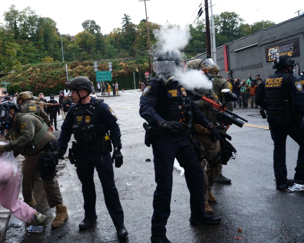 Today in Portland, a fed shooting pepper balls from the roof of the ICE facility was so eager to aim for people’s heads, that after shooting one photographer in the head and another in the upper arm, they accidentally shot a DHS agent in the head. This photo shows the moment of impact;