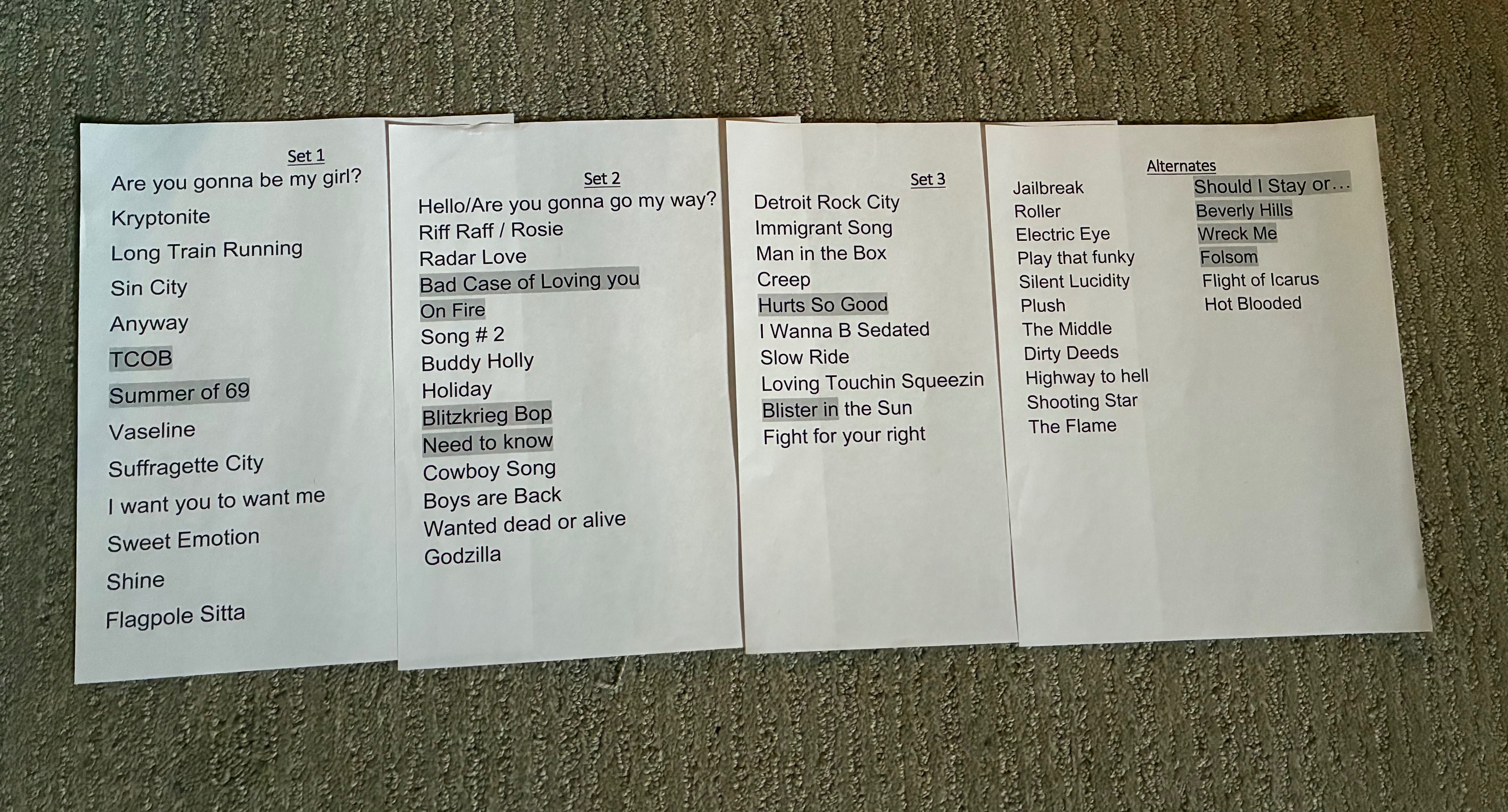 The setlists from my last couple of bands look VERY similar! Good stuff!Friday nights setlist + extras. Grey boxed stuff is songs we sing to give singer a break