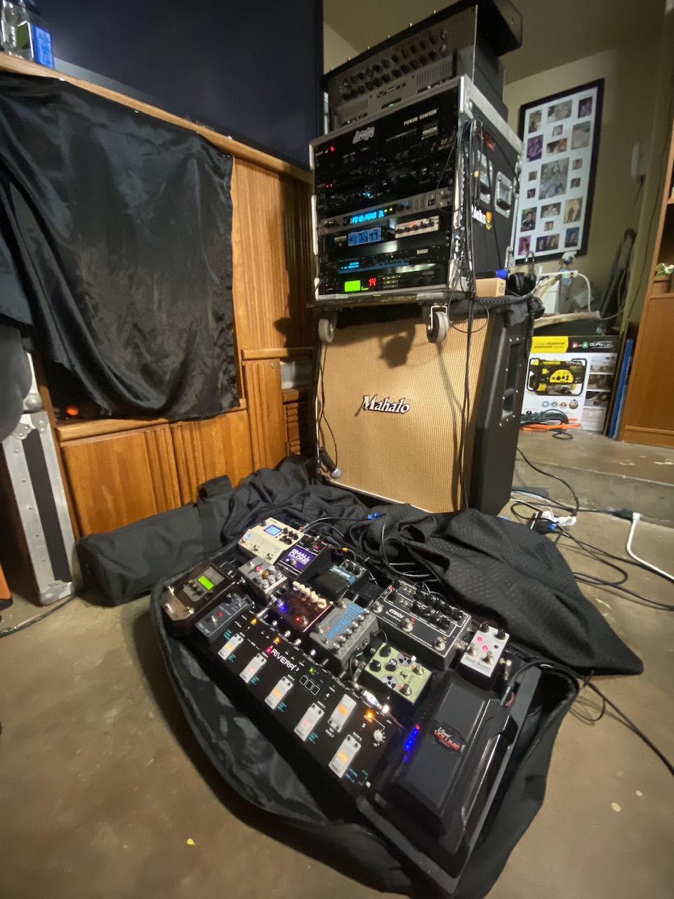 my first rig=dynacomp->dod od250-> boss metal zone->ibanez pmd1 delay modulation->fender harvard reverb II-> preamp out to alesis-> out to ampeg V4 half stack