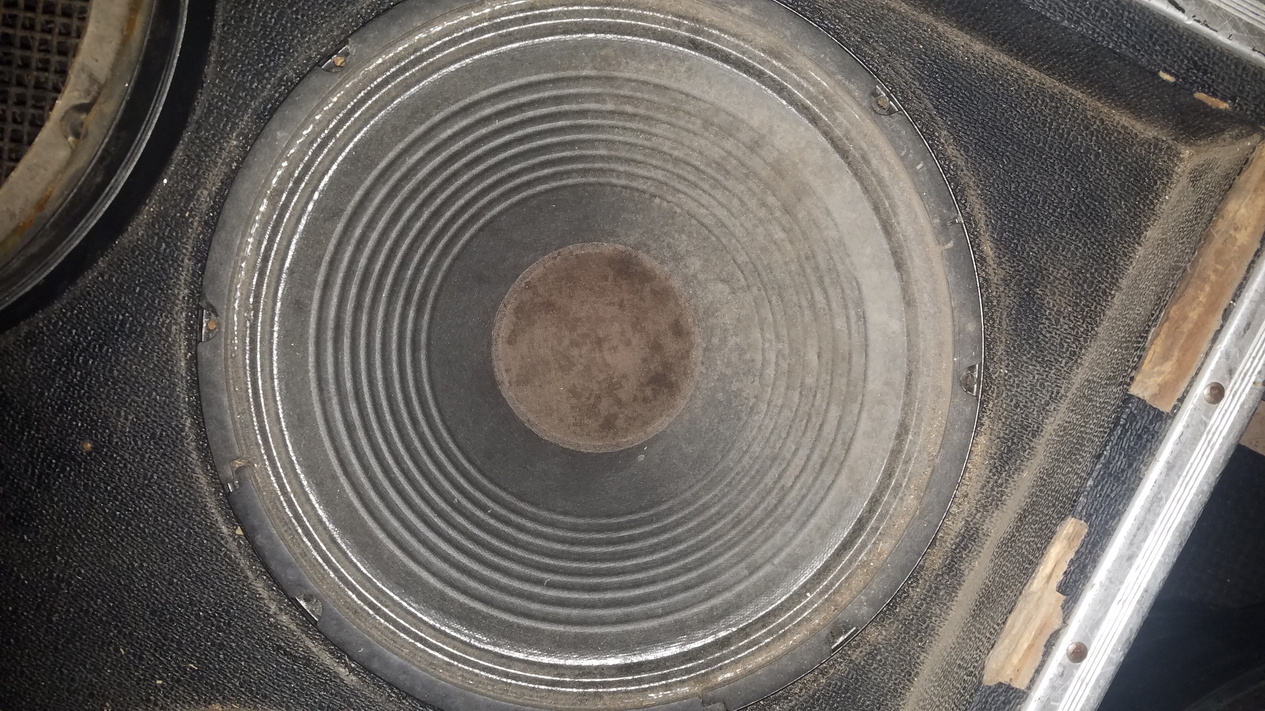 Pulled from a vintage Road cab. 8 ohms each. I used to really like these, but I got bitten by the EVM bug, and now I really don't. So it goes. Not entirely sure about the year these were made, but the guy who sold me the cab claimed he got it new with the speakers in the 70's, and since these speakers weren't made until the 80's, presumably he misspoke and meant late 80's. The Carvin museum says these started to be produced in '89. They definitely show their age, being fairly dirty with discolored dust-caps and some liquid stains, though they still work great as far as I can tell and the cones appear to be in good condition with only a few non-aesthetic blemishes, see pictures for details. I can clean the speakers up a little before we meet, I just wanted the pictures to show the condition I took them from so I left most of the dirt, dust, etc. on.