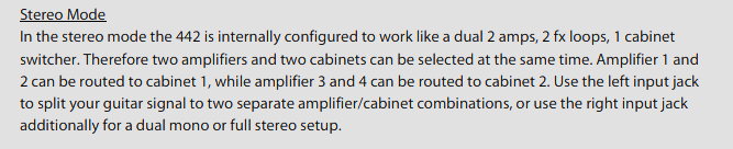 I think there is a misunderstanding, two heads will never feed one cabinet, but only two (except for a speaker cabinet with stereo functionality of course). In the stereo mode the 442 will route two heads simultaneously but separately into the two cabinets. In the “rig” mode, the speaker signal of the amp is not routed back in the switcher but drives a speaker cab that is directly connected to the amp/combo, that runs in rig mode.