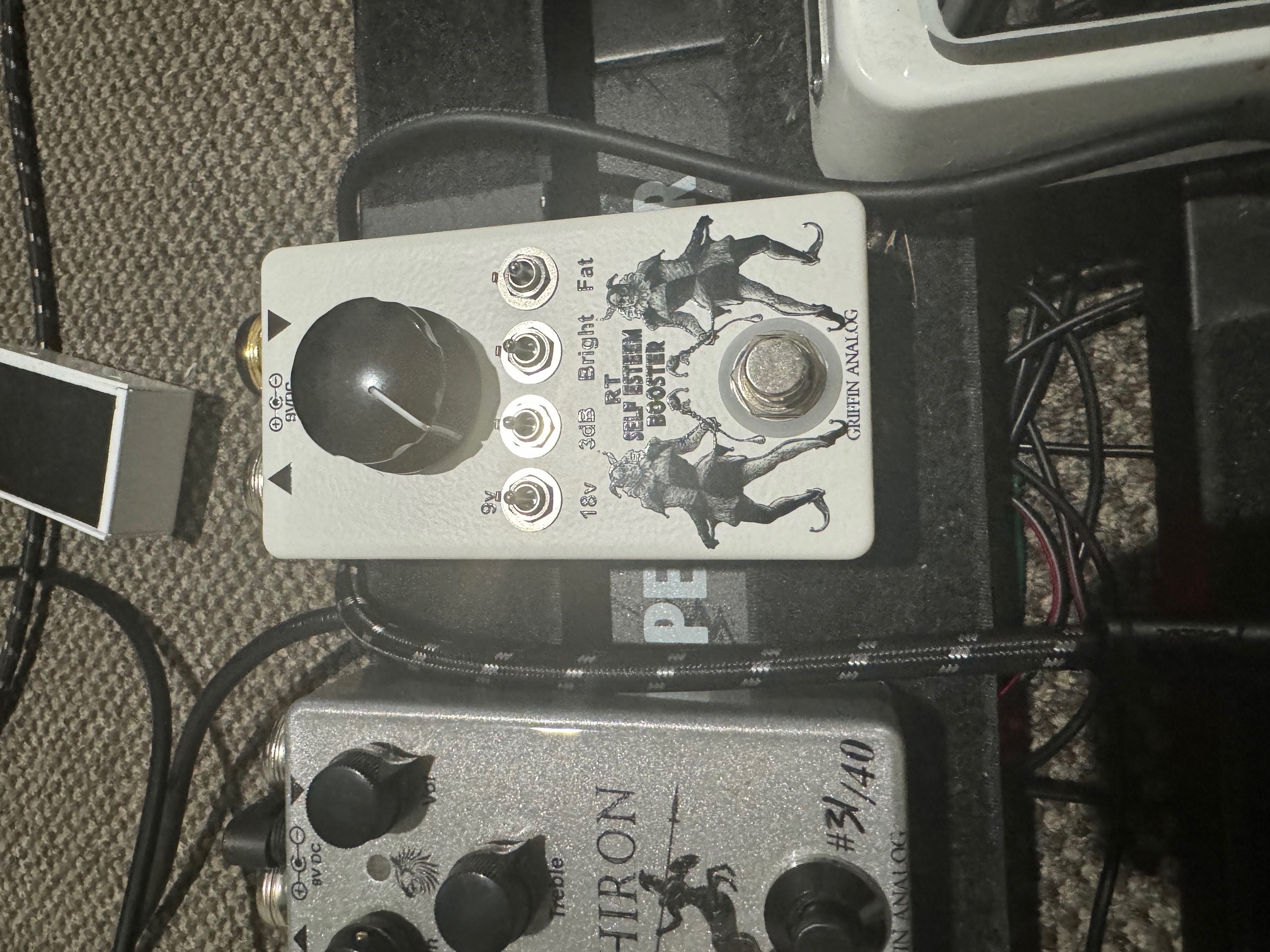 A modded EP Booster with 9v or 18v option , + 3dB , Bright switch and a 3 way Fat switch that would compliment any set up whether it's pushing the front end of your amp or boosting the volume at the end of your chain .