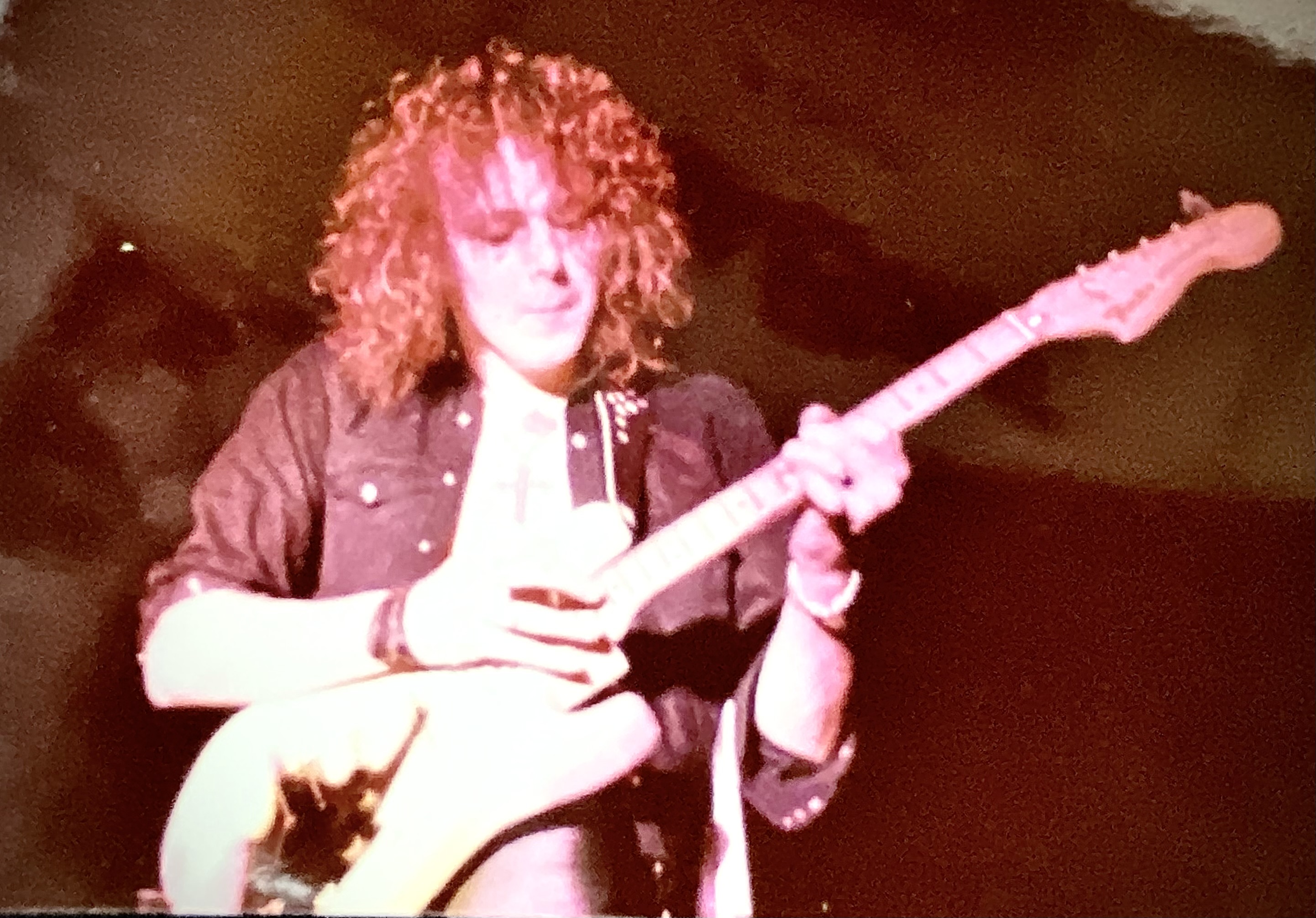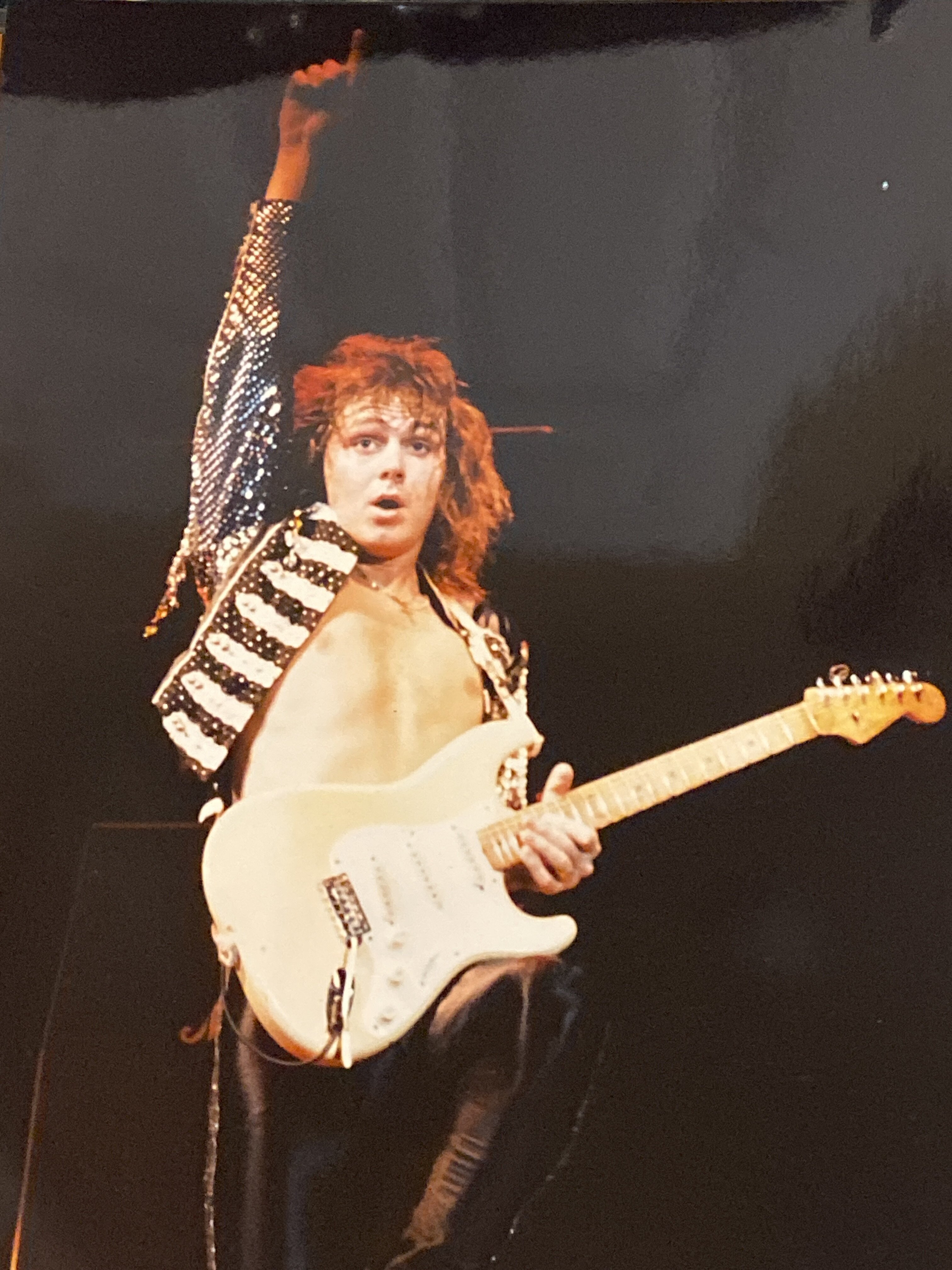 my friend Andrew and i beelined chest to the stage at the university of hawaii ballroom for the alcatrazz concert. Andrew’s hand is the one throwing the horns shadow on Yngwie’s strat in this shot to give you an idea of how close we were. during YJM’s solo Andrew who didn’t even play gtr went bonkers as Y kneeled in front of us shredding and A pulled the cord out of Y’s gtr and almost got a swedish kick in the face!