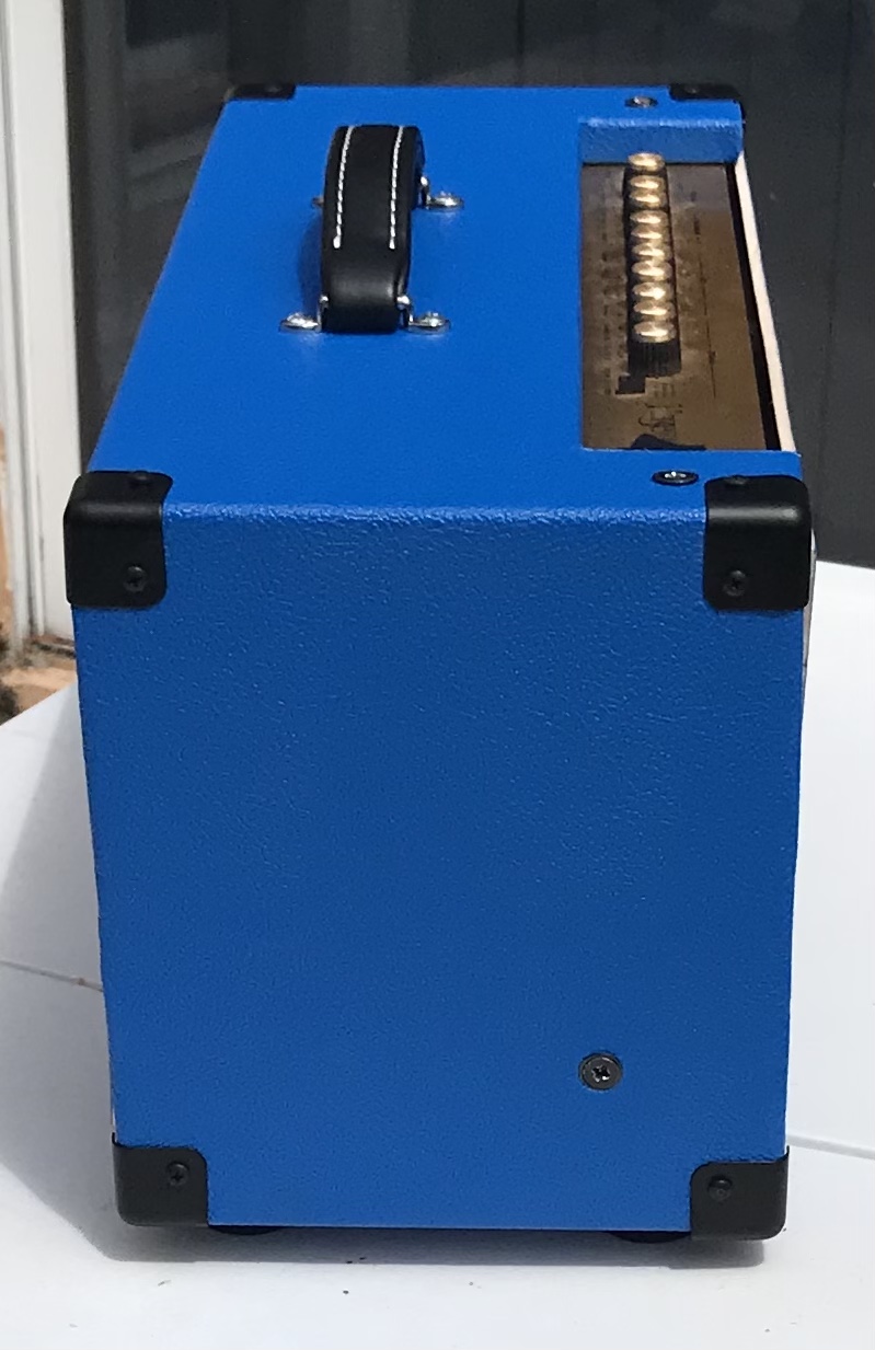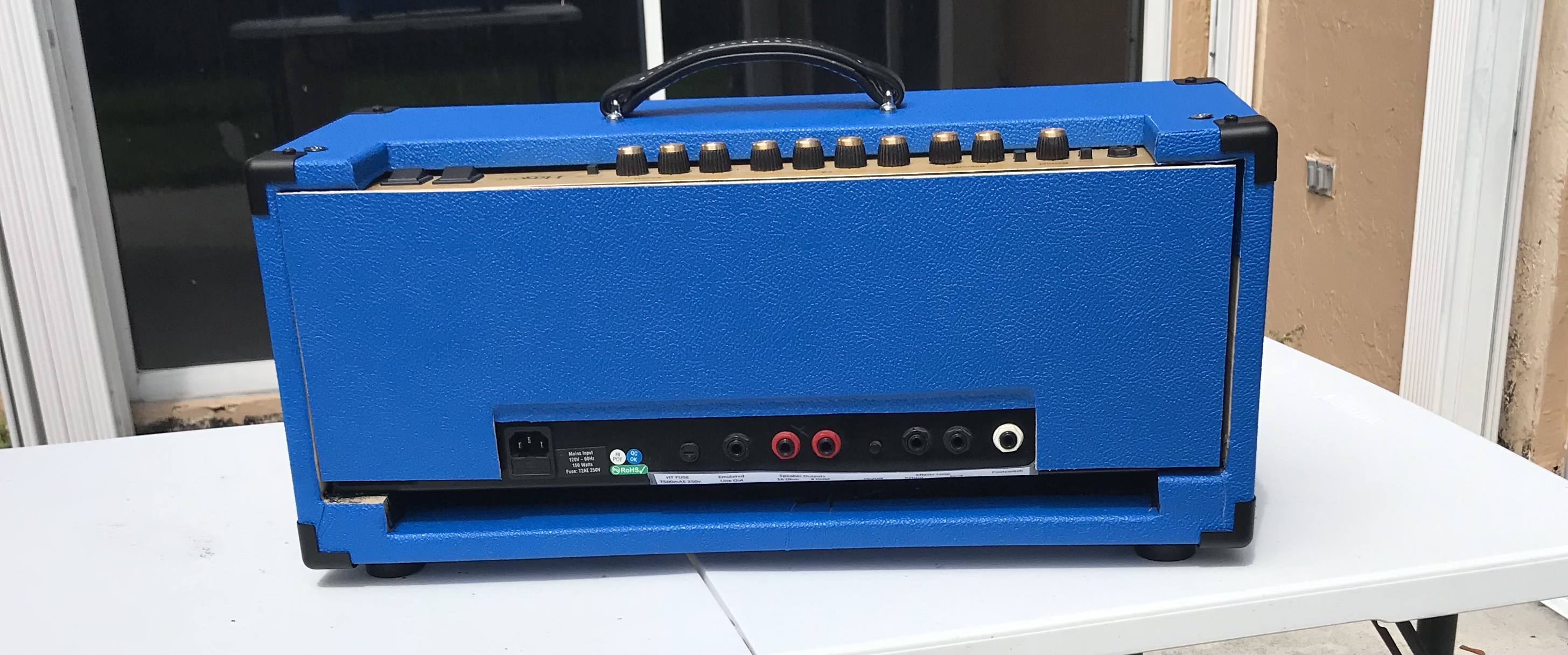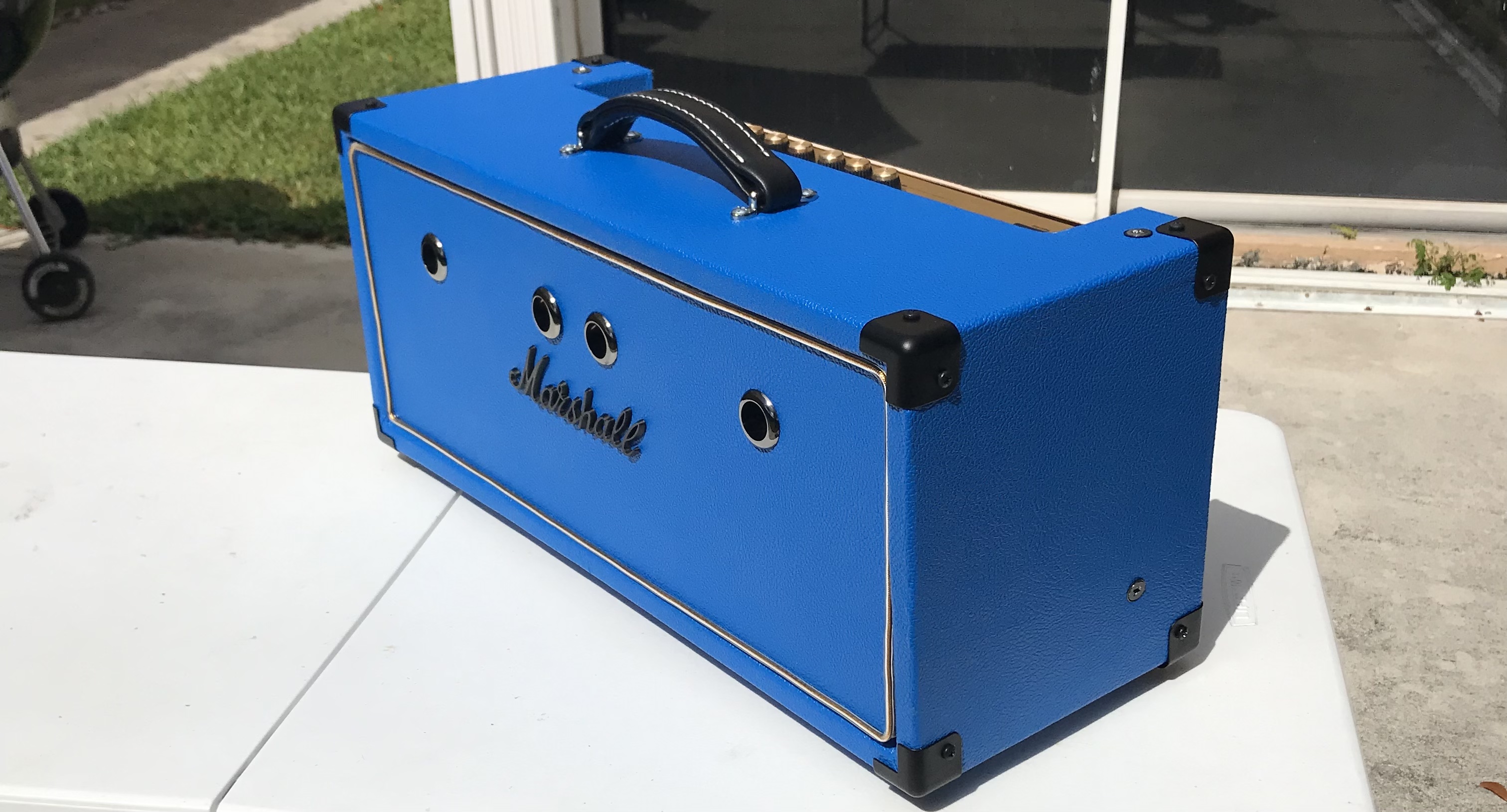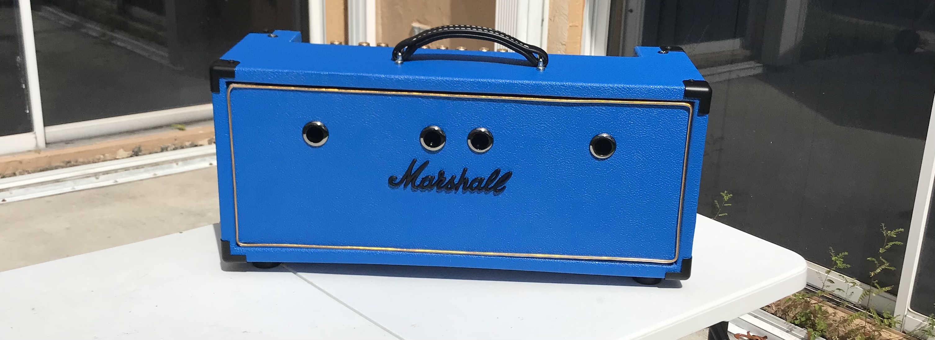 The head color is Regency Blue. I ported the front for tube heat dissipation. I used furniture grommets to finish off the ports. To finish off the corners I used Peavey 6505mh amp corners. I used the thick Marshall gold piping from Stew Mac. I used a staple gun to attach the piping. The handle is black leather. The 6” Marshall logo is spray painted black.