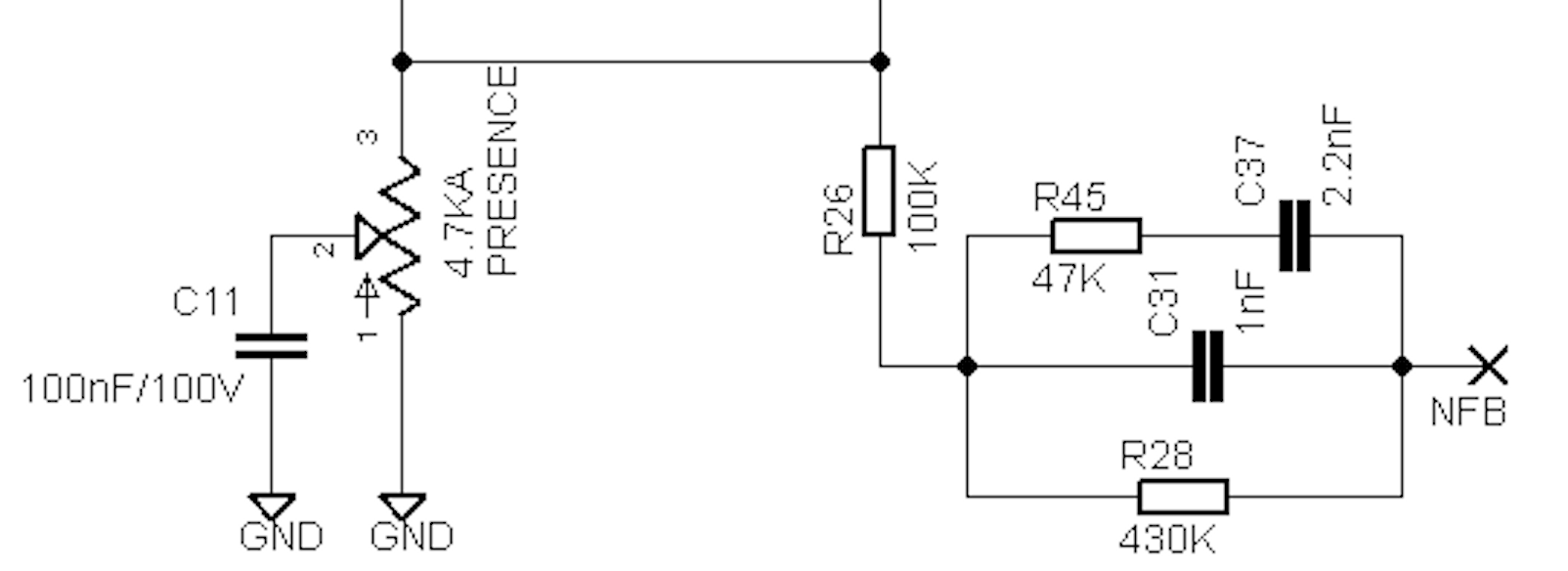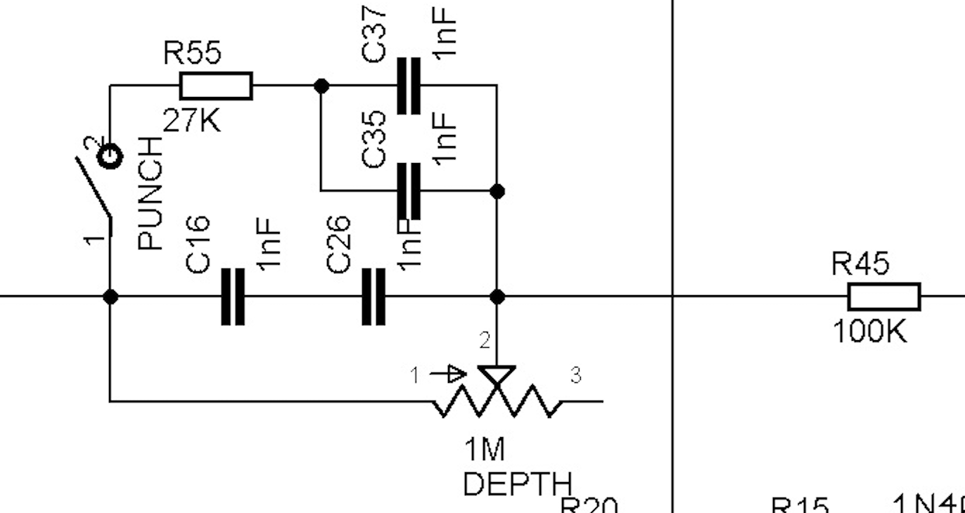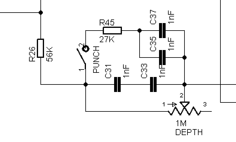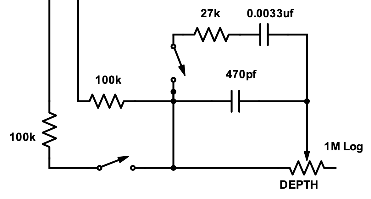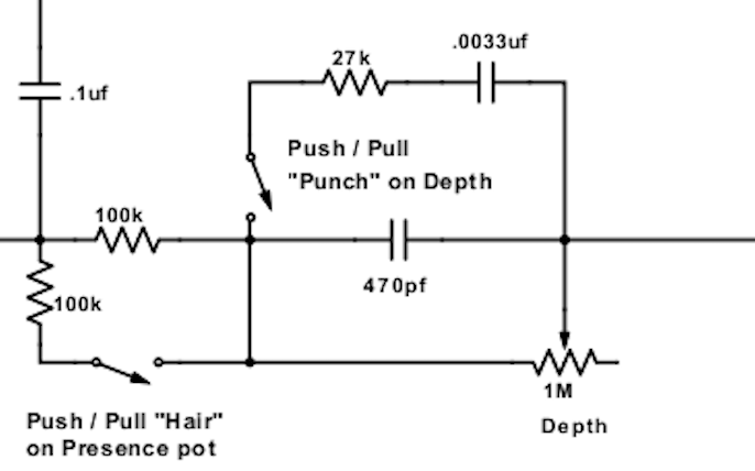 I was playing with this circuit and found that moving the series resistor in and out of the circuit makes a surprisingly large difference and not simply in the "lower frequencies but with more/less effect" kind of way. With it in the circuit, frequencies higher than you would normally hear with a 5.2nF depth circuit seem to be boosted.