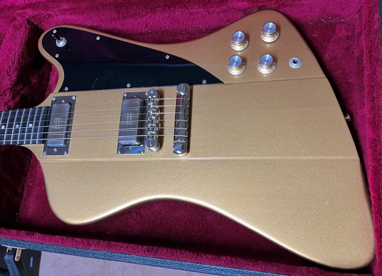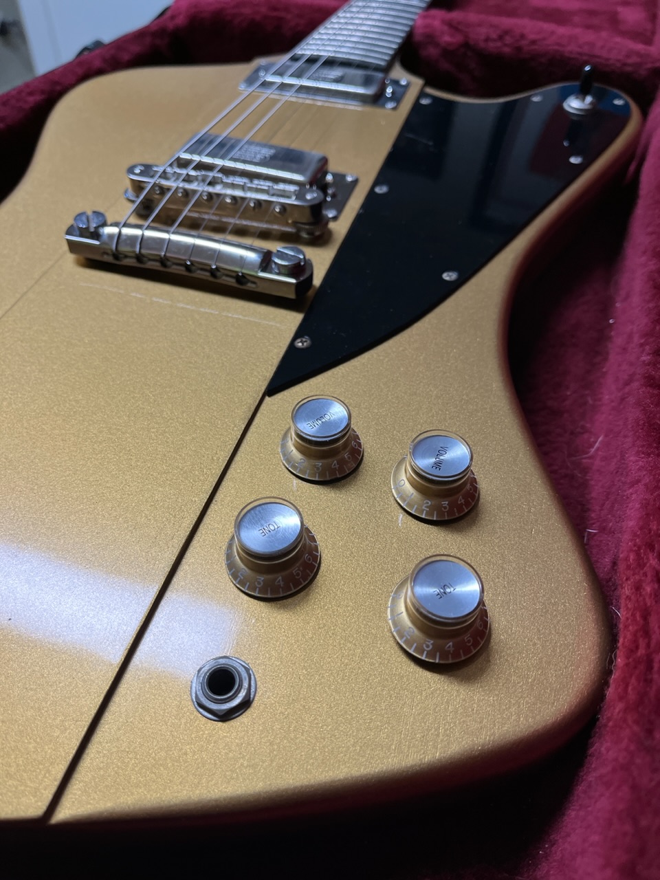 A couple things that make this particular  357 unique and different, are the fact that it actually has  Firebird pick ups in it! The vast majority of the H357’s had humbuckers in them. The second run of 357’s that Marv did just before he retired, had a wide variety of pick up, variations, mainly because they were all custom ordered for the most part. The other thing that really sets this one a part is the gold finish! I have never seen another H357 finished in gold. Maybe someone else out there has?