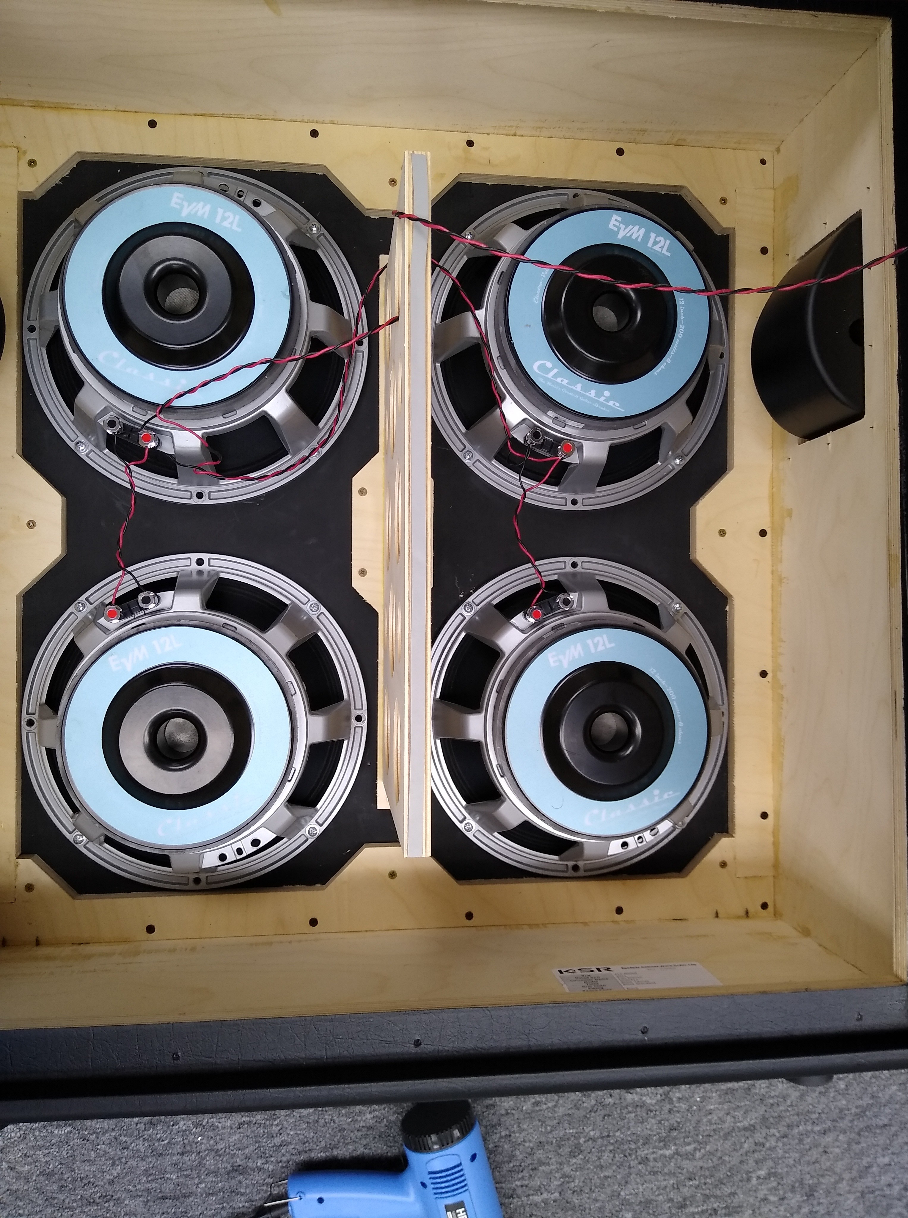 - Bugera 4x12 cab with 2 Celestion Vintage 30’s on top and 2 Celestion G12K100’s on the bottom
