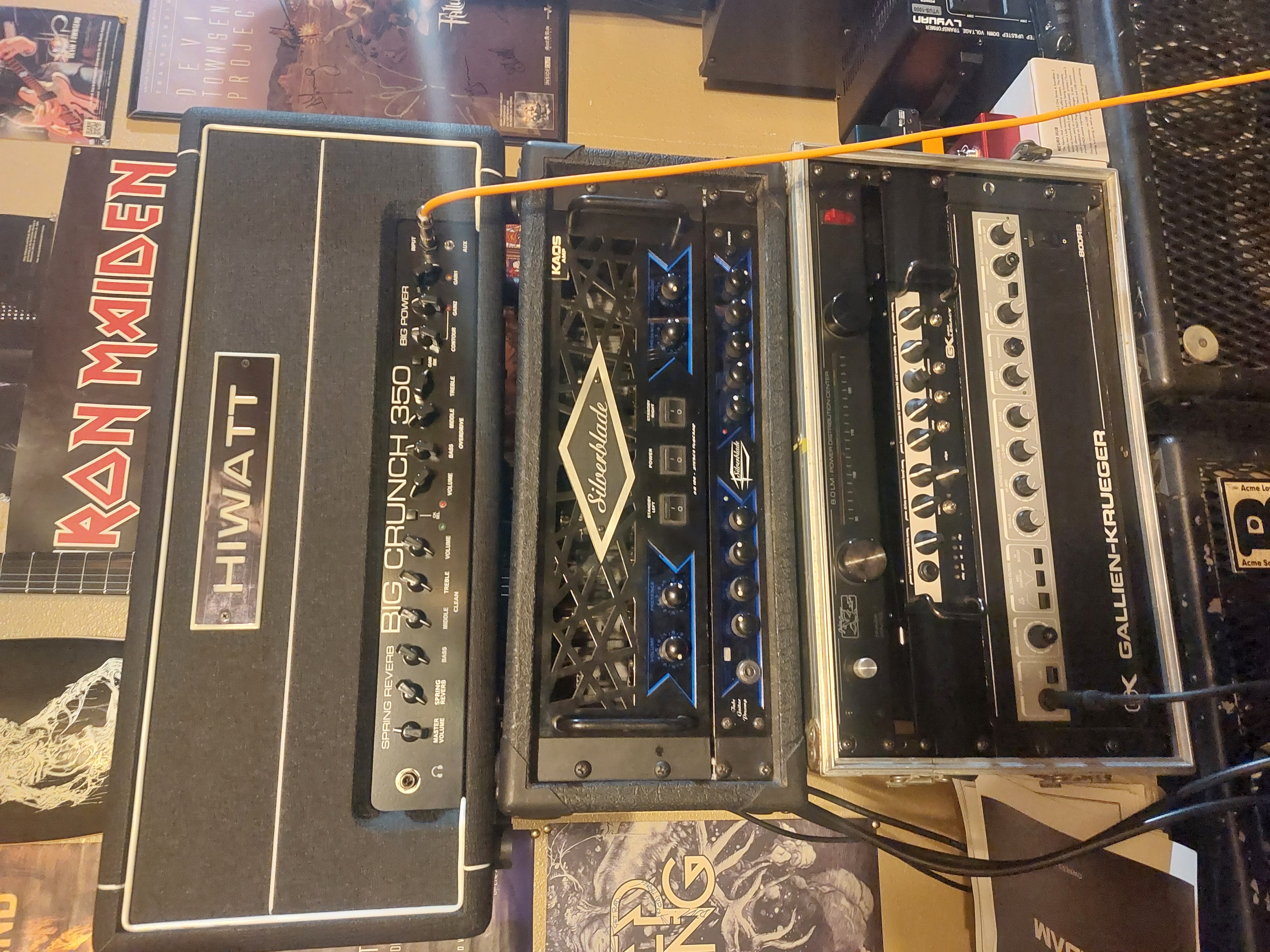 I finally get over to Juggernaut Mikes house to test/try out the new amps. The Silverblade is first on the docket, because it's 220 volts and I had acquired a step up/down transformer for shits and giggles. I remember wanting one of these when they first popped up on this forum via Moltenmetalburn, a member Mike and myself met via and old bro from my trash days in the 80s. It was one of those WTF moments when we are all sitting at a table having dinner and he mentioned he was on rigtalk, and Mike and myself nearly shit ourselves laughing when we told him we were too. But I digress...the Silverblade rig kicked ass. 2x100 watt power section and a pretty good preamp. This is not my clip, but it's how I acquired it. Sounds way better the way Mike dialed it in during our test session. Dude knows how to tweak an amp. It wound up in the road case with my ultralead.