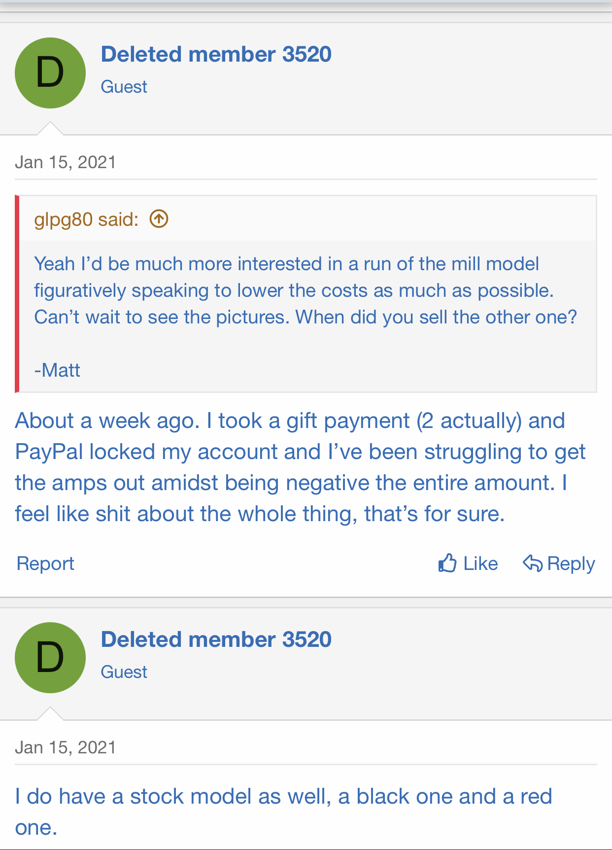 You told me your mother died. Now she is alive? That was your final excuse for not shipping the amp you were fully paid for after you said it was shipped time and time again. Your shit show keeps getting better and better. I wonder how many more people will pop up out of the wood work with issues. In the midst of all of this going on, you had time to hunt down 4 Cameron's. It is abundantly clear you can't tell the truth and in all honesty sounds like you have a drinking and or drug problem along with your gear addiction.can’t explain? I CHOOSE not to explain, it won’t change a damn thing, and I prefer to not throw my personal life online. How about my mother spent most of January in the hospital, doesn’t have a ton of time, was critical. January was also the month the VA caught my failing liver. All three of my daughters were removed from school for Covid and have to do homeschool. Excuses? Maybe to some, but when my mom hits critical, that’s my focus. It’s sucks if I really dropped the ball here, no doubt. But immediately I’m a criminal and my credibility means nothing. I had a number of sales over the past two month, probably 12-13, everyone got amp or money. Mrbush just made an account here, contacted me, and I’m working on it. I wasnt even aware this was happening, I thought I had squared everyone away.