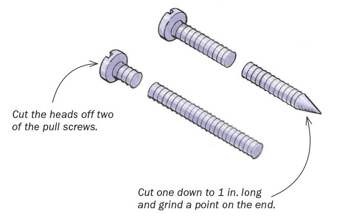 Make 4 assembly bolts by cutting the head off each bolt then sharpen the cut ends into a conical point like the pic below. The video below is the best I could find to demonstrate the process. You don't need a bench grinder. Just chick the bolt straight into a drill and use a hand metal file. You can also buy cone point bolts, you just have to make sure it's the same size & thread of the chassis nuts.