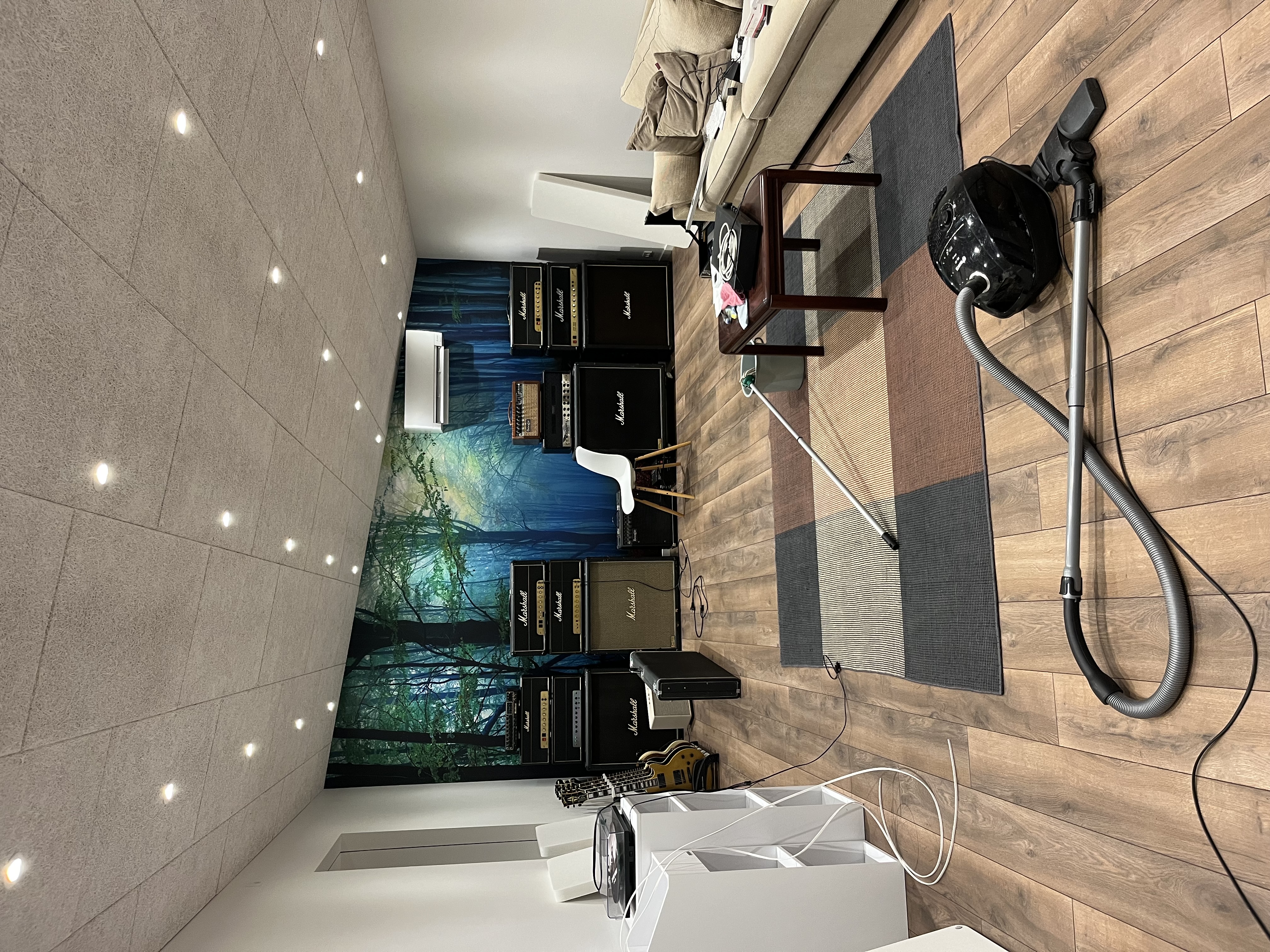 wow, that looks really nice. nice touch with the forest. what is that thing on the back wall hanging on the upper right, above the two right marshall cabs?