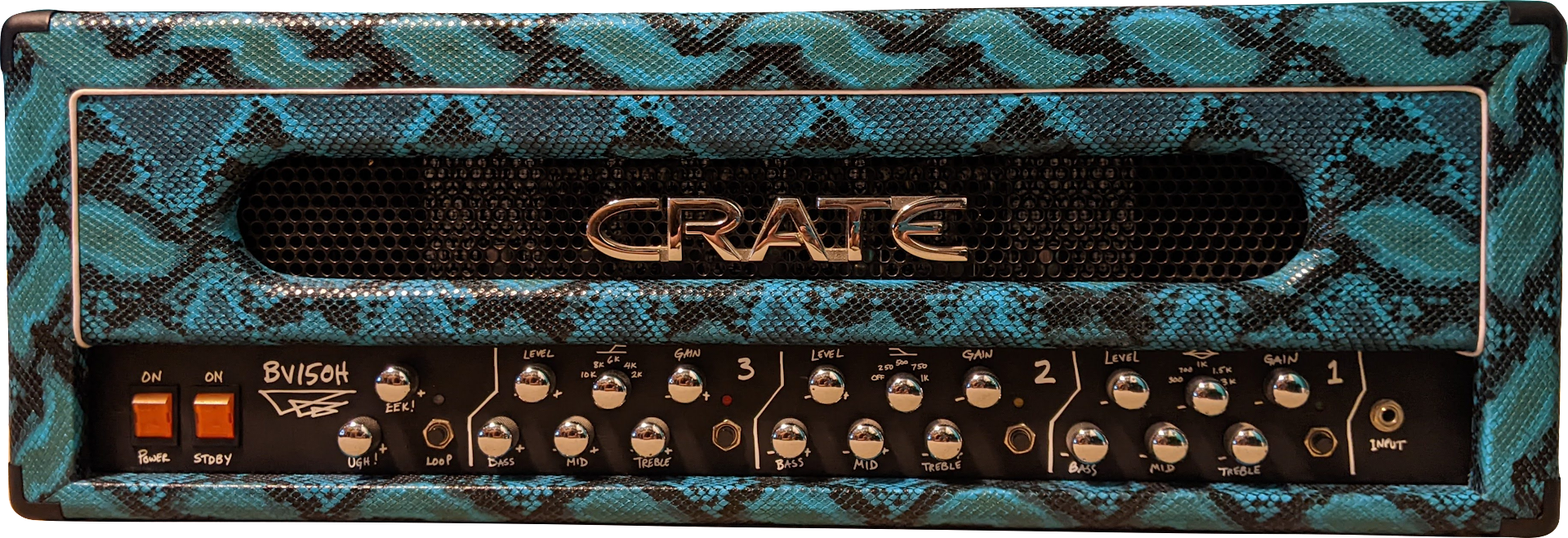 The tolex was looking pretty worn on my amp so it was time for a recover. I went for the so tacky it's good look and covered it with blue faux python skin. I also made and covered a front face to go over the grill. Being the amp is a Crate Blue Voodoo it seems rather fitting.