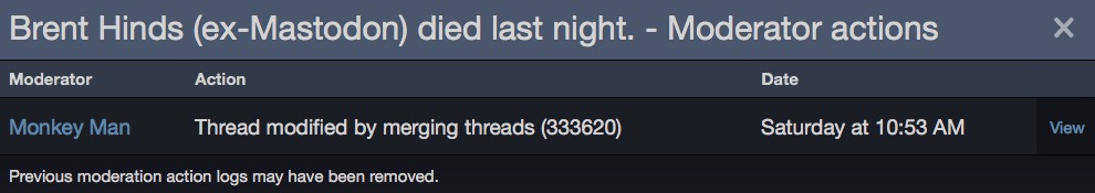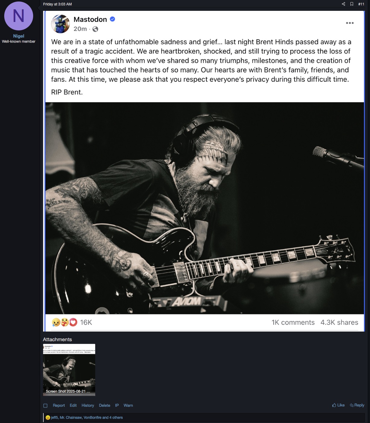 Nah, I made the post 17 mintues after Mastdon posted on FB. It’s the big one in the main forum. Not gonna spam it up with this notice and take the focus off Brent. Just saying, that replacement is whack, especially without asking.Maybe it was merged so all Brent Hinds talk would be under one roof?