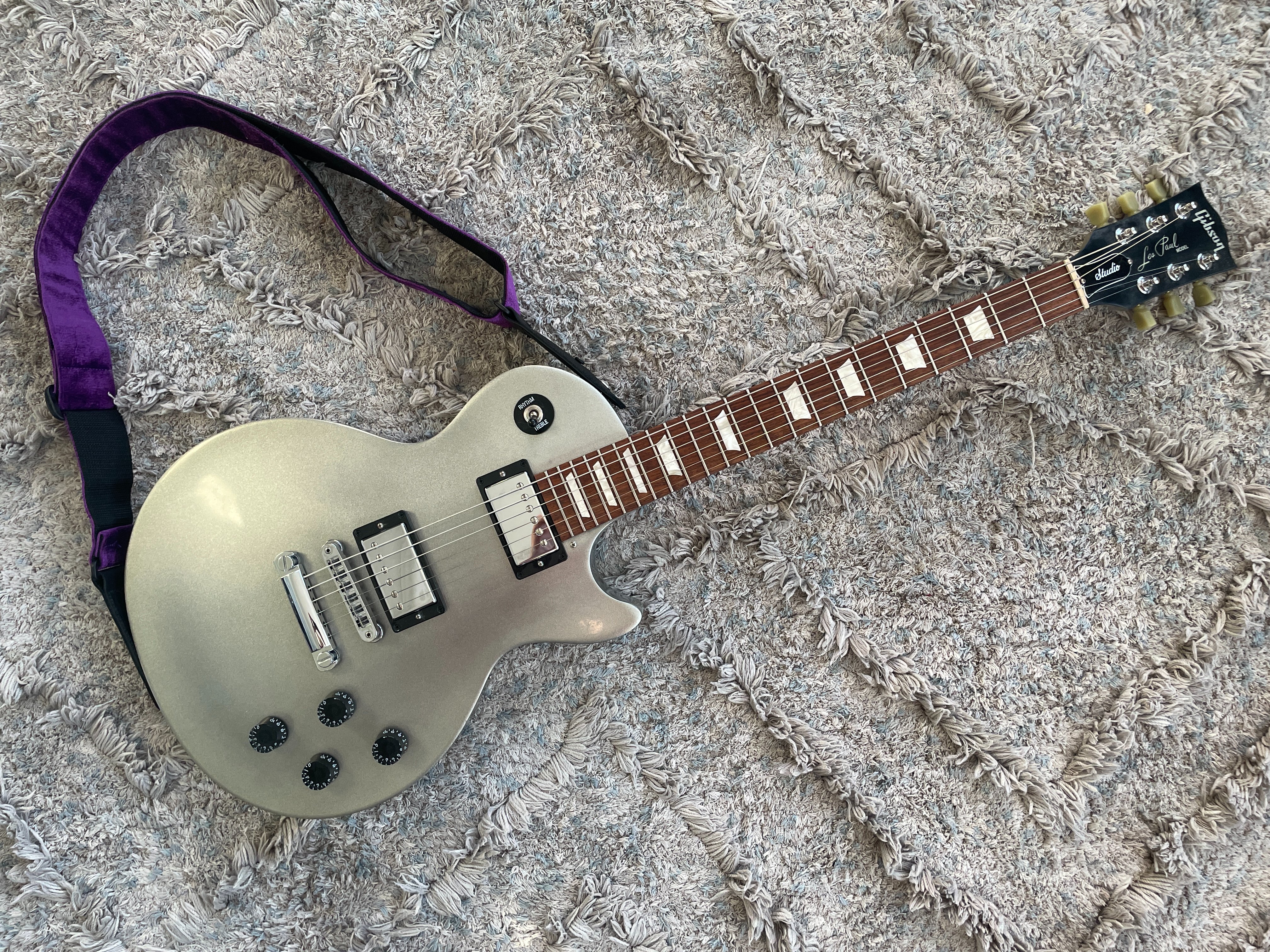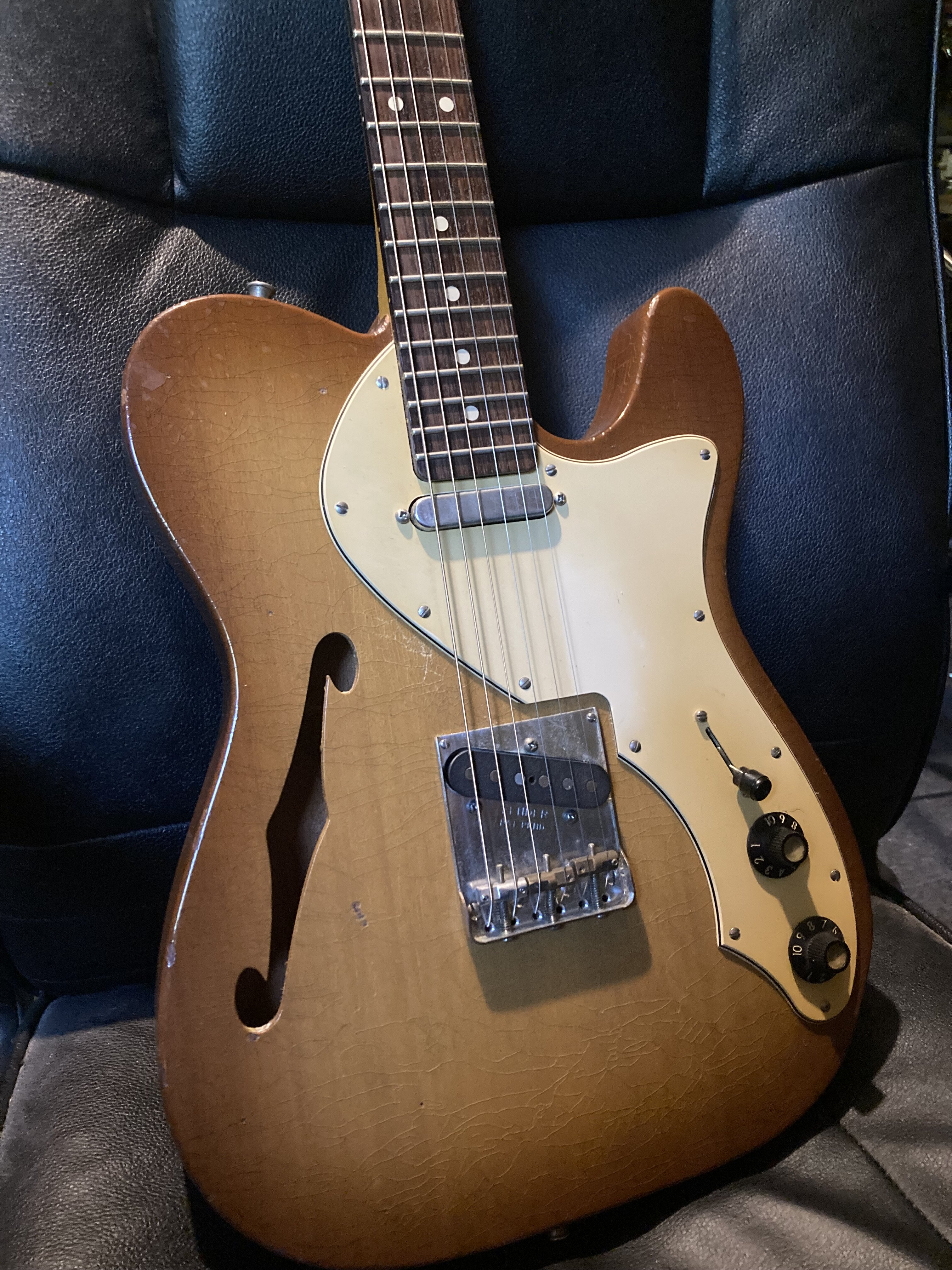 Some of you guys might have seen me post about a guitar maintenance class I attended in January. During weeks 3 and 4 (class is just once a week), I did fret work on this guitar. When I got it, the A string had dead frets (other frets were high). Knowing that I was attending this class, I was happy to bring this guitar in to learn about how to fix it. By the end of week 4, I'd filed/leveled, crowned, and polished all of the frets. We filed the 6th string nut slot to lower it a bit. We raised the bridge on the bass side (I got a heavy right hand and play 52s in drop D) which allows me to beat down a bit harder on the strings. Truss rod adjusted to get the neck straight. Fingerboard conditioned. Intonated. She played great, but holy fuck is she heavy.