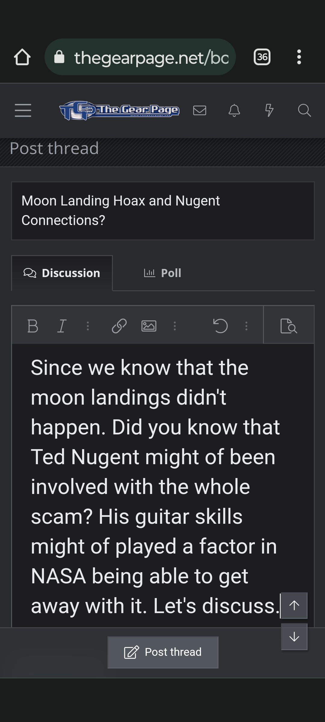 That's brilliant. If I could involve the moon landing hoax into it as well, it would go over like cat litter flavored ice cream.It will get taken down too quick.
